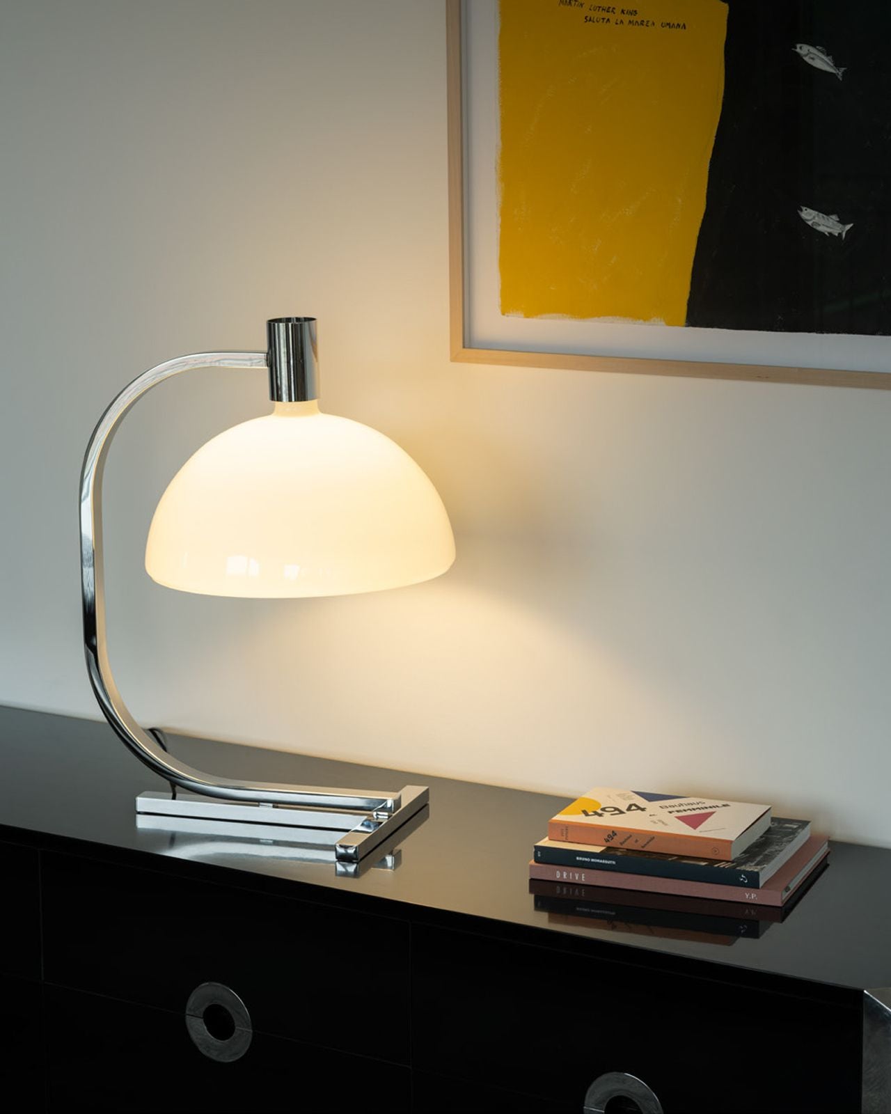 The chrome metal body of this lamp exemplifies trademark Italian elegance, featuring clean linear elements. Its design consists of a T-shaped base which is balanced by a round shade, providing a striking contrast to the frame's lines. This lamp seamlessly blends modern architecture with timeless sophistication.