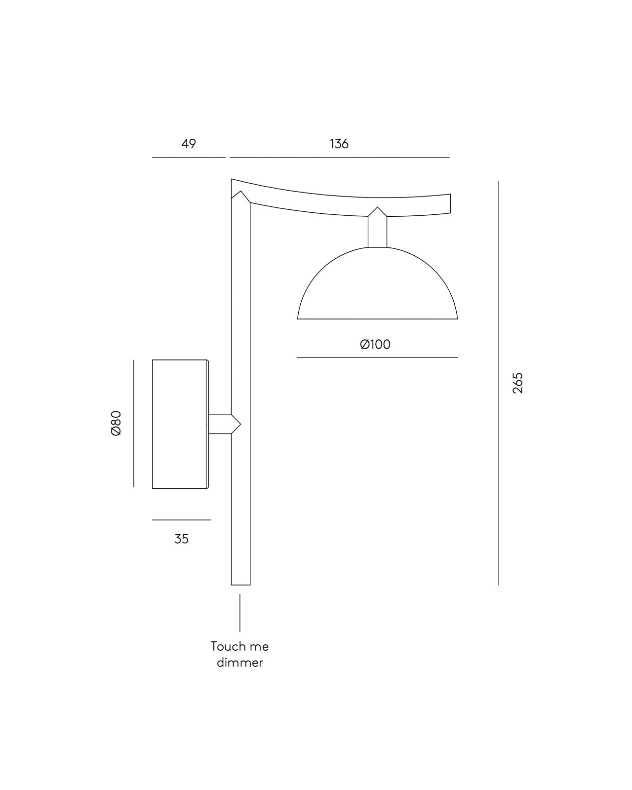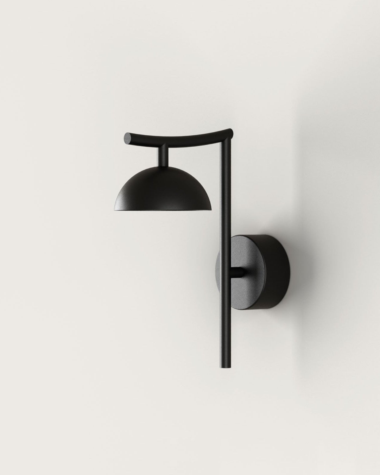 This minimal wall lamp features a small dome shade supported by a curved sleek arm, mounted on a circular backplate. Due to its matte black finish, this elegant lamp will become a striking design piece within any interior space such as a hallway or a bedroom. The ambient light spread from the shade will bring a cosy atmosphere to any home.