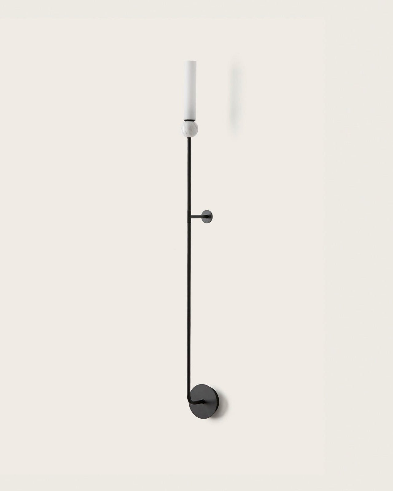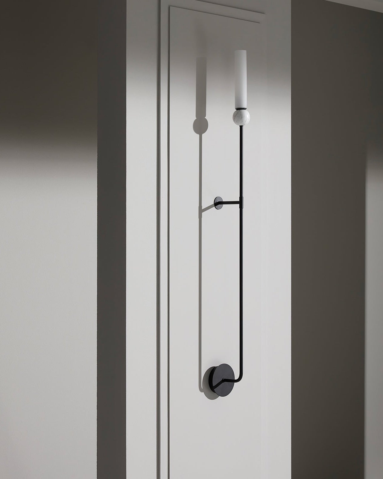 This minimalist design showcases a tubular form made from a combination of metal, marble, and opal glass. Its sleek opal shade appears to balance on the fitting's decorative marble sphere and houses a G9 LED.  Providing a soft warm glow the Minimalist Tubular Tall Wall Light is suited for hallways, living areas, and retail or office spaces. Available in Old Gold and Black Marble or Matte Black and White Marble this wall light has been designed to suit a range of styled interiors.