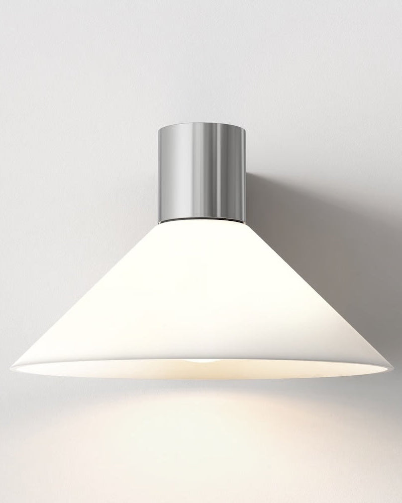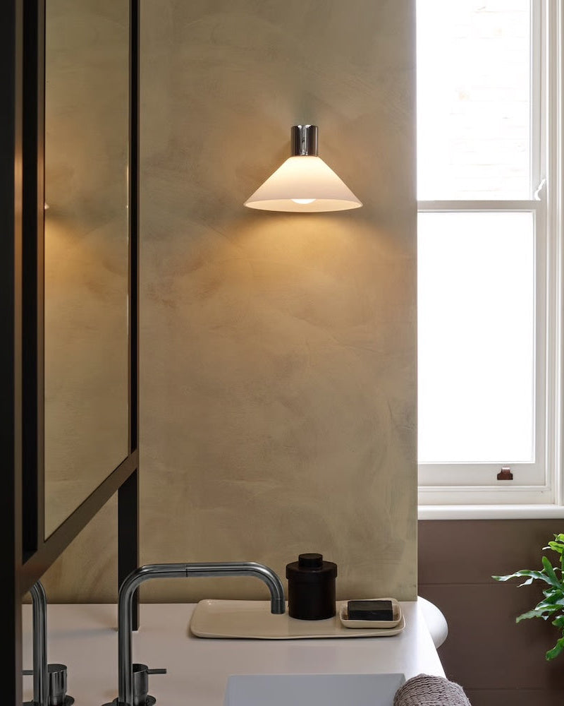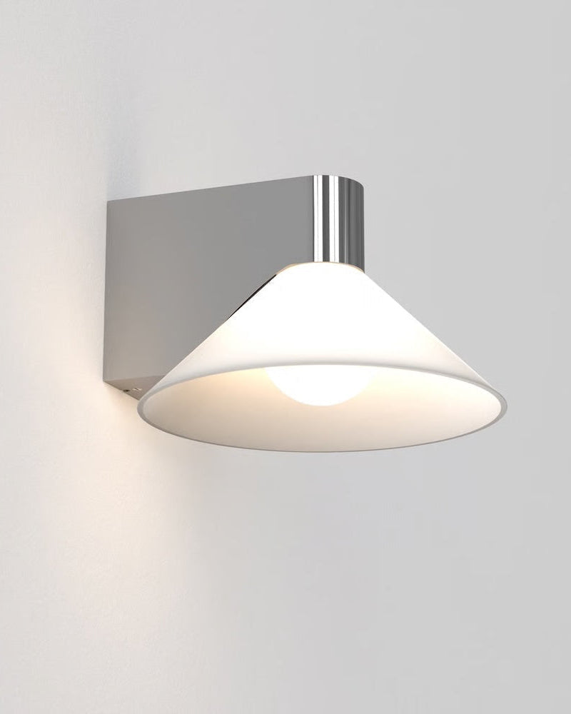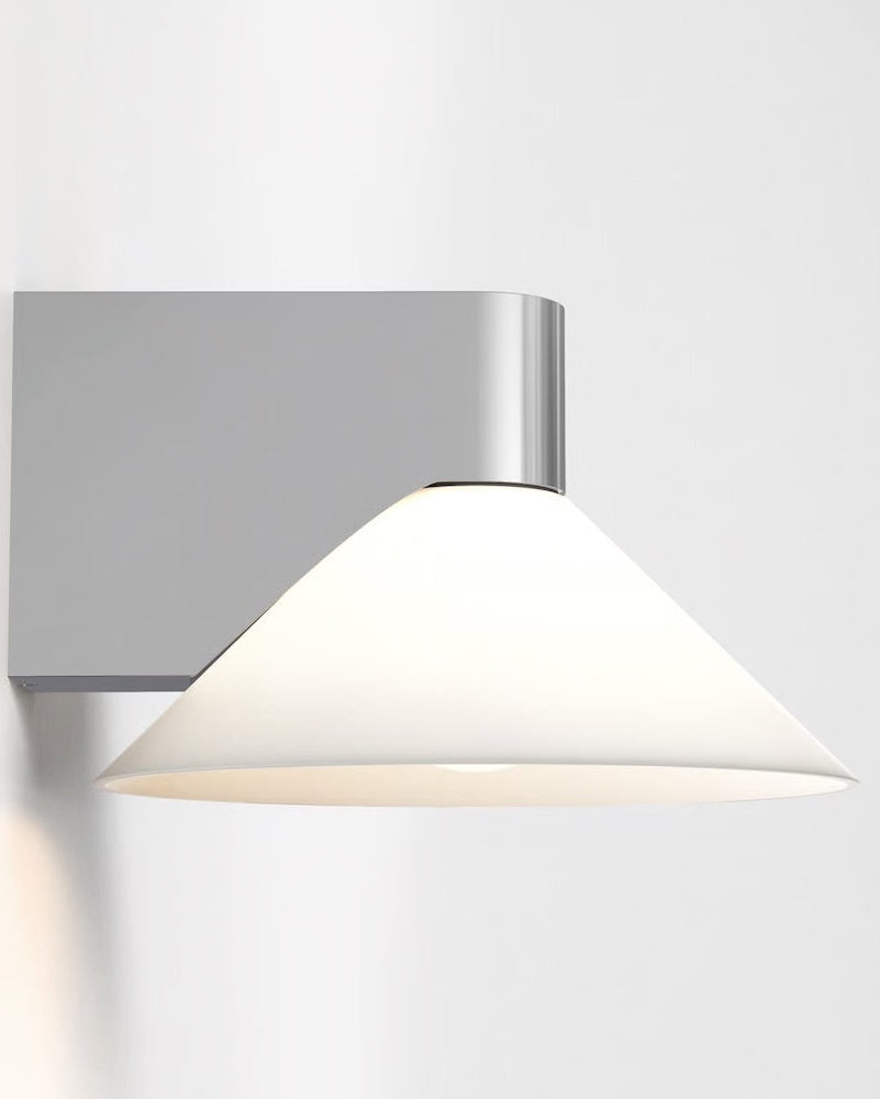 This geometric wall light will spread a soft downward light suited for vanities, hallways or beside the bed. The conical shape of the blown glass shade paired with a sleek zinc fixing delivers a sense of symmetrical elegance. The light is available in a matte black or polished chrome finish. Featured with an IP44 rating, this fixture is suitable for bathrooms.