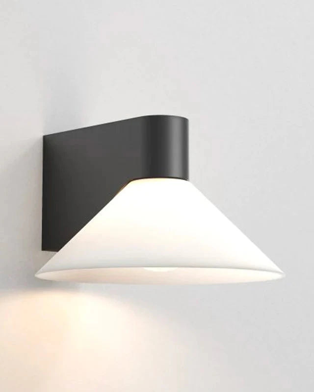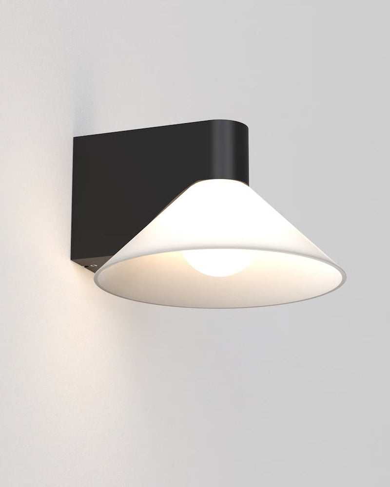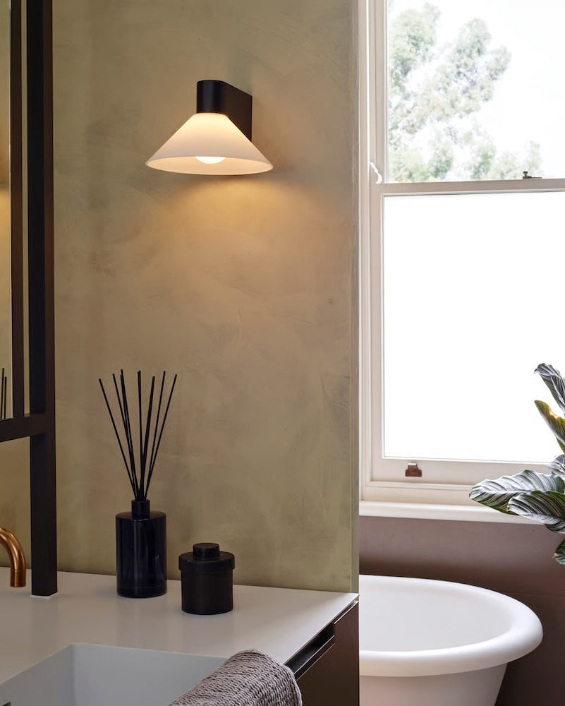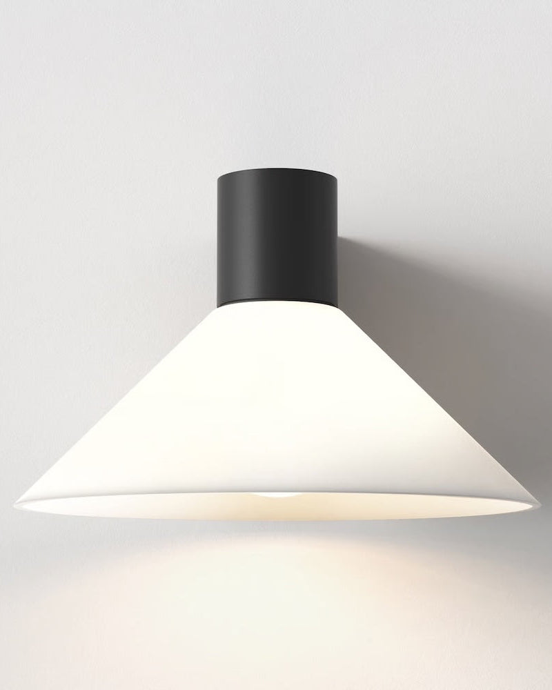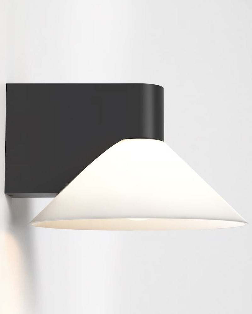 This geometric wall light will spread a soft downward light suited for vanities, hallways or beside the bed. The conical shape of the blown glass shade paired with a sleek zinc fixing delivers a sense of symmetrical elegance. The light is available in a matte black or polished chrome finish. Featured with an IP44 rating, this fixture is suitable for bathrooms.