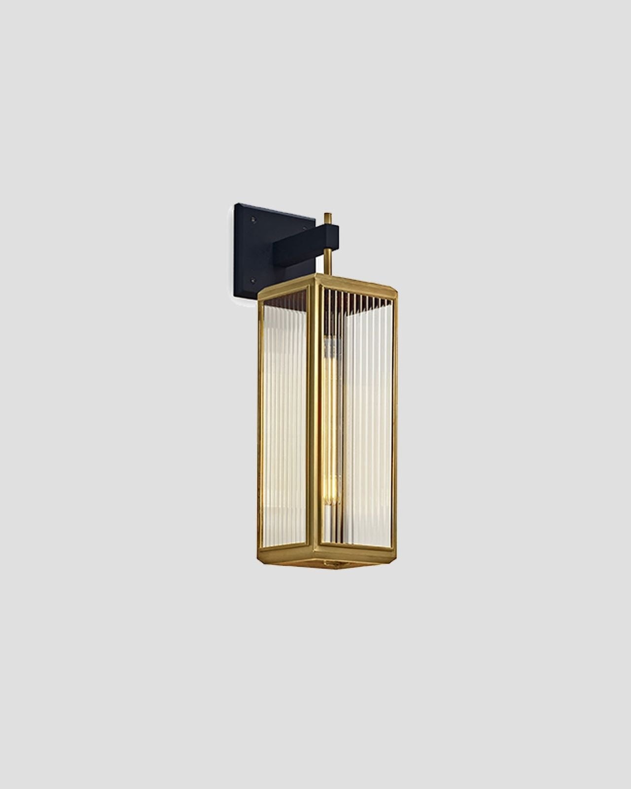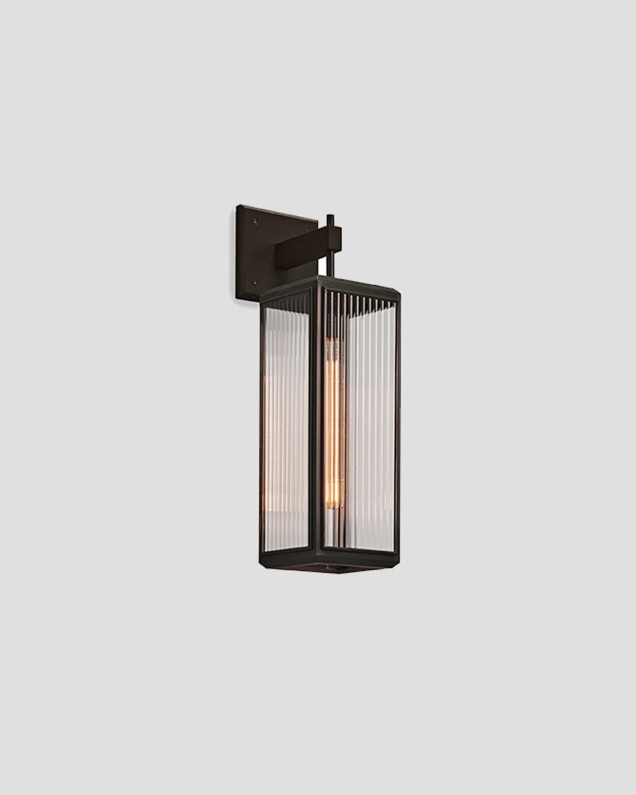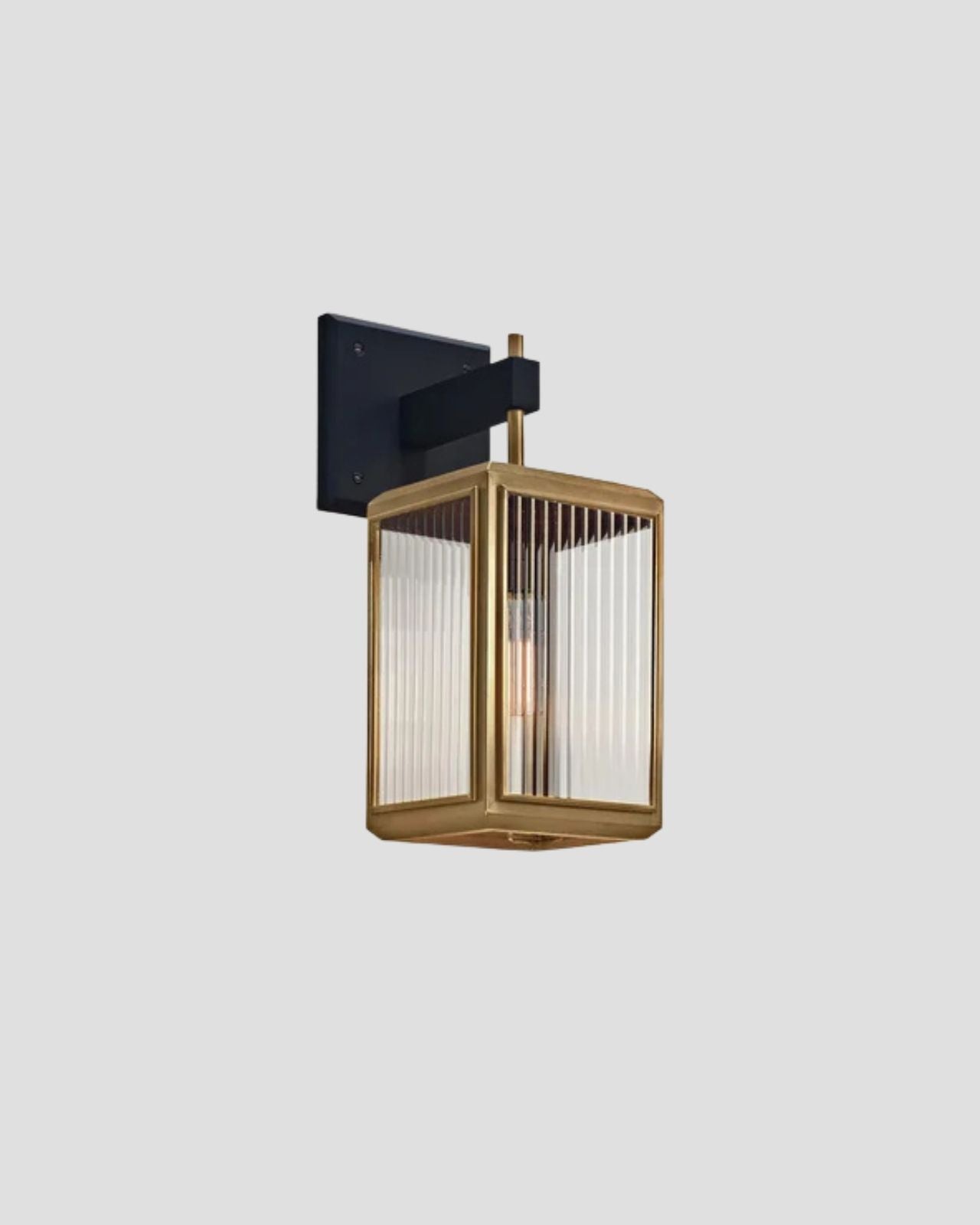 Timeless and luxurious, this wall light showcases a minimalist box lantern mounted on a compact backplate made from brass and aluminium with an antique brass or bronze finish. This fixture will naturally age and patina over time giving the design a traditional feel.  The wall lights reeded glass will refract and diffuse the light source while providing a more architectural aesthetic. Handmade in England and protected against light rain and sprayed water, this IP43-rated wall lamp is available in a short or tall version and will effortlessly enhance front entrances, patios, alleys or indoor spaces.