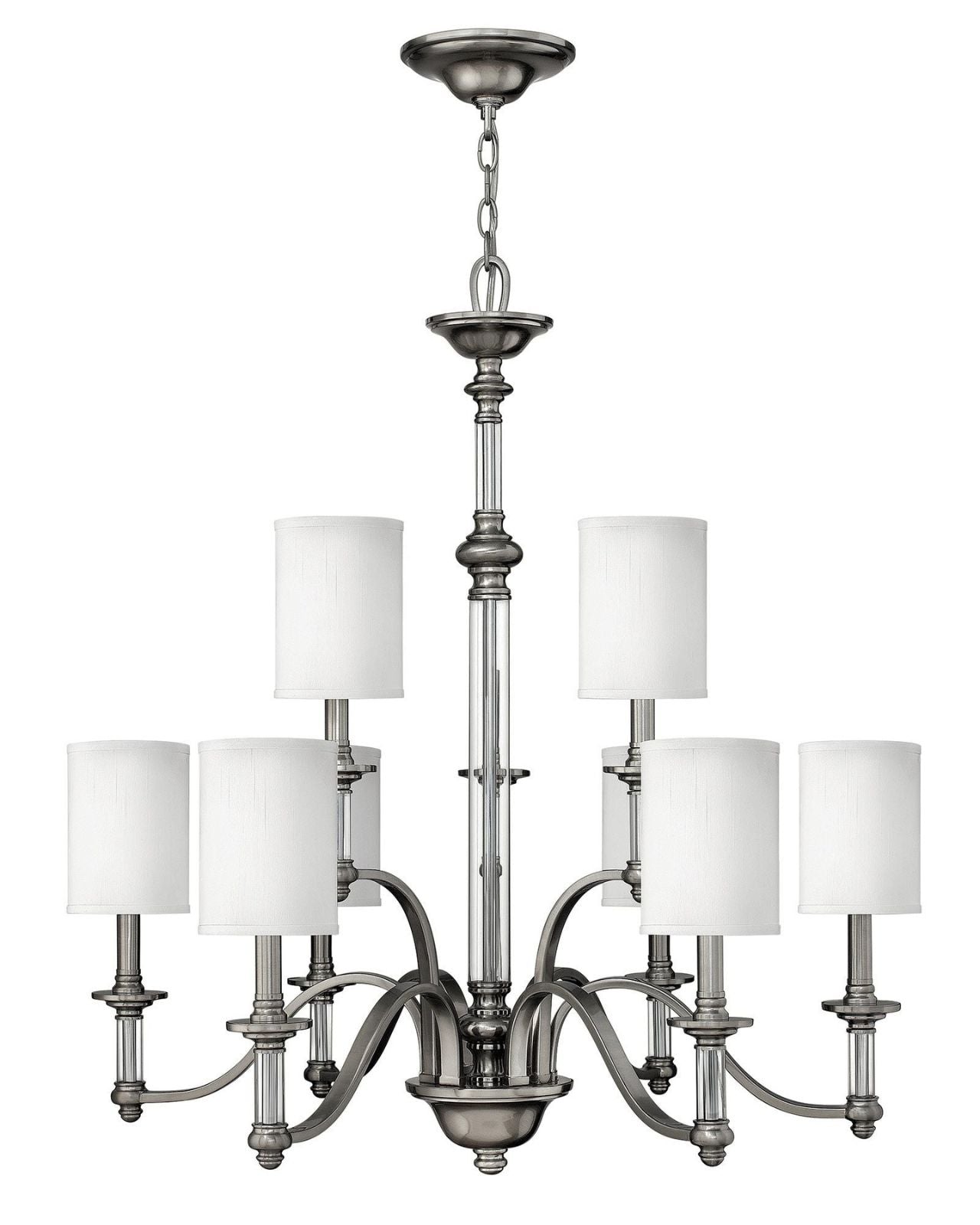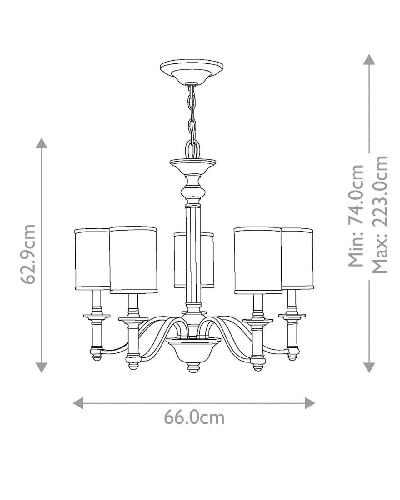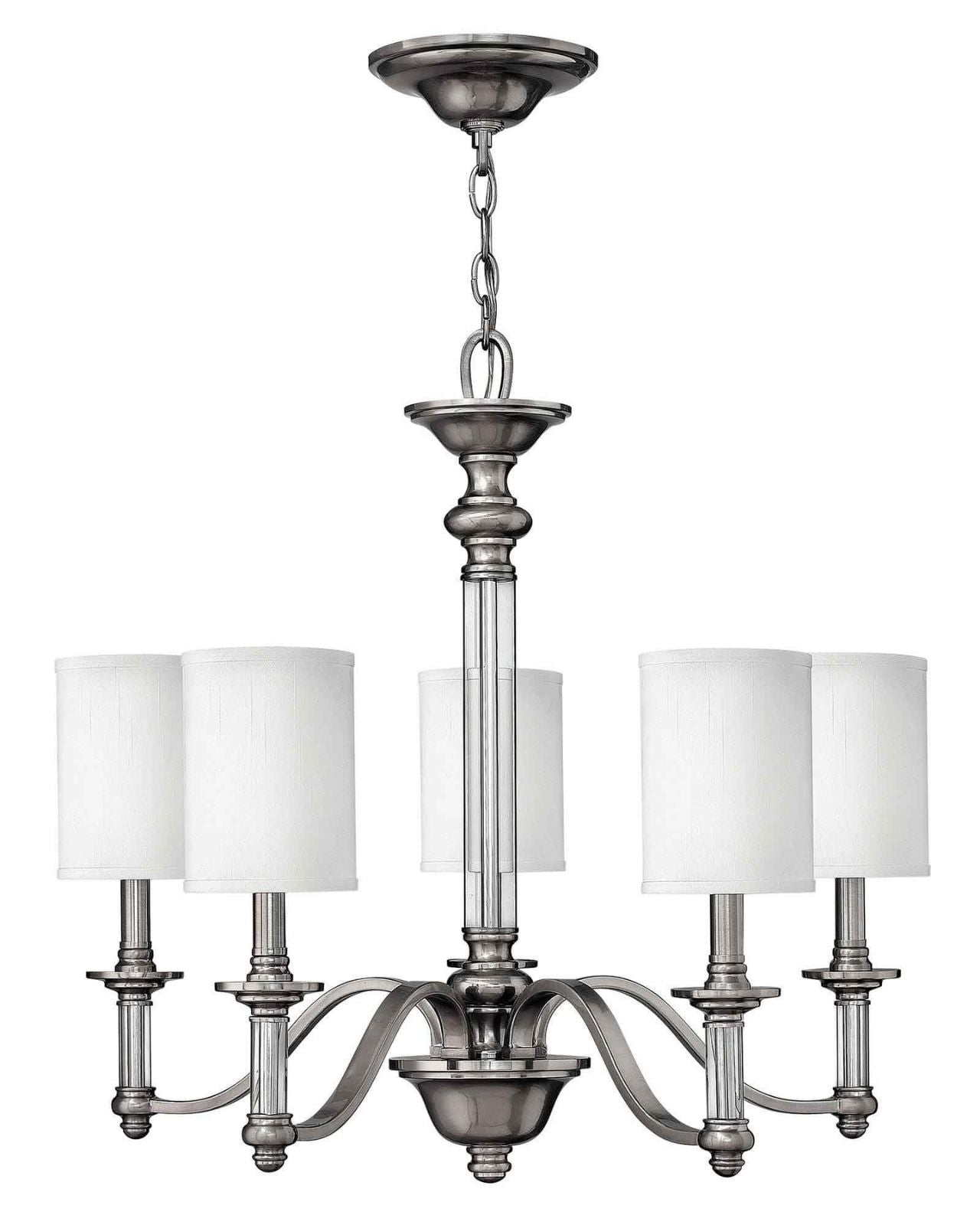 This traditional charming interior chandelier has an edge of modern luxury. Its unique design features clear glass columns combined with a brushed nickel finish and white fabric light shades. A sophisticated Hamptons light available in two sizes and suitable in any room.