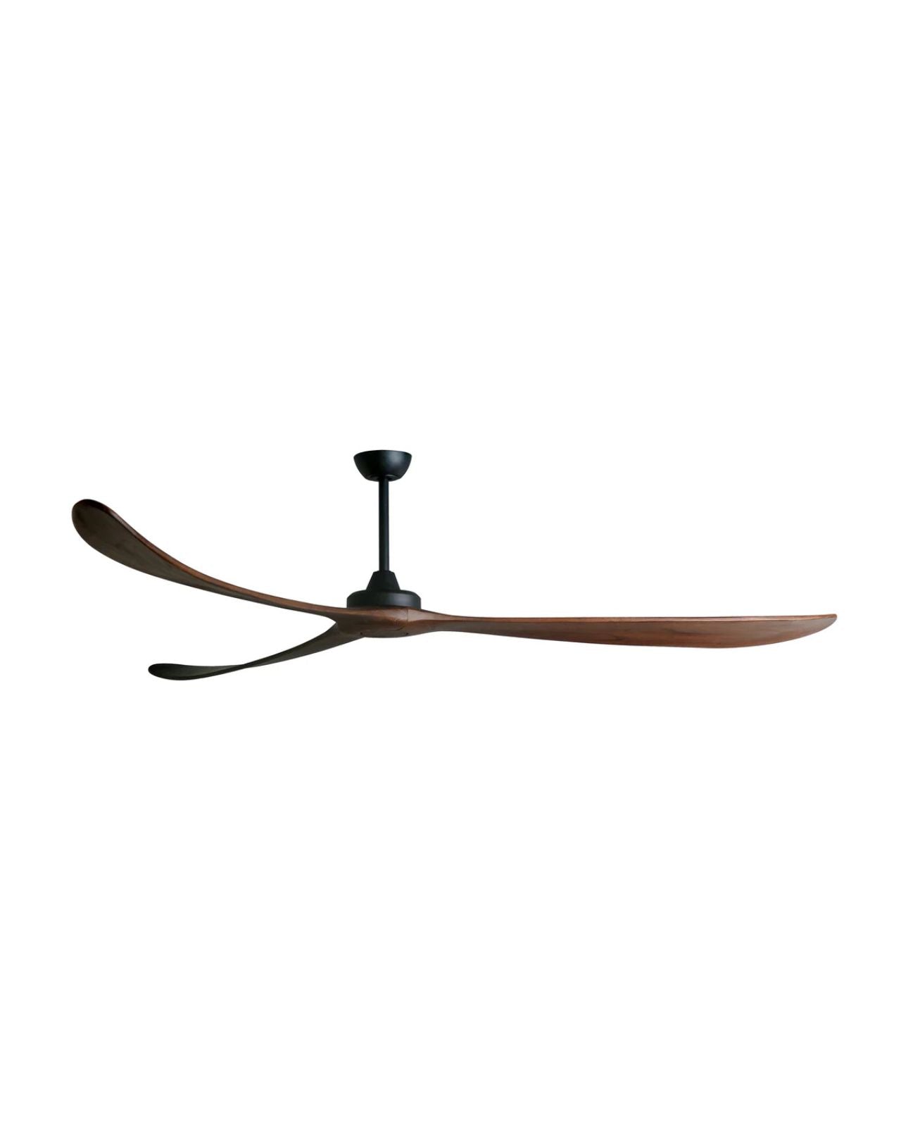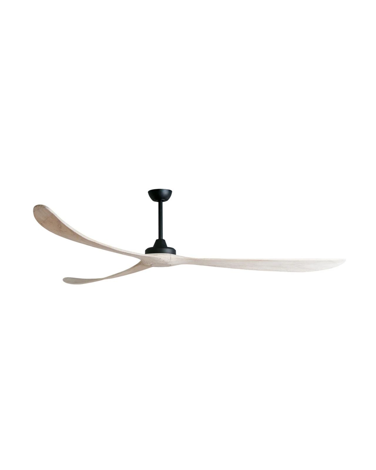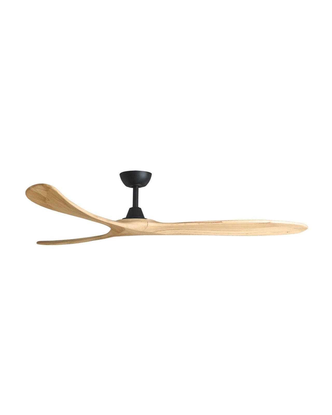 The Kirra DC ceiling fan in Black with Natural blades measures 100" (254 cm) in blade span, making a grand statement in large spaces. Moving 45,579 CMH on a high-speed of 78 RPMs and 18,230 CMH on low speed at 37 RPMs, the fan operates at a whisper-quiet sound with an impressive efficiency rating of 747 CMH/W on high speed and 2,279 CMH/W in low speed. Constructed of hand-finished timber blades, the fan features Paulownia timber, a lightweight, durable and renewable material. Remote control allows for 6 speed settings with summer/winter modes and fan-off timers, and can be installed in ceiling heights of 2.55m and above. Suitable for indoor and outdoor use.