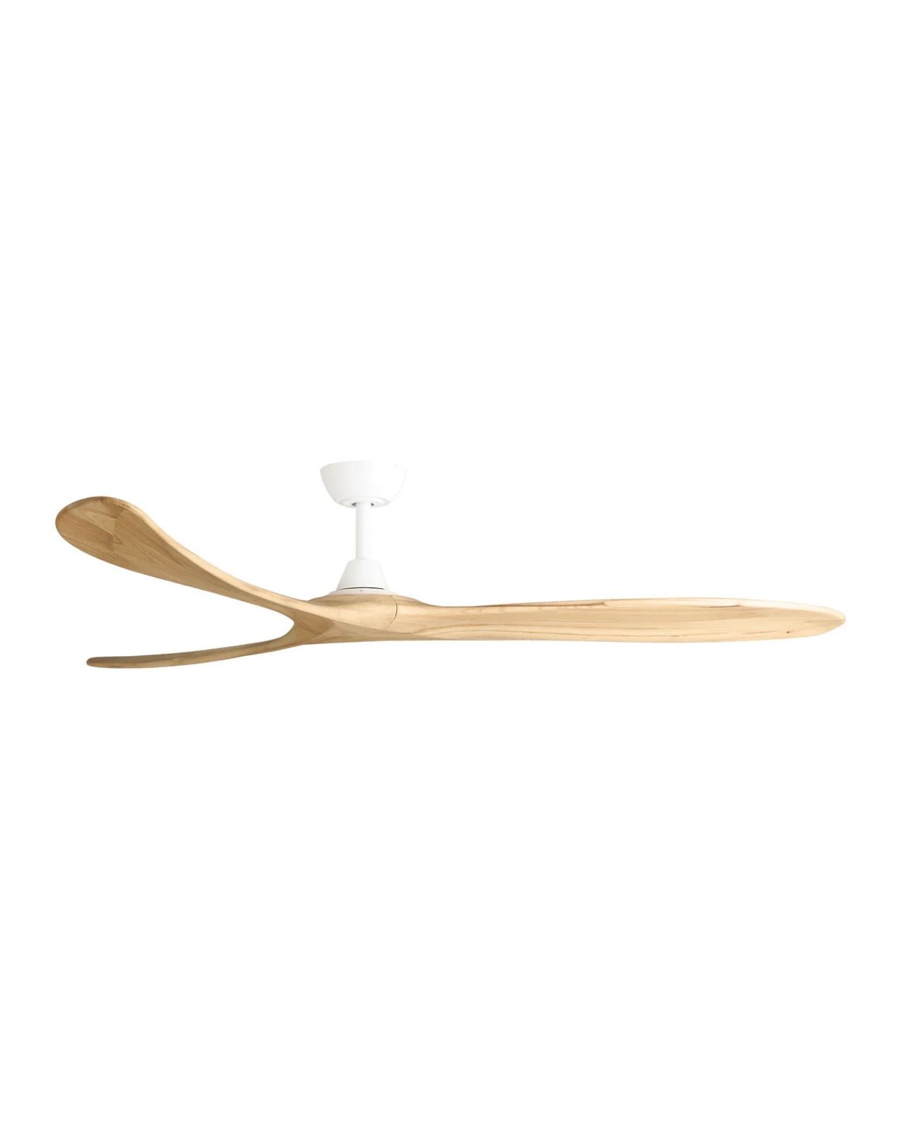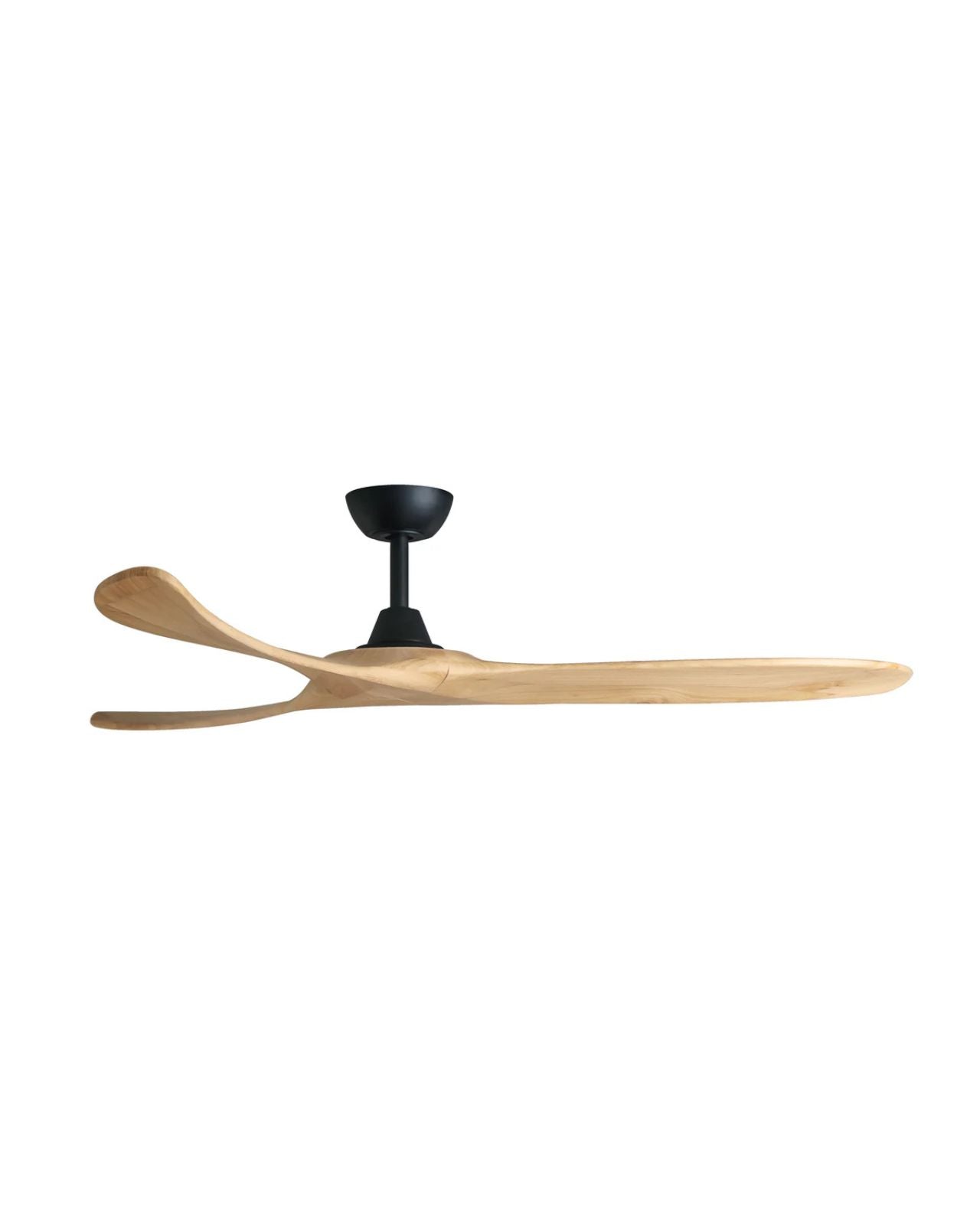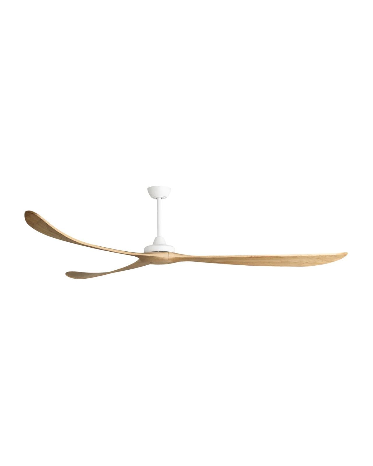 The Kirra DC ceiling fan in Black with Natural blades measures 100" (254 cm) in blade span, making a grand statement in large spaces. Moving 45,579 CMH on a high-speed of 78 RPMs and 18,230 CMH on low speed at 37 RPMs, the fan operates at a whisper-quiet sound with an impressive efficiency rating of 747 CMH/W on high speed and 2,279 CMH/W in low speed. Constructed of hand-finished timber blades, the fan features Paulownia timber, a lightweight, durable and renewable material. Remote control allows for 6 speed settings with summer/winter modes and fan-off timers, and can be installed in ceiling heights of 2.55m and above. Suitable for indoor and outdoor use.