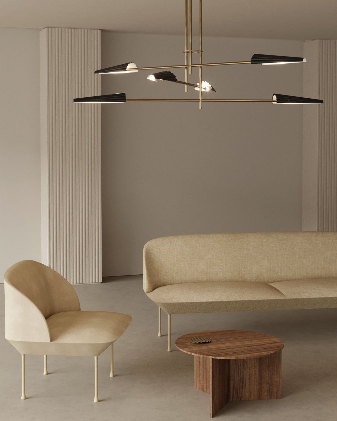 Modern living room with beige sofa, armchair, and wooden coffee table under a stylish chandelier.