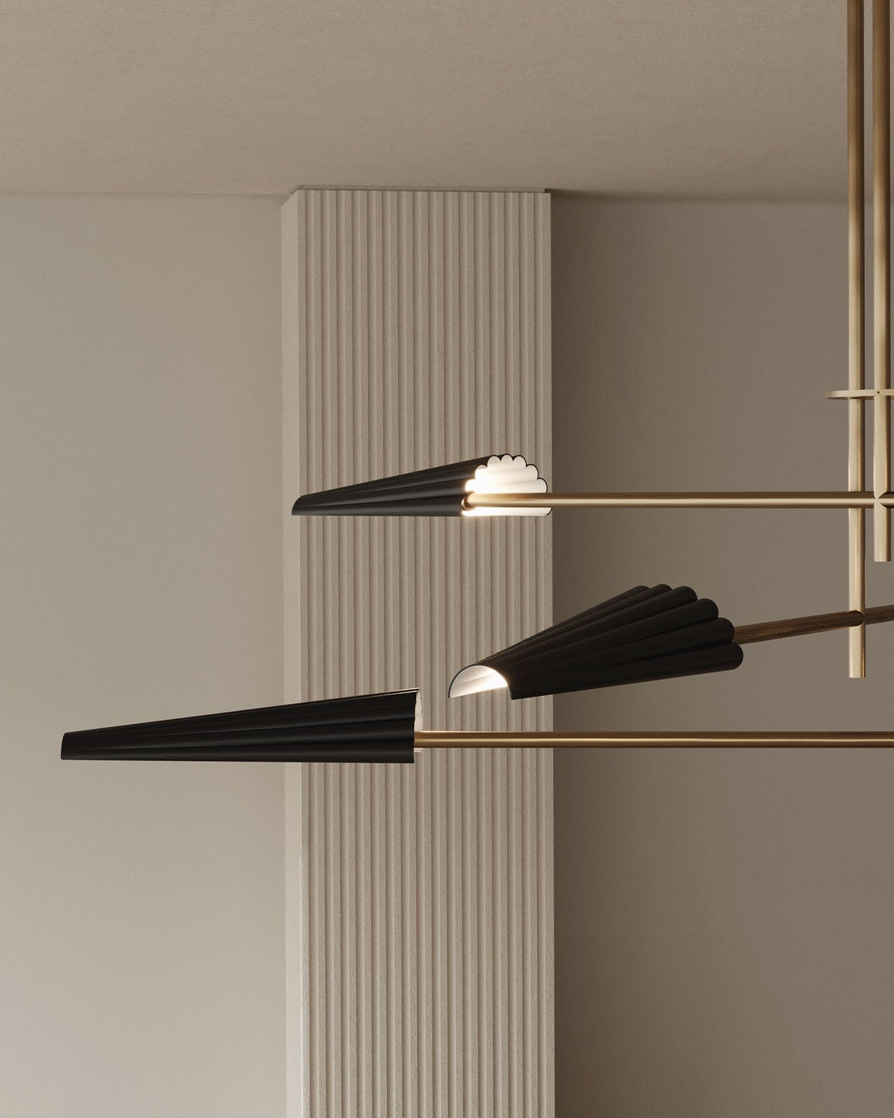 Modern chandelier with four light fixtures on a plain wall.