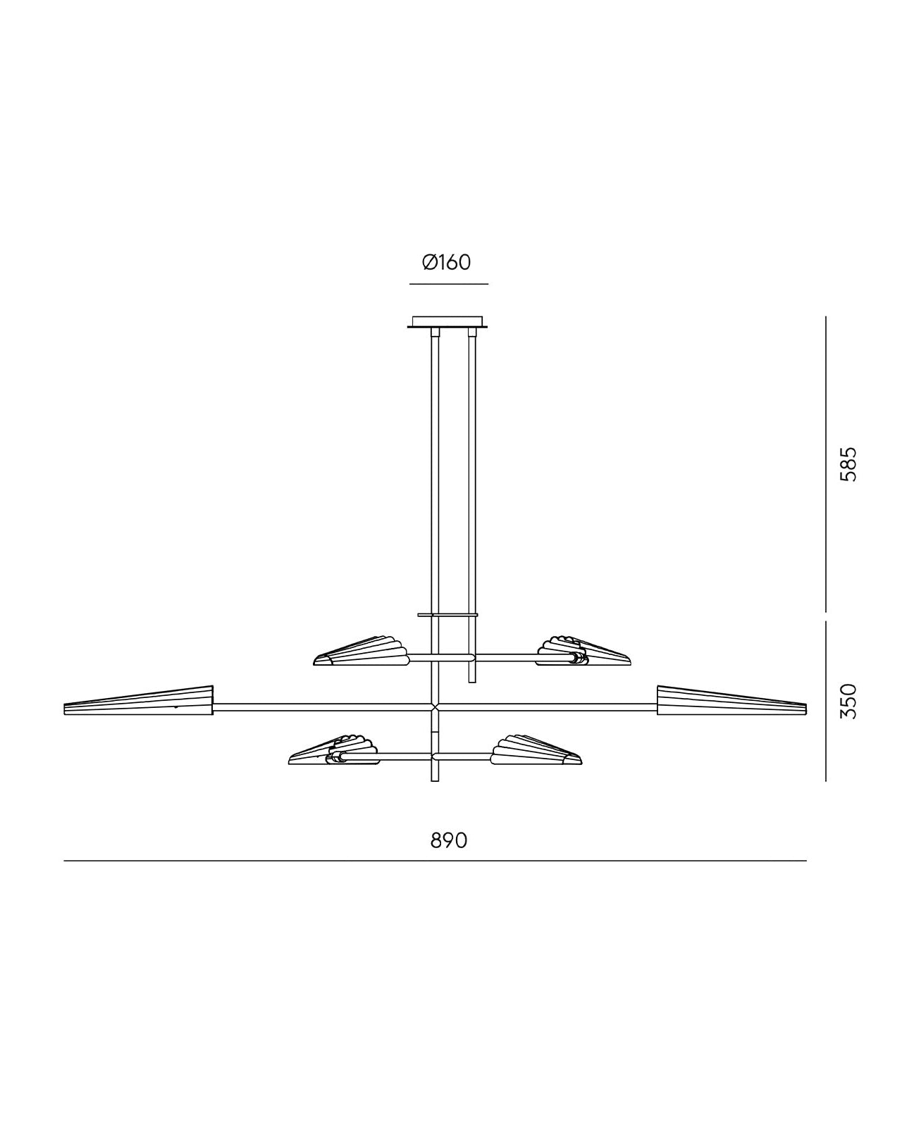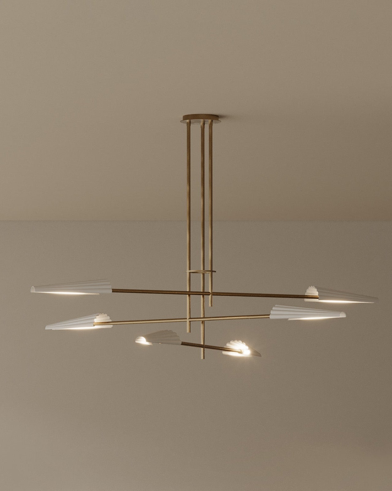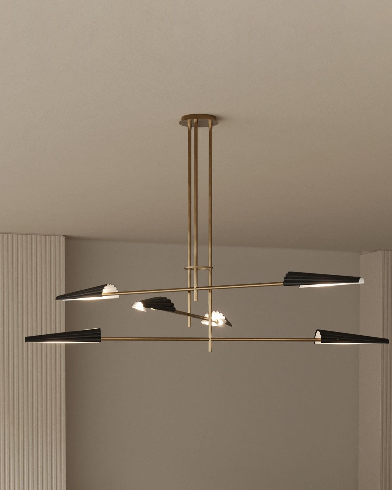 Made from high-quality steel, this elevated pendant light features six corrugated steel shades mounted on sleek modern angled opposite arms. This modern version of the chandelier has a unique design and is perfectly suited for living rooms, dining rooms, or any interior void space. Available in an Aged Gold or Matte Black and the shades are available in either a Matte Black or Matte White.