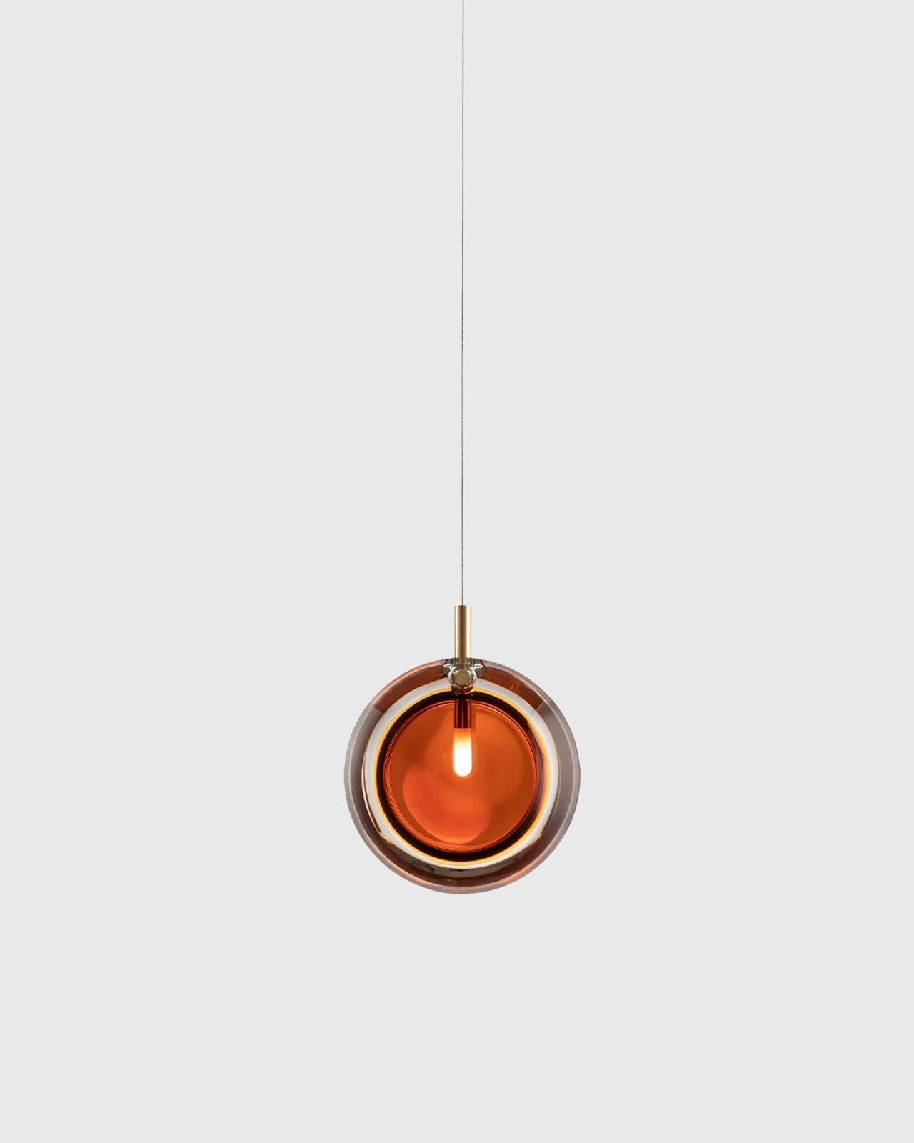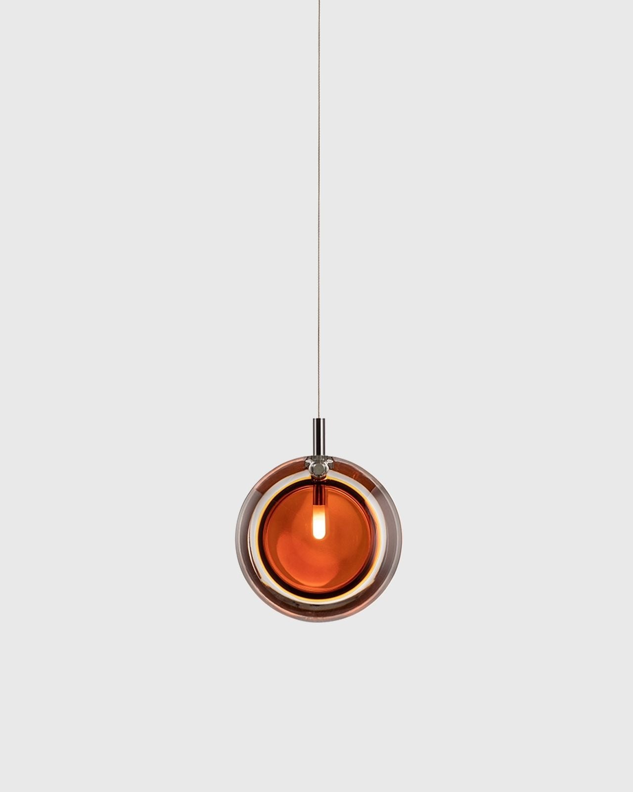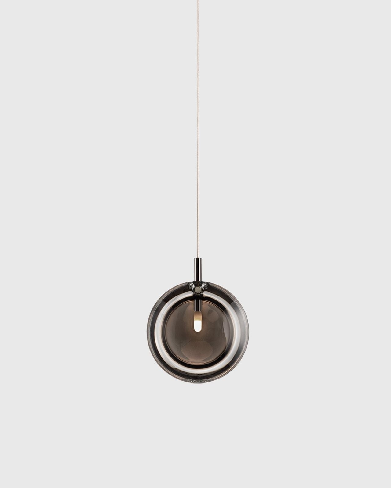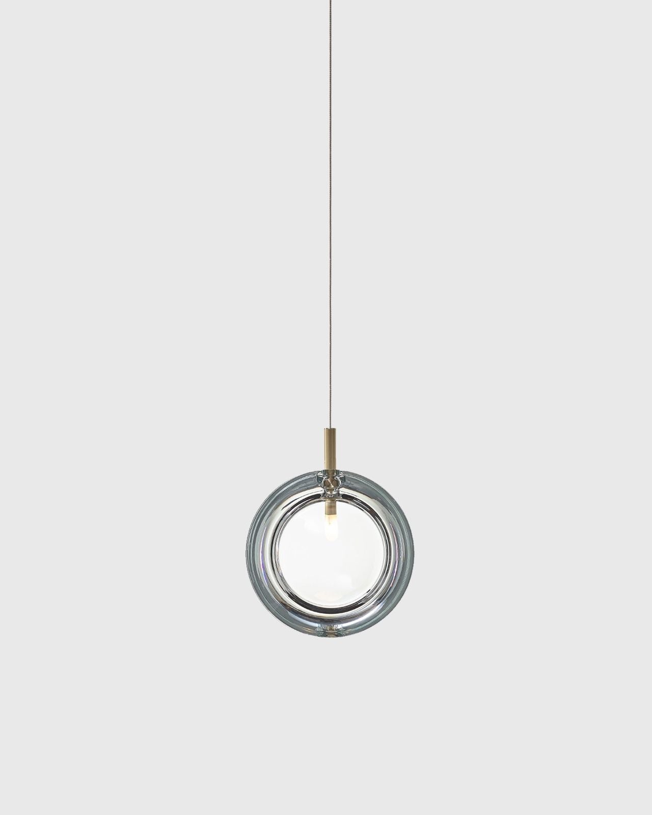 This pendant offers a versatile and artistic way to enhance your lighting arrangements with its dual lenses that effectively diffuse the light source for a gentle and glare-free glow. Each piece is skillfully crafted and hand-painted, available in five different glass hues ranging from amber to grey-blue, and can be used individually or in a group. The canopy adds a touch of elegance, with the option of either anthracite or brushed gold.