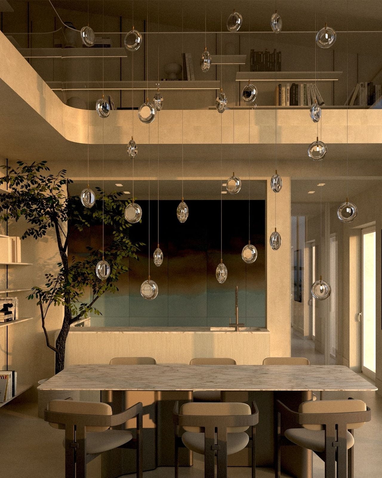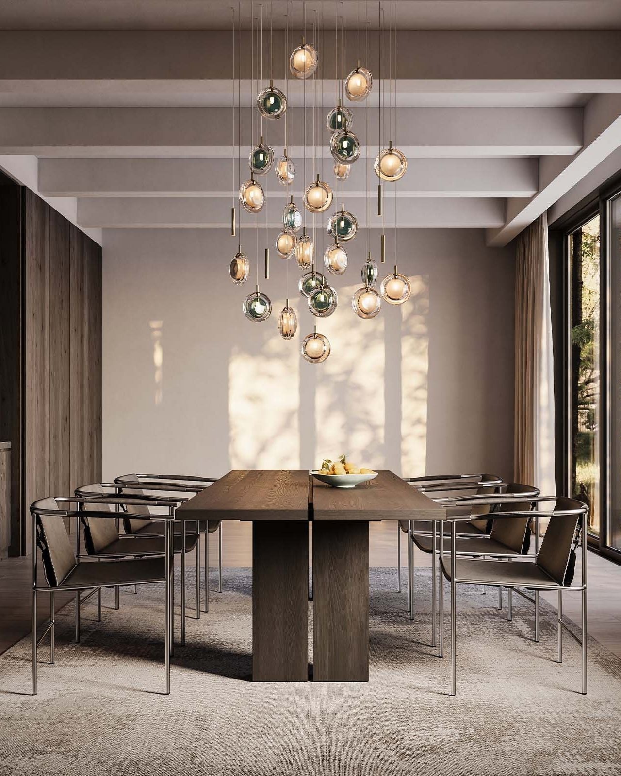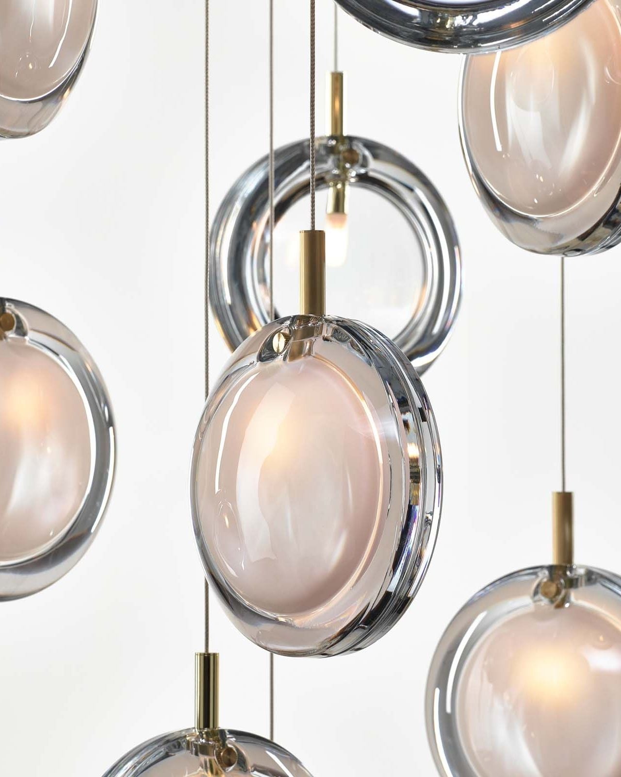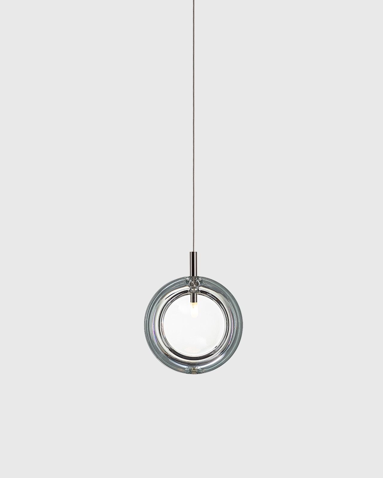 This pendant offers a versatile and artistic way to enhance your lighting arrangements with its dual lenses that effectively diffuse the light source for a gentle and glare-free glow. Each piece is skillfully crafted and hand-painted, available in five different glass hues ranging from amber to grey-blue, and can be used individually or in a group. The canopy adds a touch of elegance, with the option of either anthracite or brushed gold.