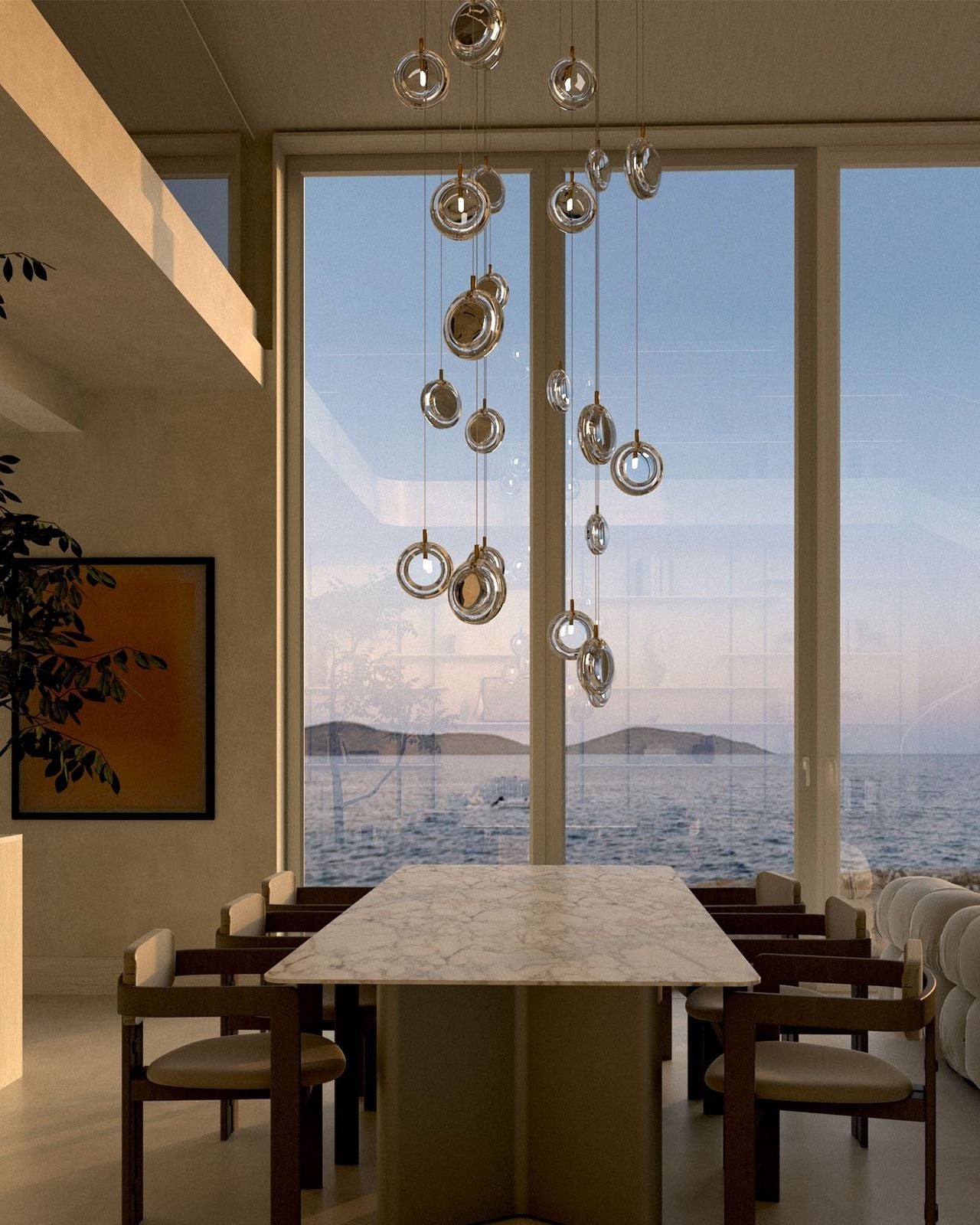 Refined Textured Glass Pendants small and large sizes displayed as clusters in a coastal restaurant