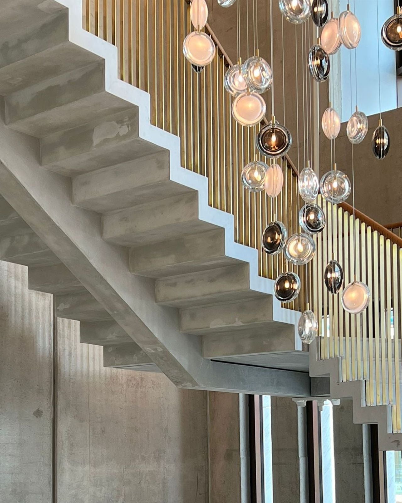 Frosted Tubular Brass Suspended Pendant  6 Light variant displayed in a modern stairwell
