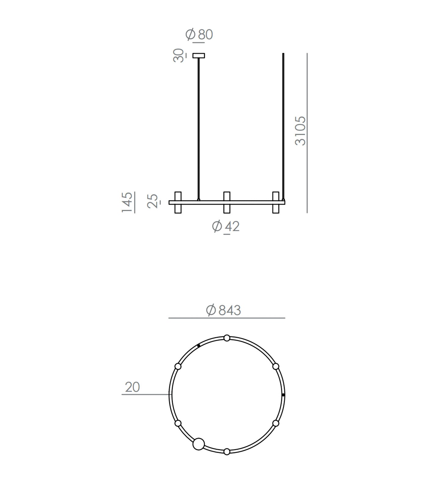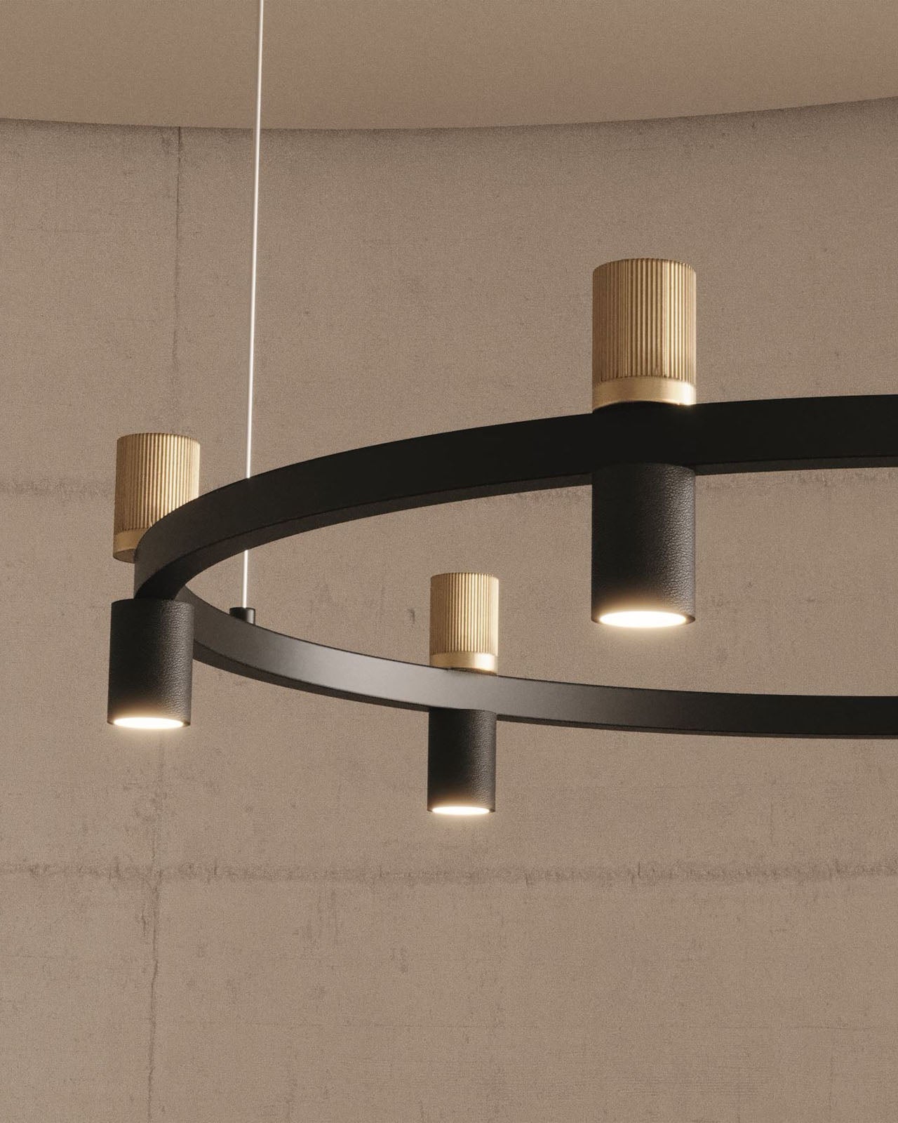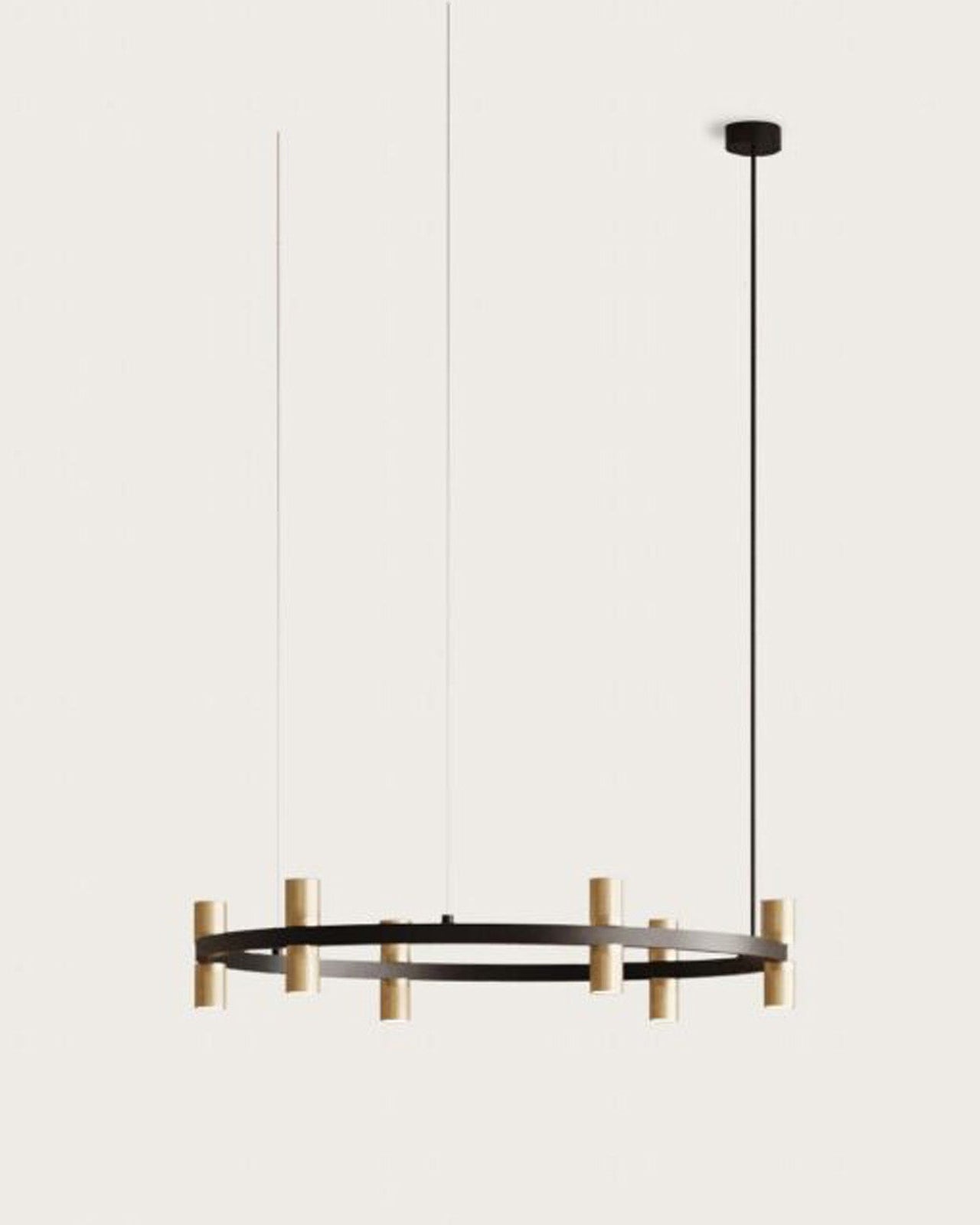 This modern chandelier will be a captivating and sophisticated addition to living rooms, dining rooms or halls with a high ceiling. Bringing a luxury and elegant touch to interiors, this pendant features a circular linear frame on which are mounted twelve cylinder-shaped diffuser heads to provide a pleasant light upwards and downwards. While the frame is in a timeless black colour, the diffusers are made from aged gold-finished metal or sumptuous black leather, creating a warm and inviting atmosphere.