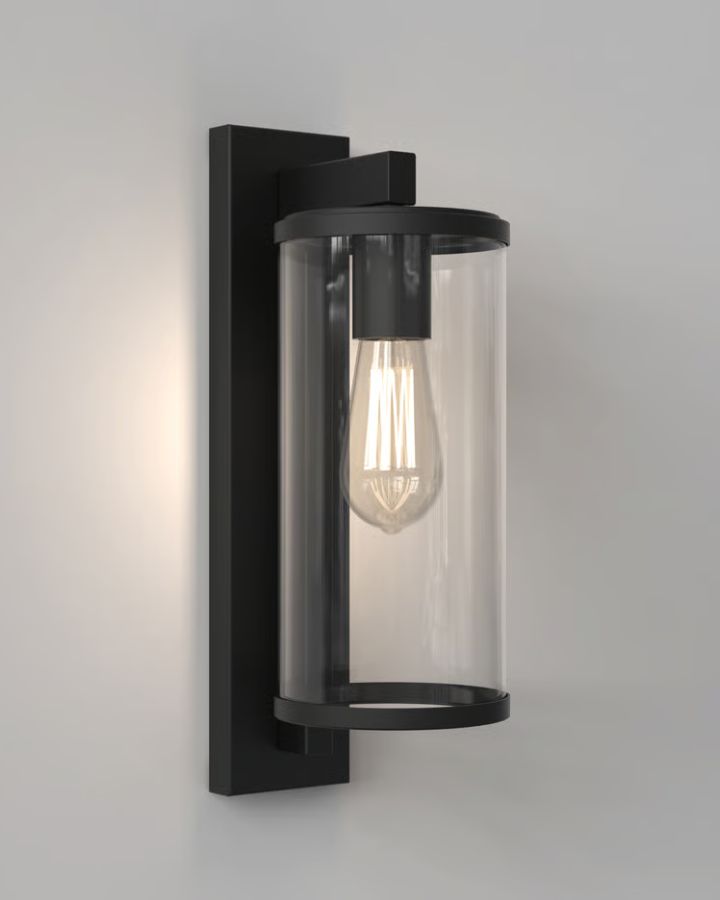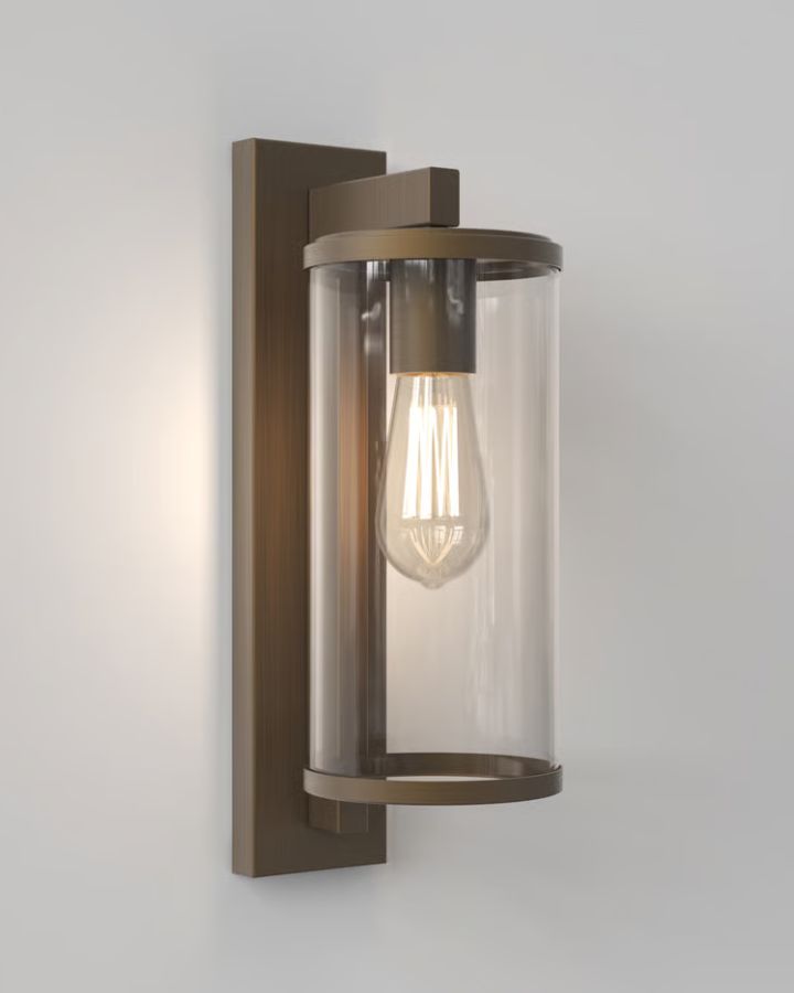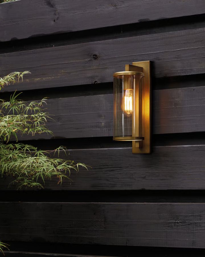 The Modern Lamp Wall Light is a refined fitting that combines timeless design with durable craftsmanship. Featuring a tall metal frame in Antique Brass, Bronze or Textured Black, this elegant fixture encloses a cylindrical clear glass shade that allows a clear, bright light. With an IP23 rating, this fitting is ideal for sheltered outdoor spaces such as porches or covered patios, offering both decorative charm and practical illumination. This charming light pairs with classic or contemporary architecture, bringing understated sophistication to any space.