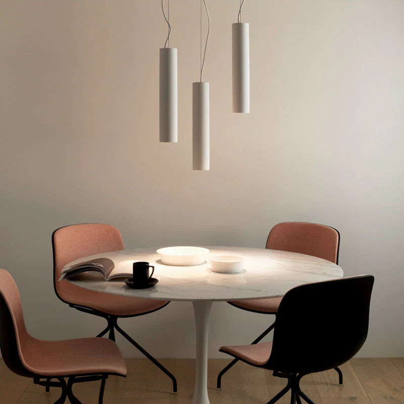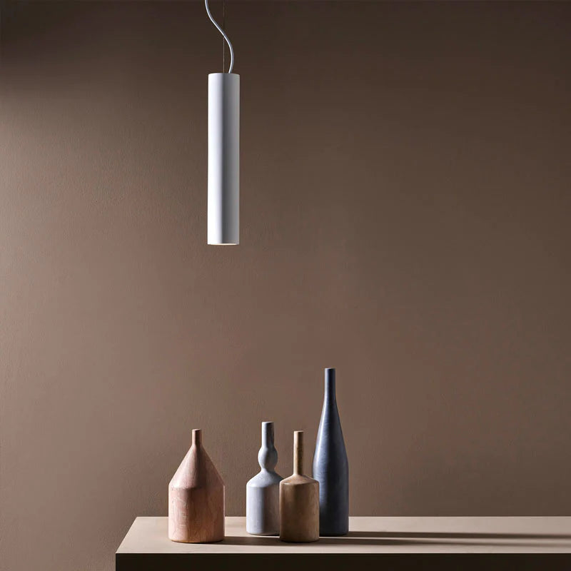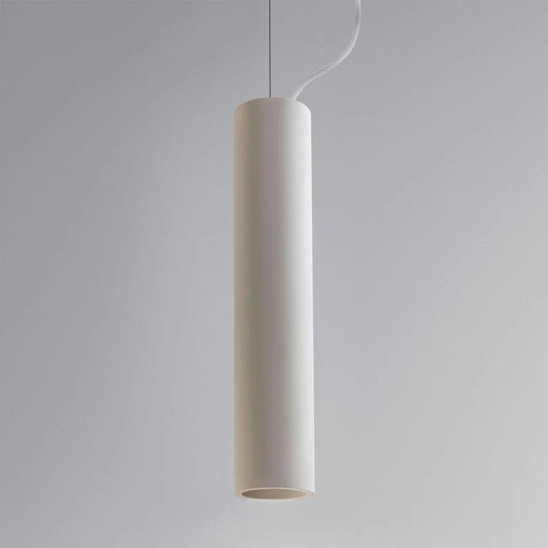 This White Plaster Pendant Ceiling Light features a cylindrical shade and casts light downwards. This fixture will add a sleek and contemporary touch to your house and can be grouped with others to ideally light on living rooms, kitchen islands or dining rooms. The ceramic shade can be painted with a cellulose spray paint to suit your colour scheme.