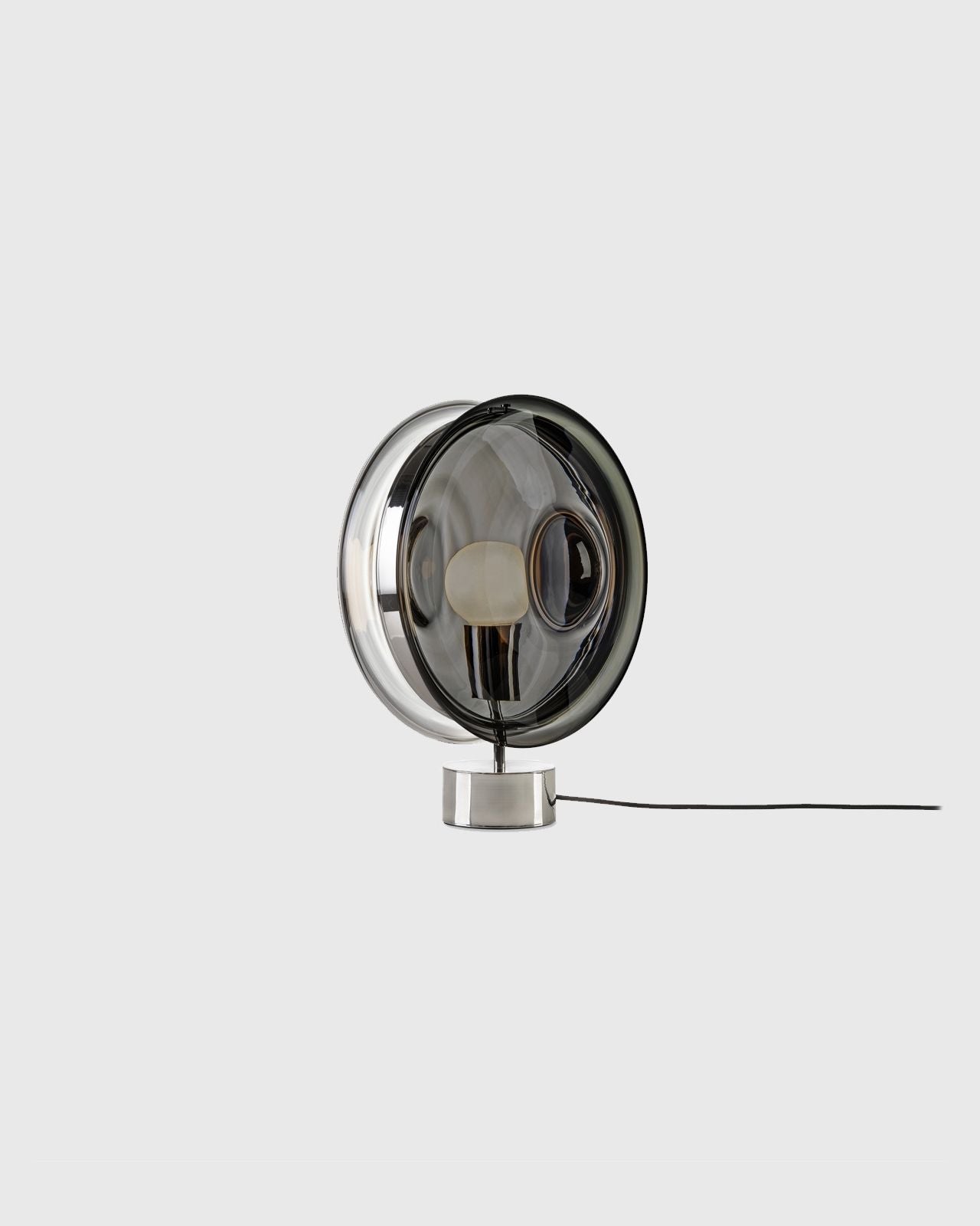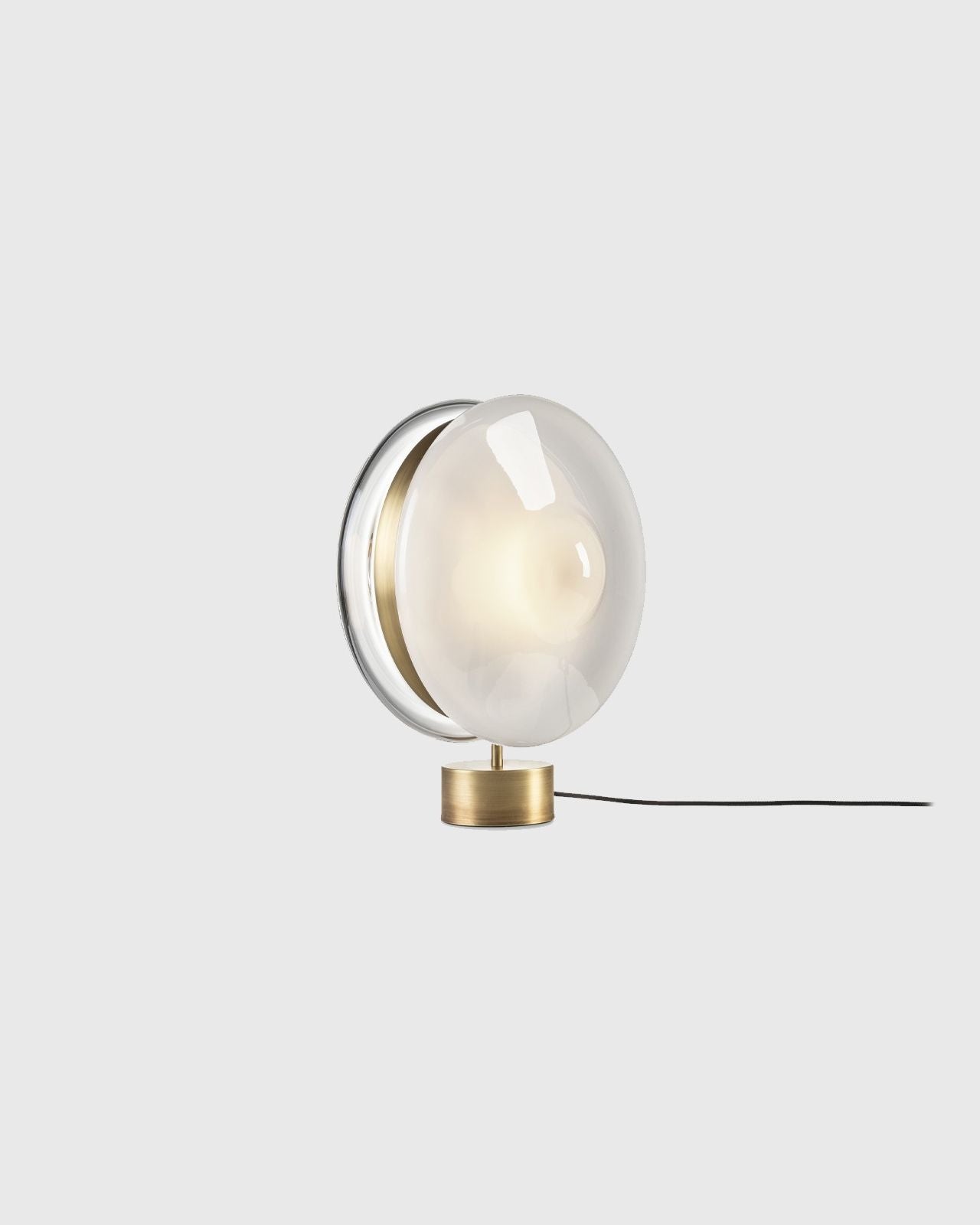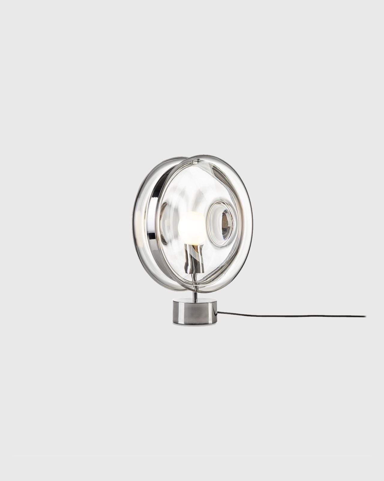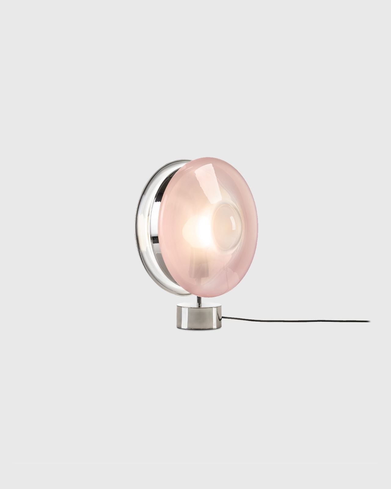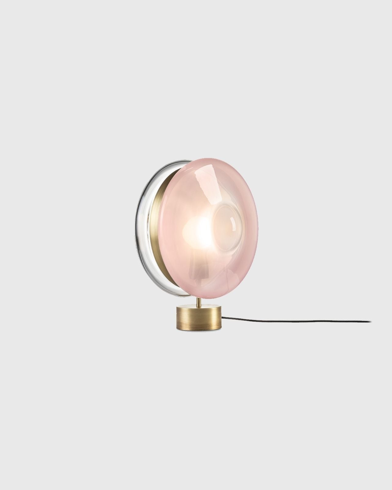 Drawing inspiration from the orbits described by celestial bodies, this table lamp is composed of two glass lenses mouth-blown by experts and assembled with a metal mount on a short cylindrical base, available in patina gold or silver. While one of the lenses remains clear, the other one can be chosen from clear, pastel pink, polar white or mercury black finish. This fixture will create a suggestive play of light and reflections in modern or sophisticated interiors and will lend a magical and cosy atmosphere to bedrooms, living rooms or reading nooks.