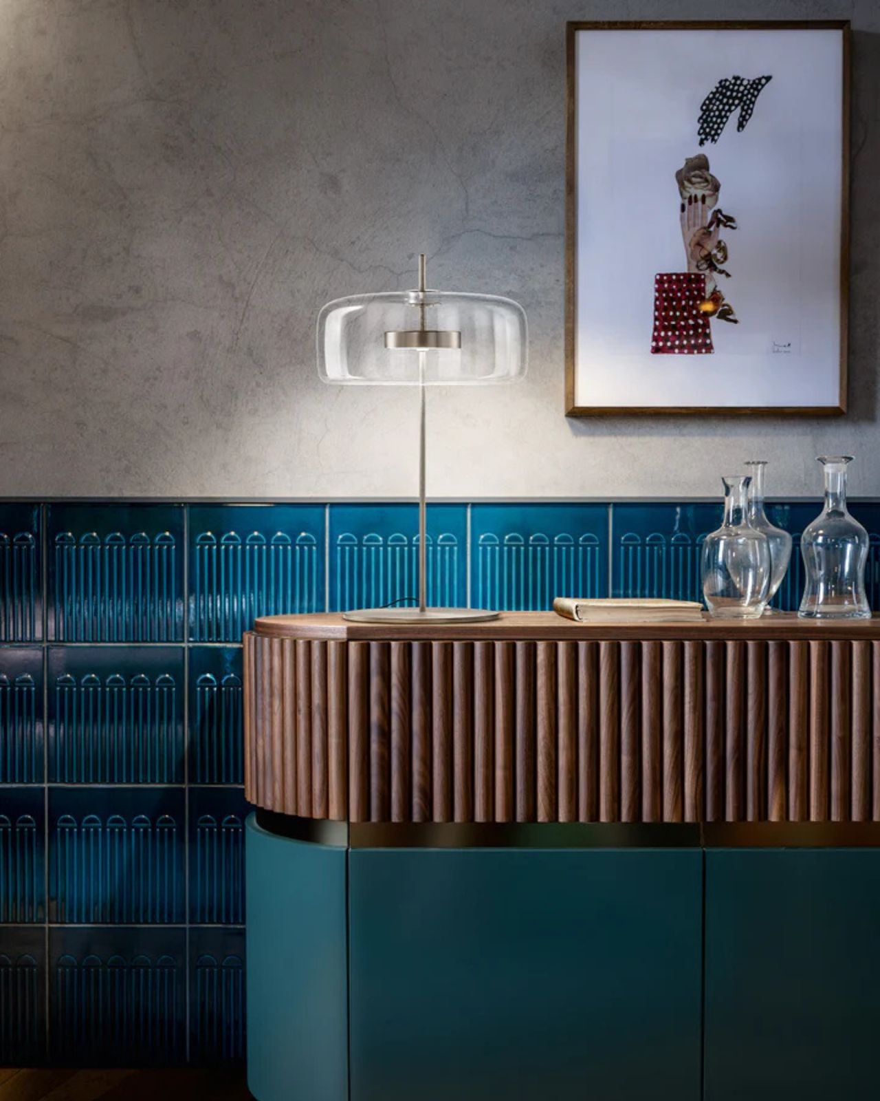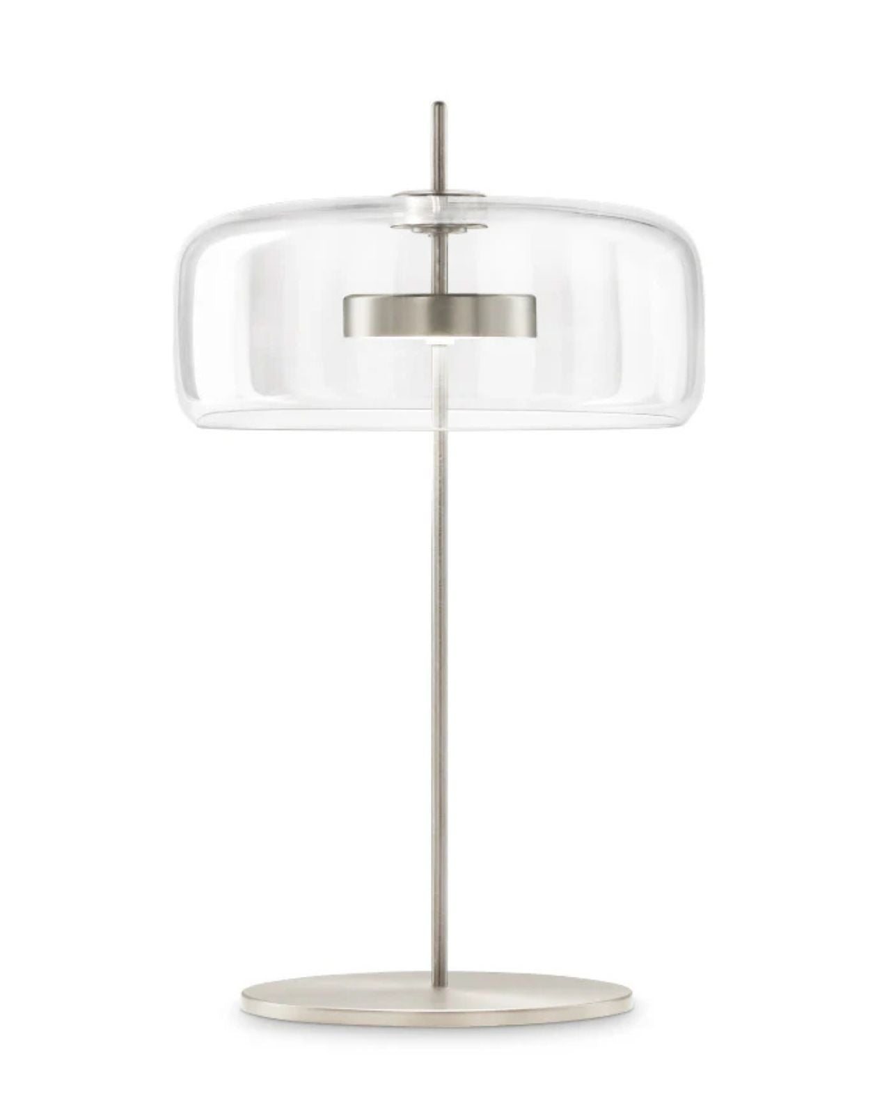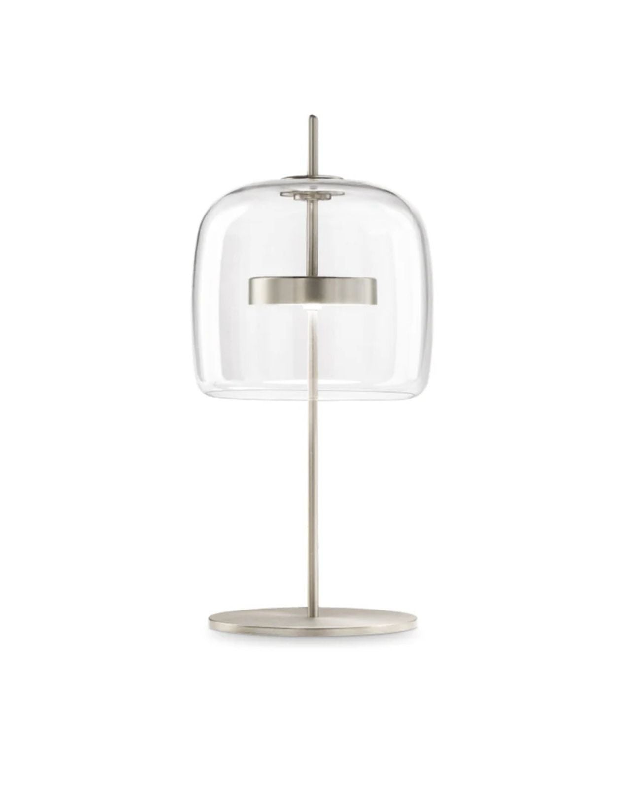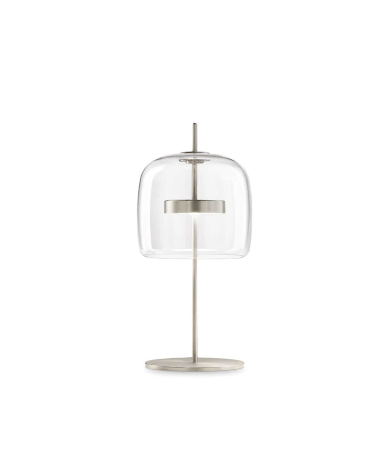 This Italian lamp is composed of two mouth-blown pieces of murano glass from Italy that once brought together create an overlapping effect showcasing a retro design. The union of the two glass elements are fused together to look like a singular stunning form. The built-in LED emits widespread light suited for a range of styled interiors.