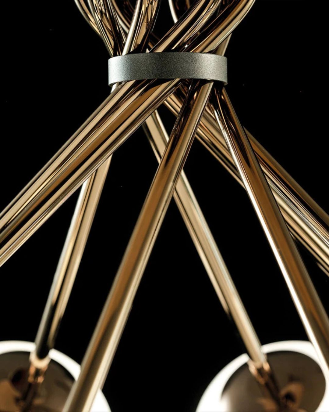 A stunning Italian chandelier ceiling light boasting a timelessly luxurious nickel gold and anthracite metal finish with eight satin glass diffusers that evenly distribute a warm glow in an innovative and cutting edge fashion. 100% designed and made in Italy.