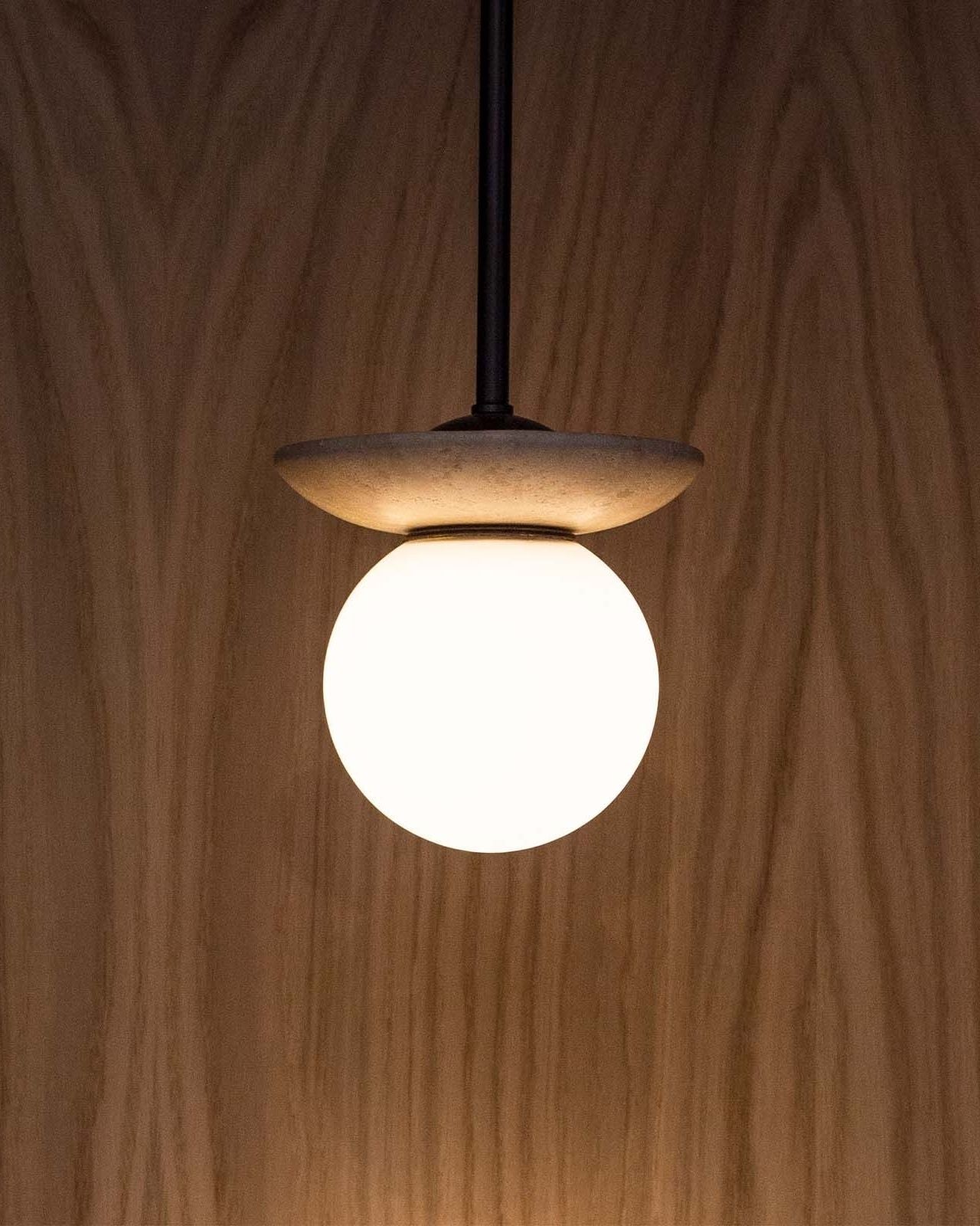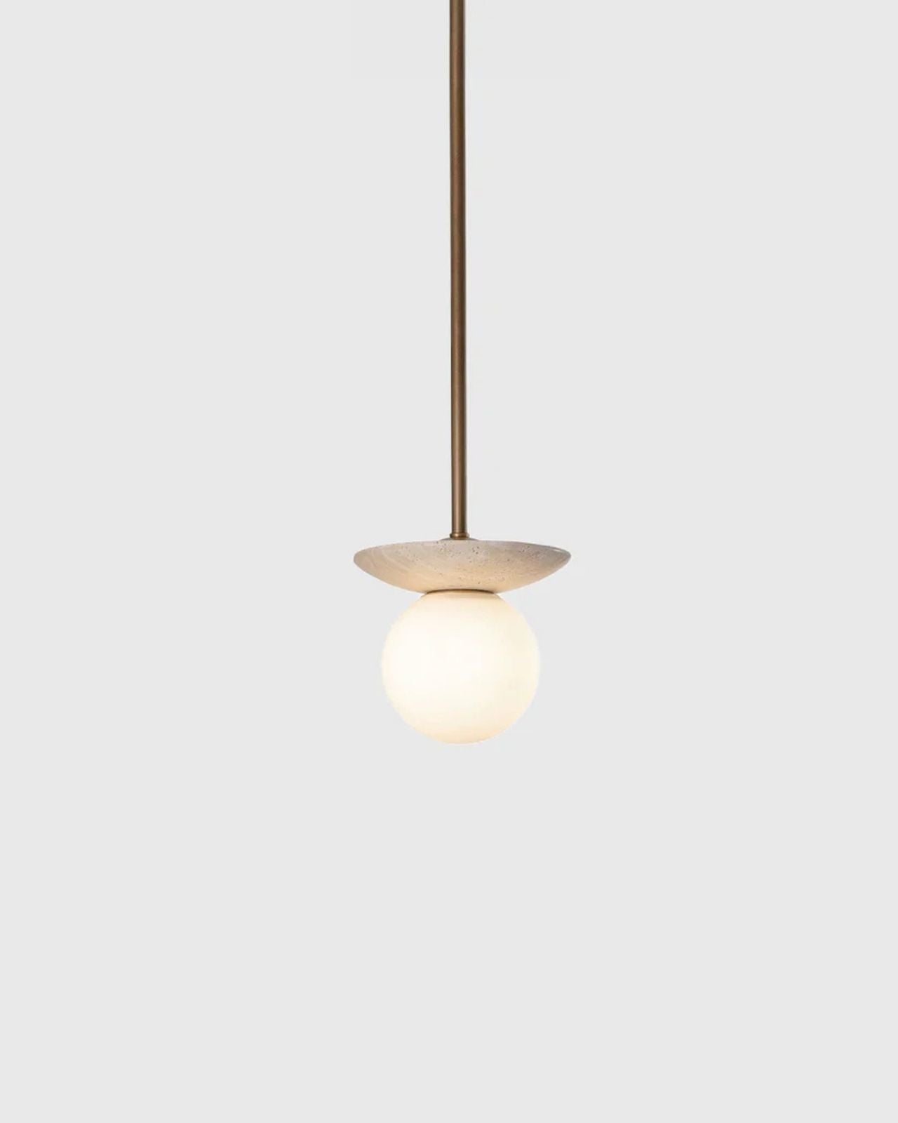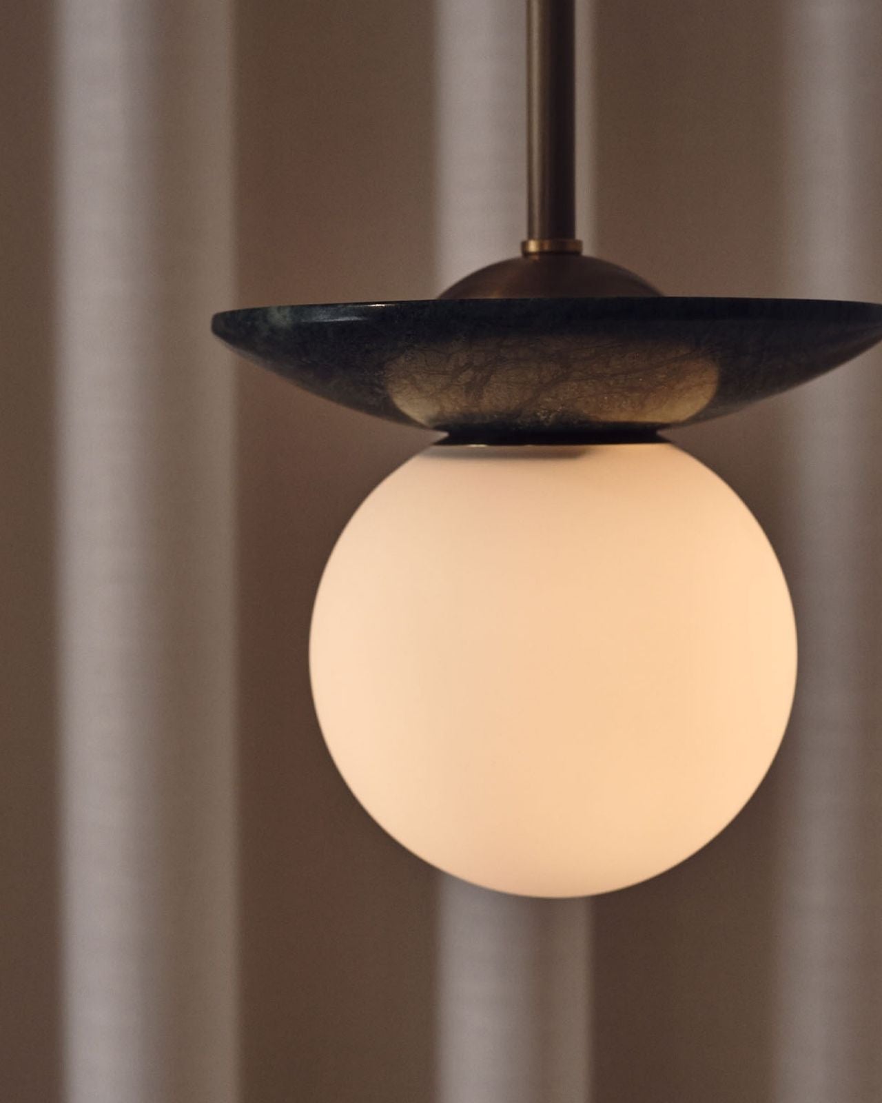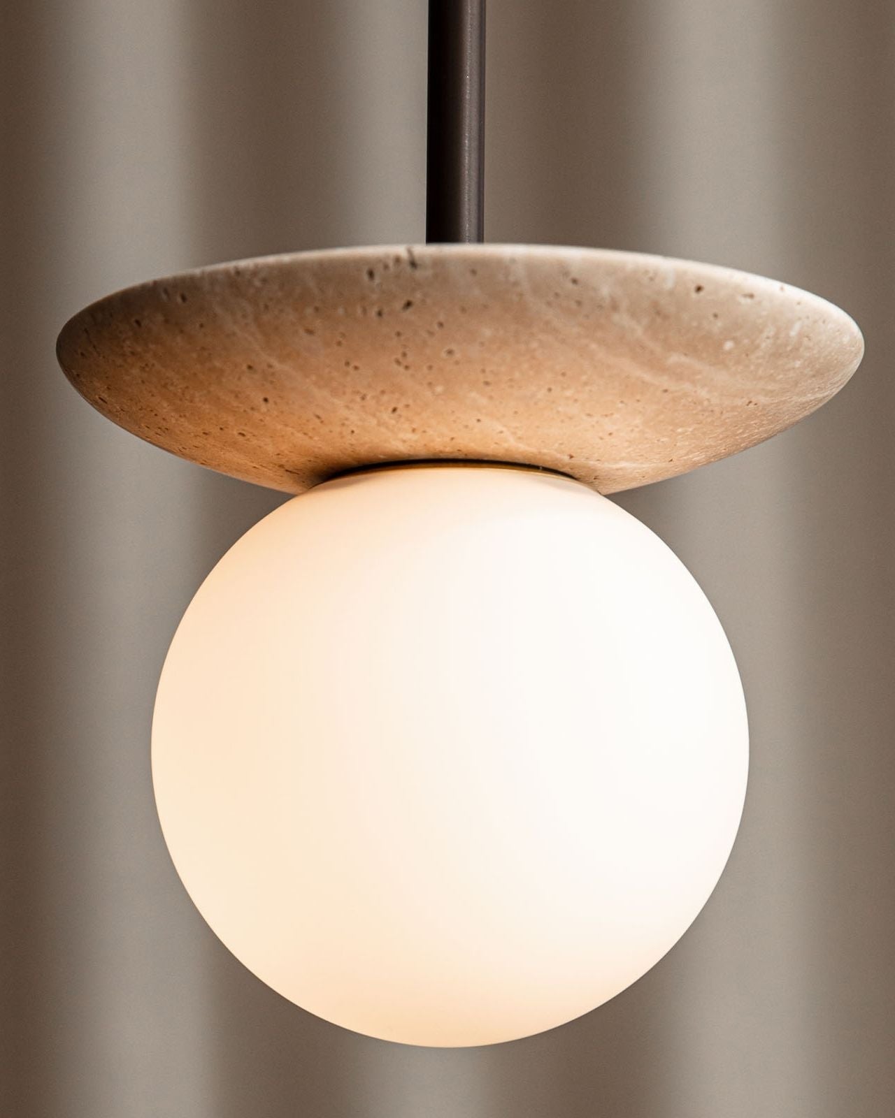 Adding a contemporary touch to modern interiors, this graceful and sculptural pendant showcases a matt opal shade and an elegant stone plate made from travertine, black marble, red marble or green marble. Expertly crafted in England, this fixture effortlessly combines functionality and beauty, whether on its own or clustered with other pieces.