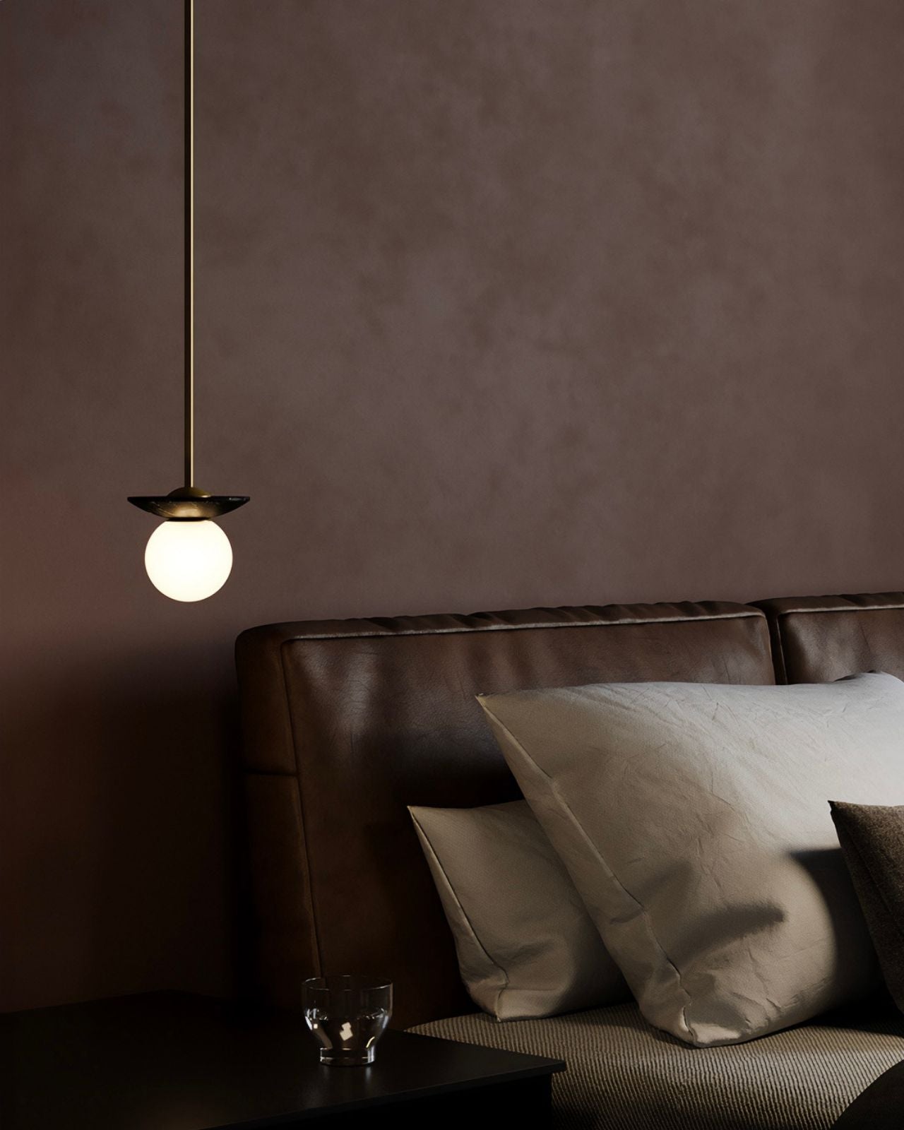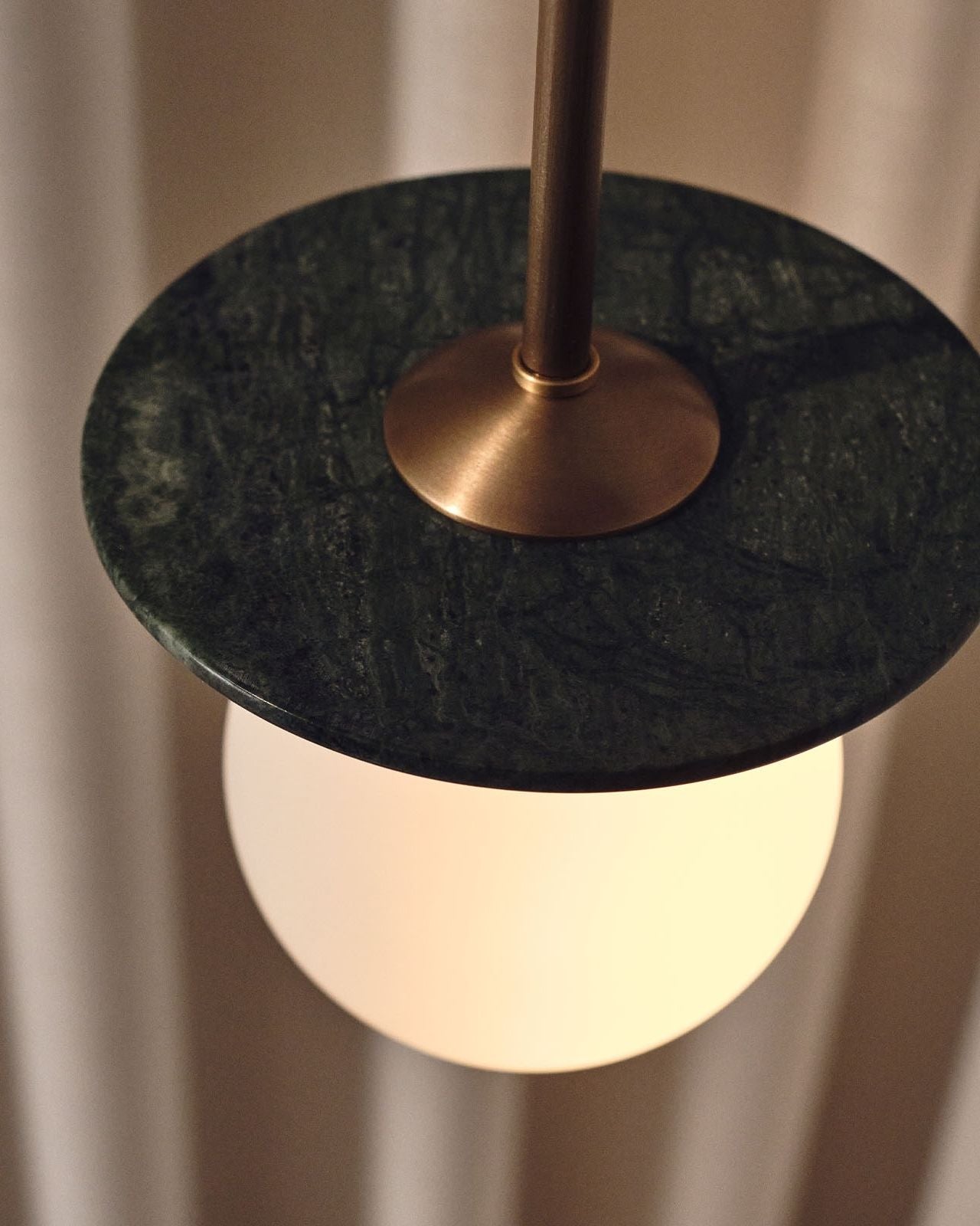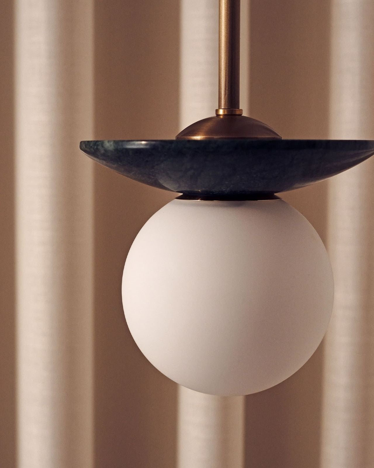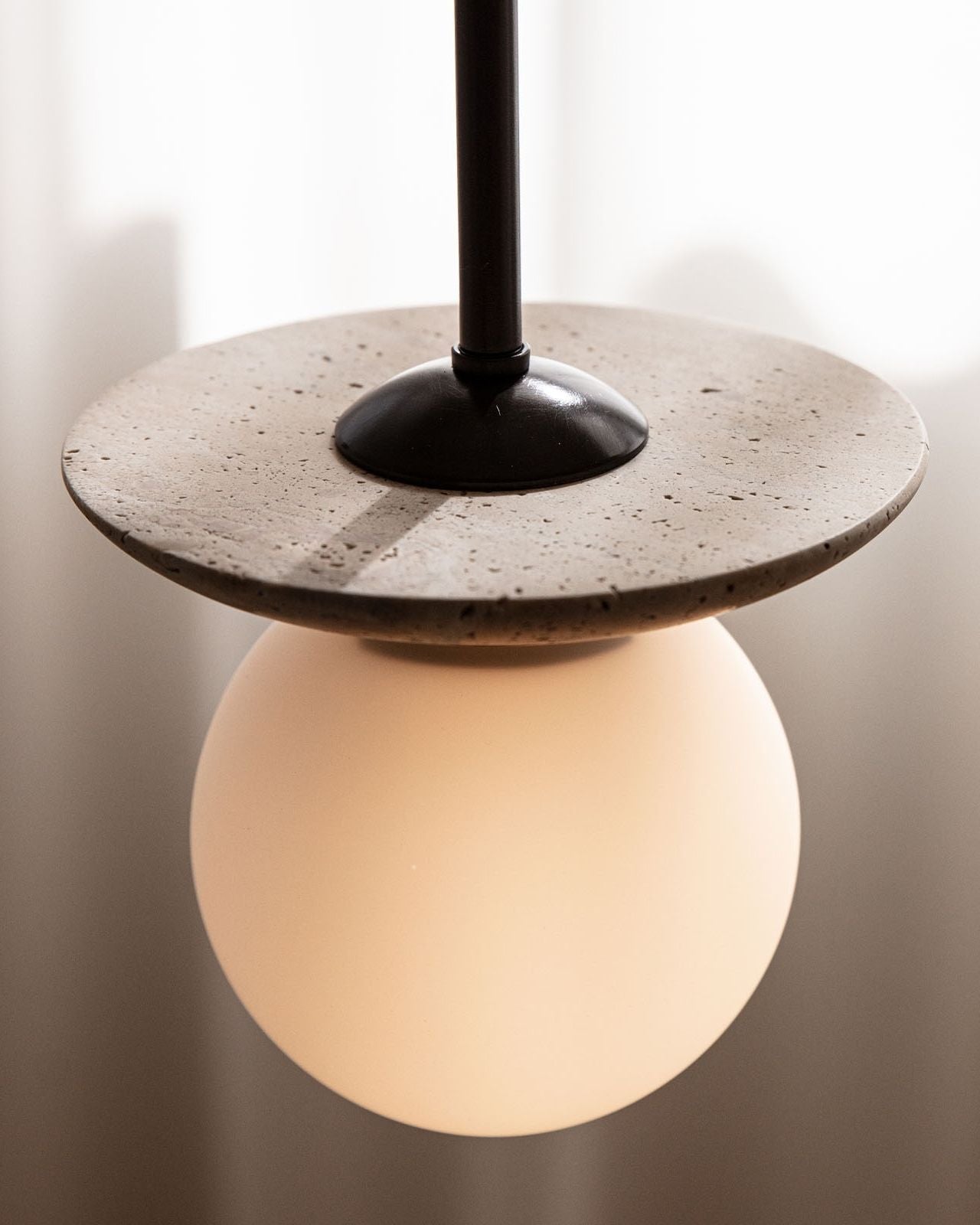 Adding a contemporary touch to modern interiors, this graceful and sculptural pendant showcases a matt opal shade and an elegant stone plate made from travertine, black marble, red marble or green marble. Expertly crafted in England, this fixture effortlessly combines functionality and beauty, whether on its own or clustered with other pieces.