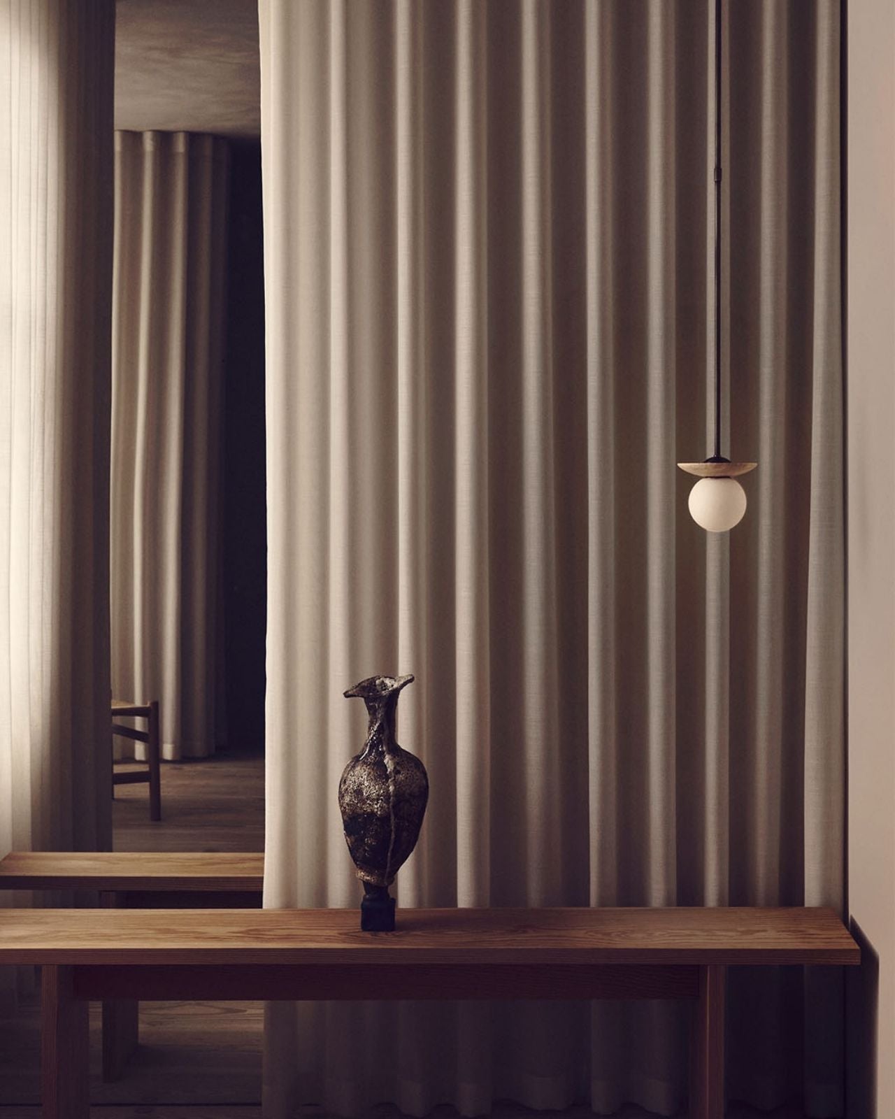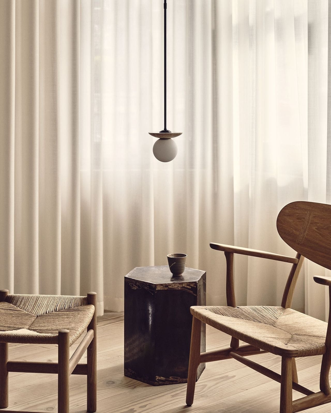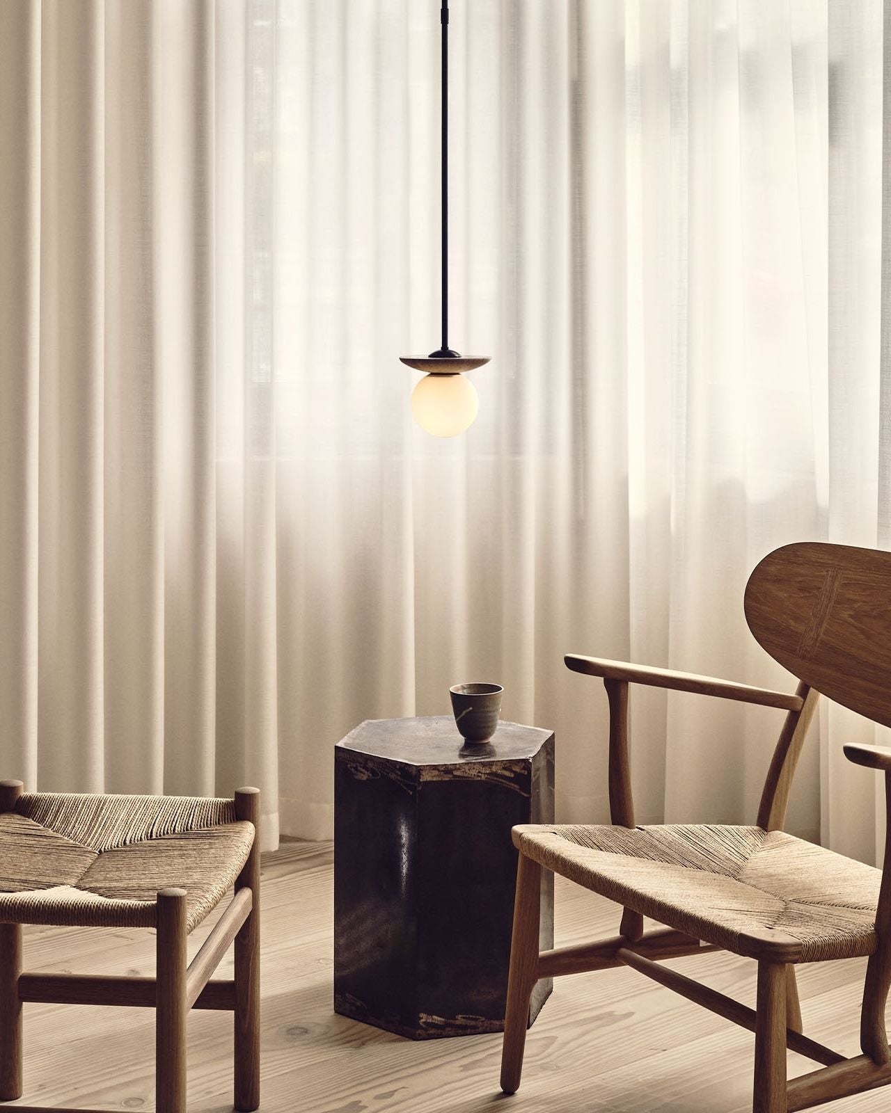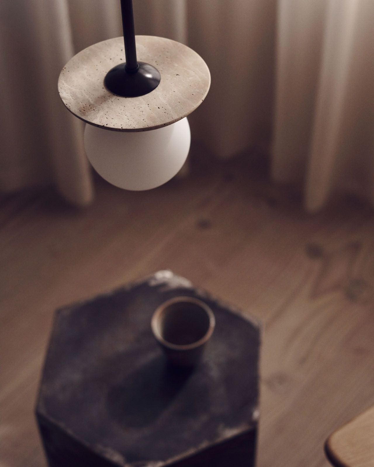 Adding a contemporary touch to modern interiors, this graceful and sculptural pendant showcases a matt opal shade and an elegant stone plate made from travertine, black marble, red marble or green marble. Expertly crafted in England, this fixture effortlessly combines functionality and beauty, whether on its own or clustered with other pieces.