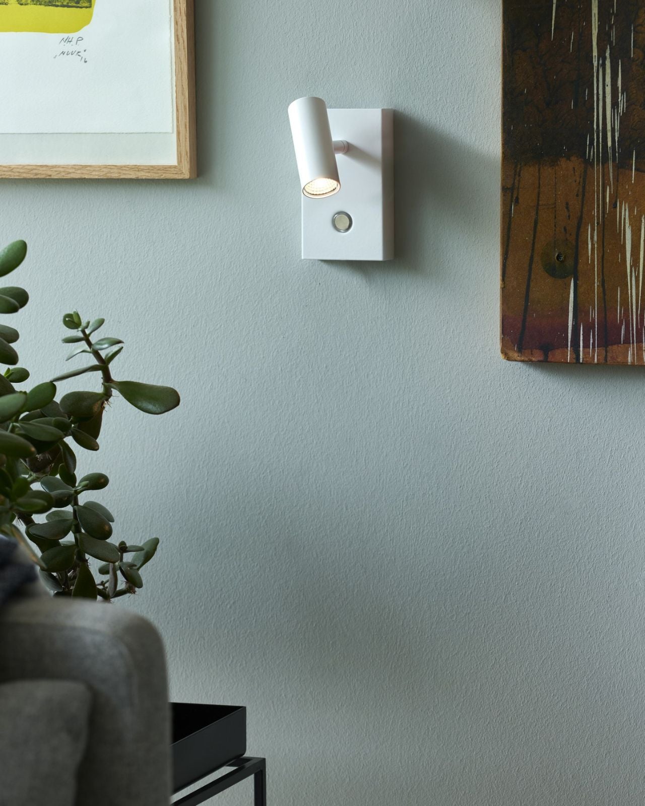 White wall-mounted adjustable light fixture on a light blue wall with a plant and artwork in the background.