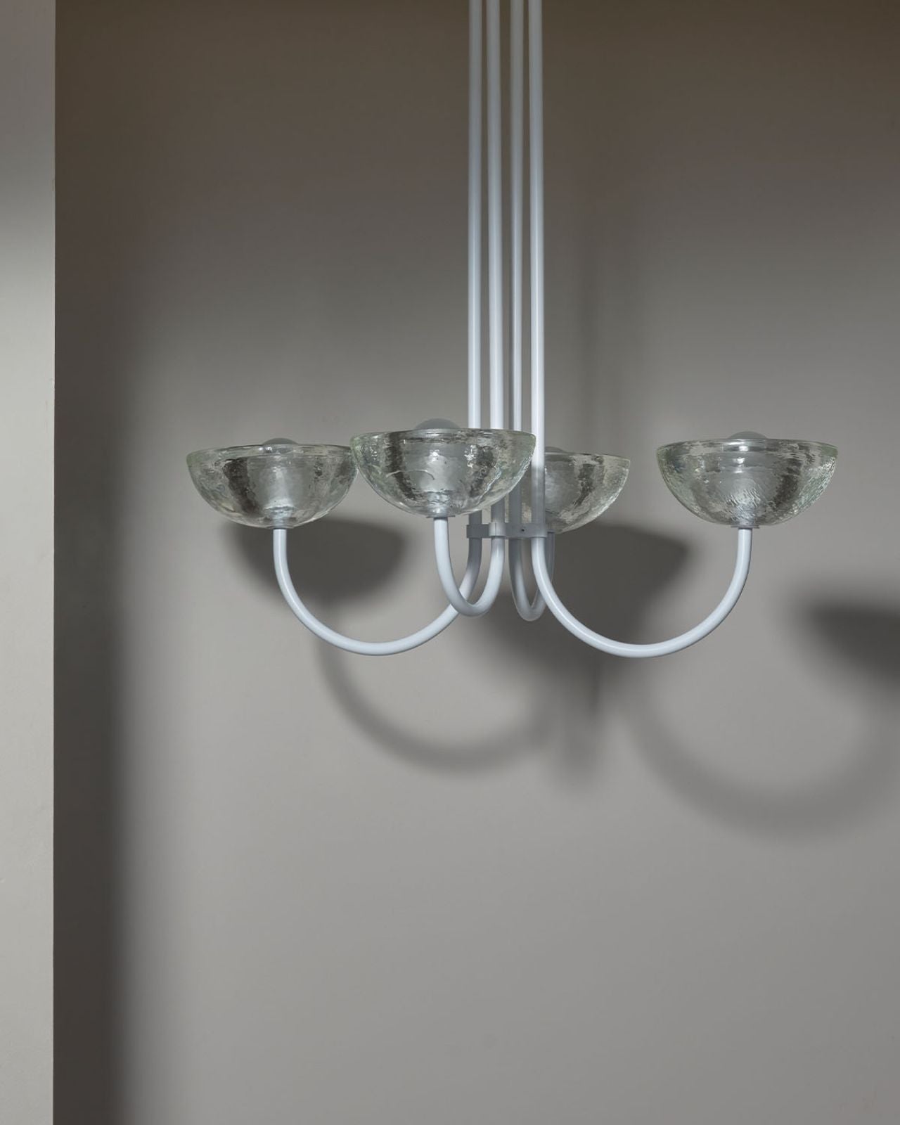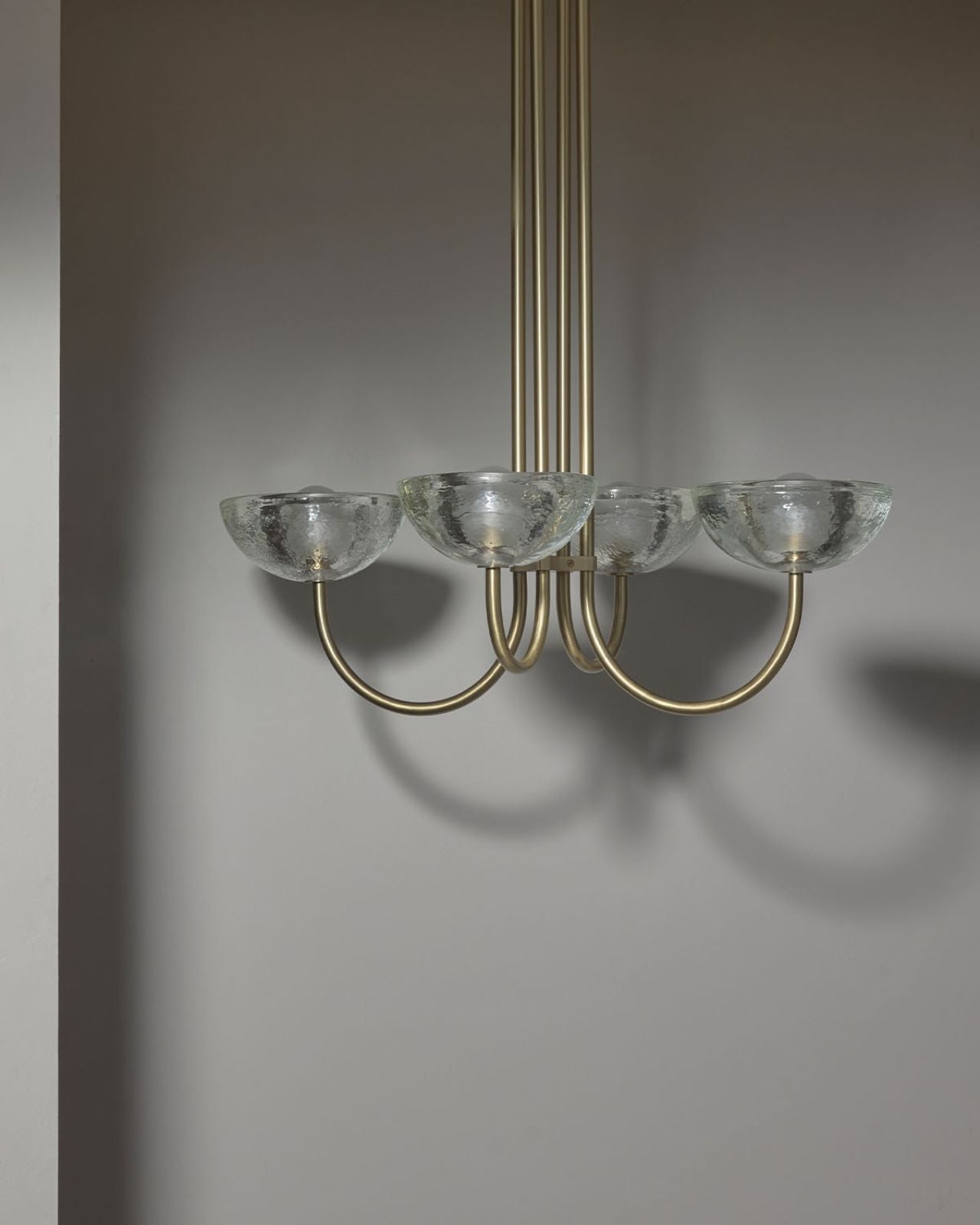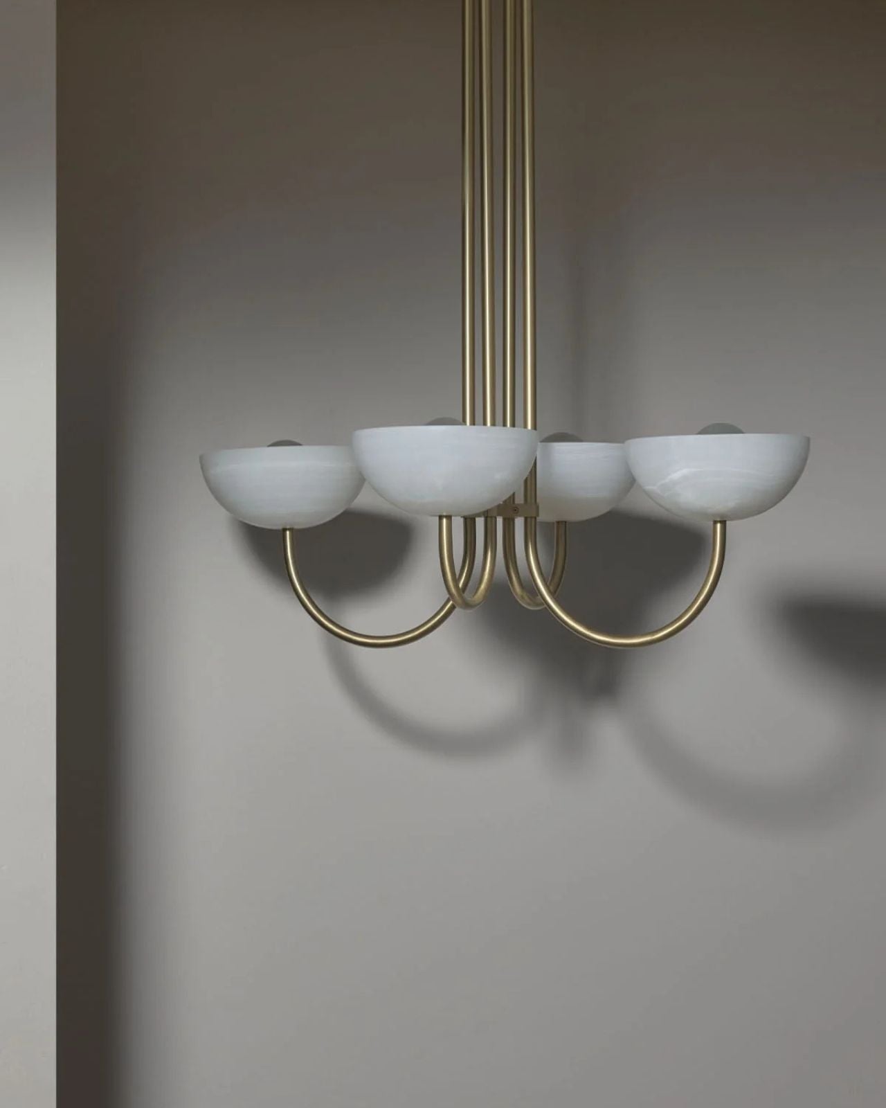 The Onyx Stone Narrow Quad Dome Chandelier | Aurelia is a contemporary version of a classic chandelier with shades turned upside down for stunning soft illumination. This fixture is made from glass, jade or white onyx and is paired with solid metal rods available in four finishes, brass, brushed black, brushed nickel or satin white. Ideal in living rooms, dining rooms or restaurants, this pendant will bring a celestial and refined touch to the surroundings.