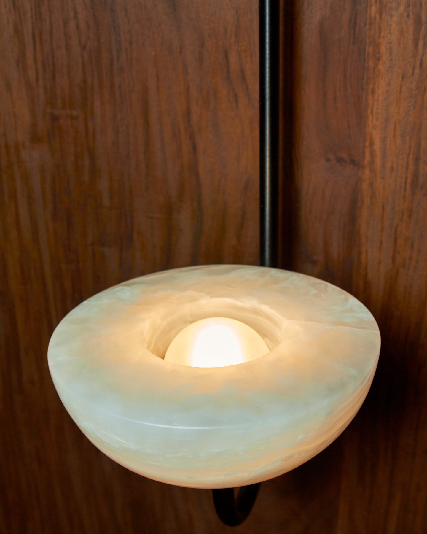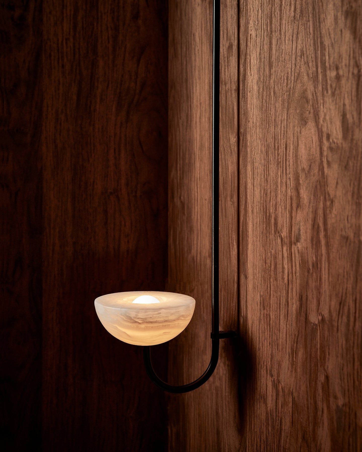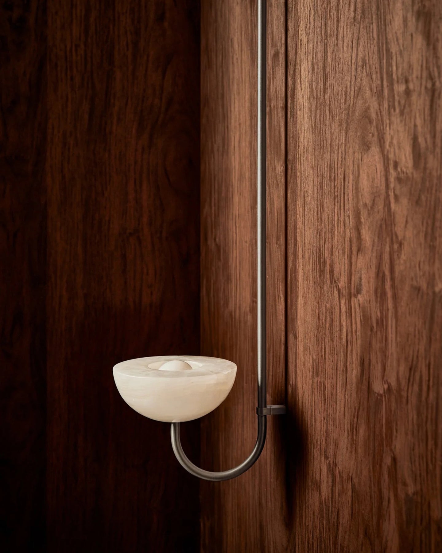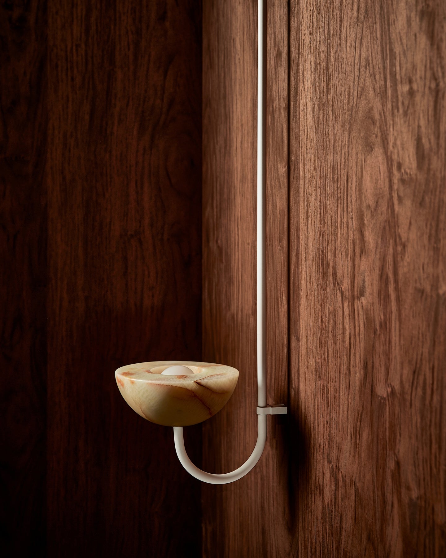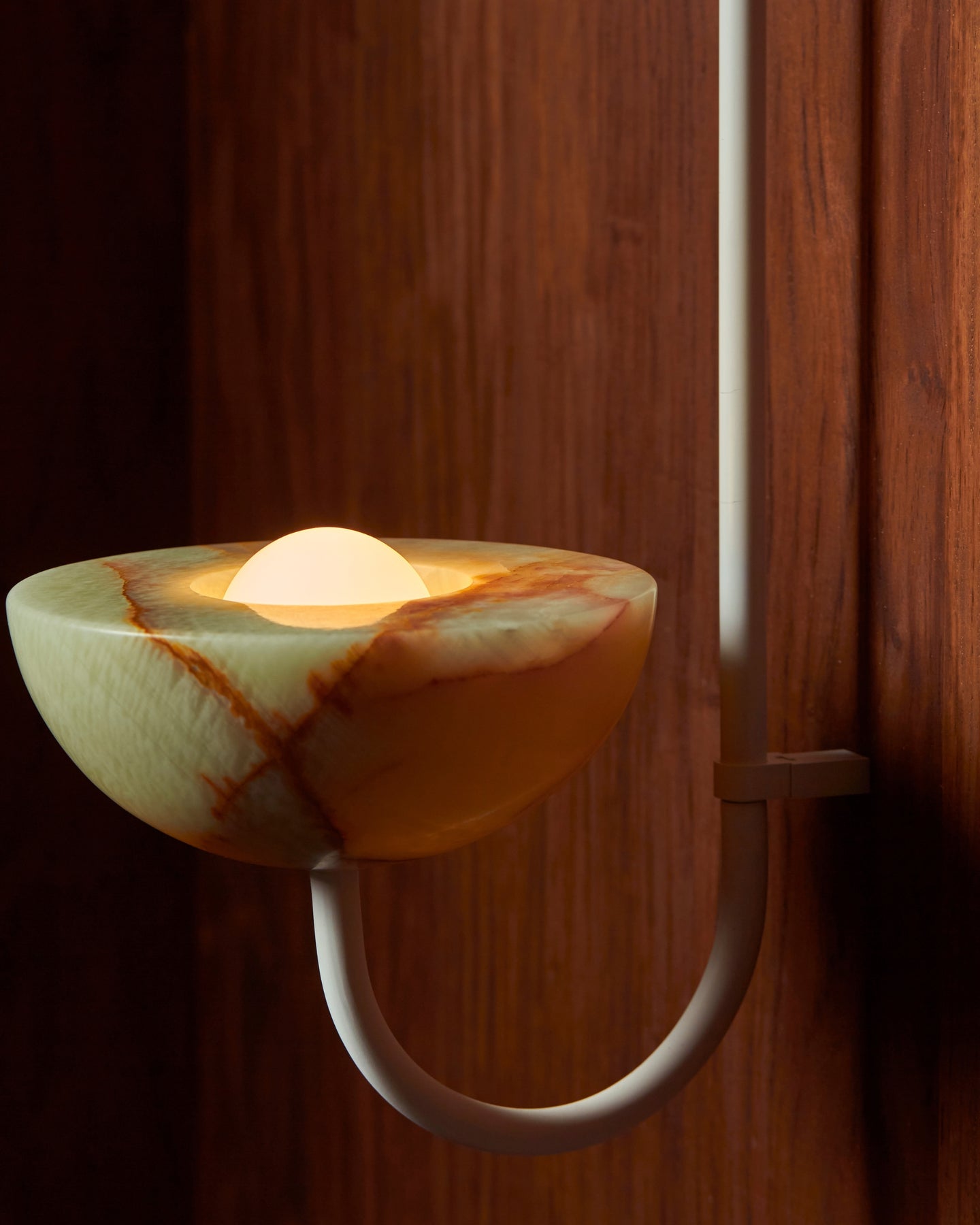 Creating an ethereal cosy ambience, this delicate wall light is available with white or jade onyx stone. Featuring a long curved metal arm available in three finishes and attached to the ceiling and the wall, and an elegant dome shade turned upside down for a unique illumination, this fixture can be purchased with an extension allowing for 115mm set-off from the wall, if you have a cornice. IP44-rated, this lighting solution will be suitable for any contemporary or modern interior from kitchens to bathrooms.