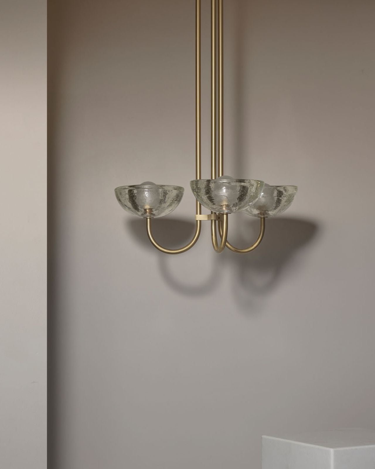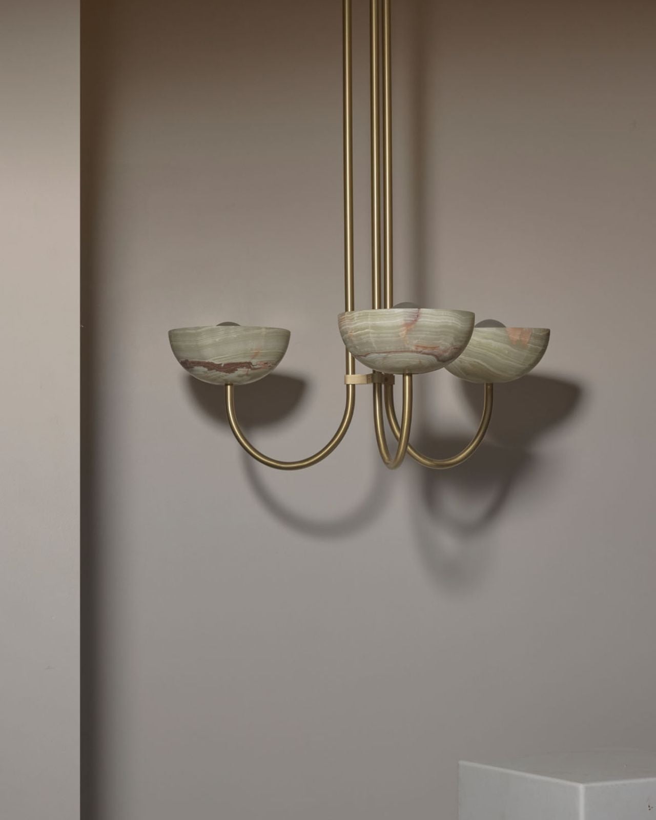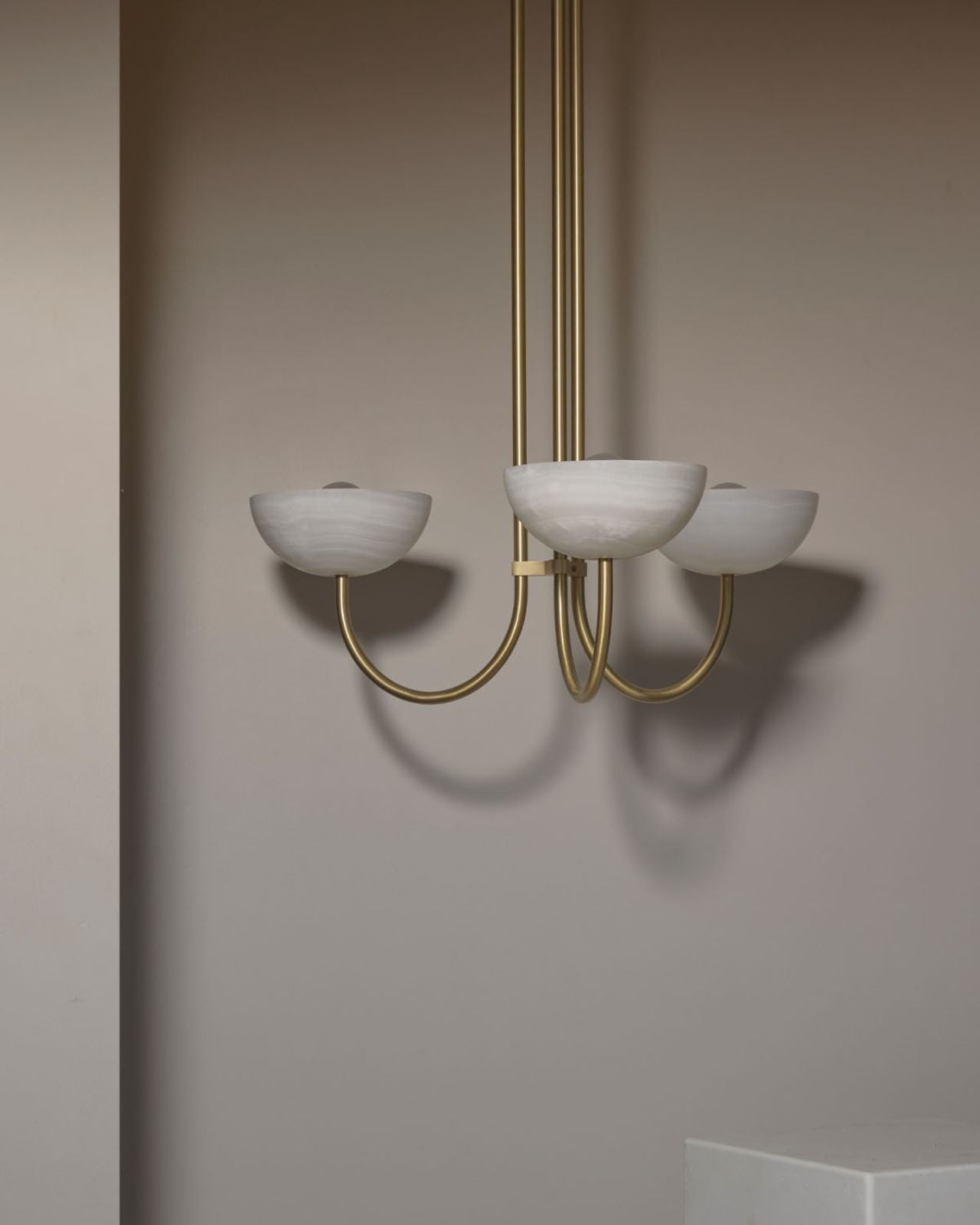 This triple dome pendant is a contemporary version of a classic chandelier with shades turned upside down for stunning soft illumination. This fixture is made from glass, jade or white onyx and is paired with solid metal rods available in four finishes, brass, brushed black, brushed nickel or satin white and two different sizes. Ideal in living rooms, dining rooms or restaurants, this pendant will bring a celestial and refined touch to the surroundings.