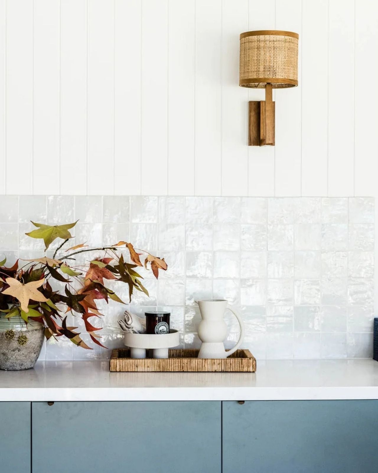 Organic Timber Wall Sconce With Woven Shade In a Coastal Style Bedroom