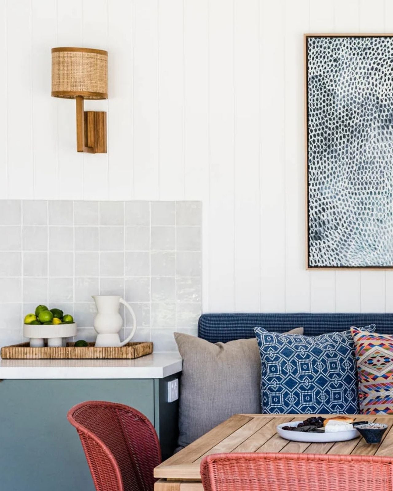 Modern dining area with a white round table and wooden chairs, featuring a rattan teardrop pendant