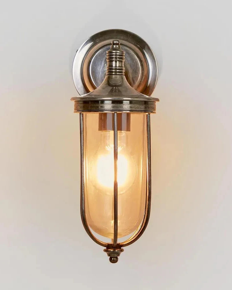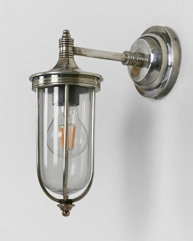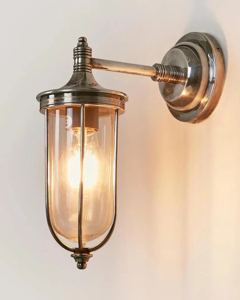 Enhance the outdoor ambience with this lantern-inspired wall light, constructed from durable antique brass or silver and featuring a lengthy glass shade. Its IP54 rating guarantees durability in challenging environments, including bathrooms. For a cosy feel, combine with a vintage-style filament bulb to create a timeless and welcoming glow.
