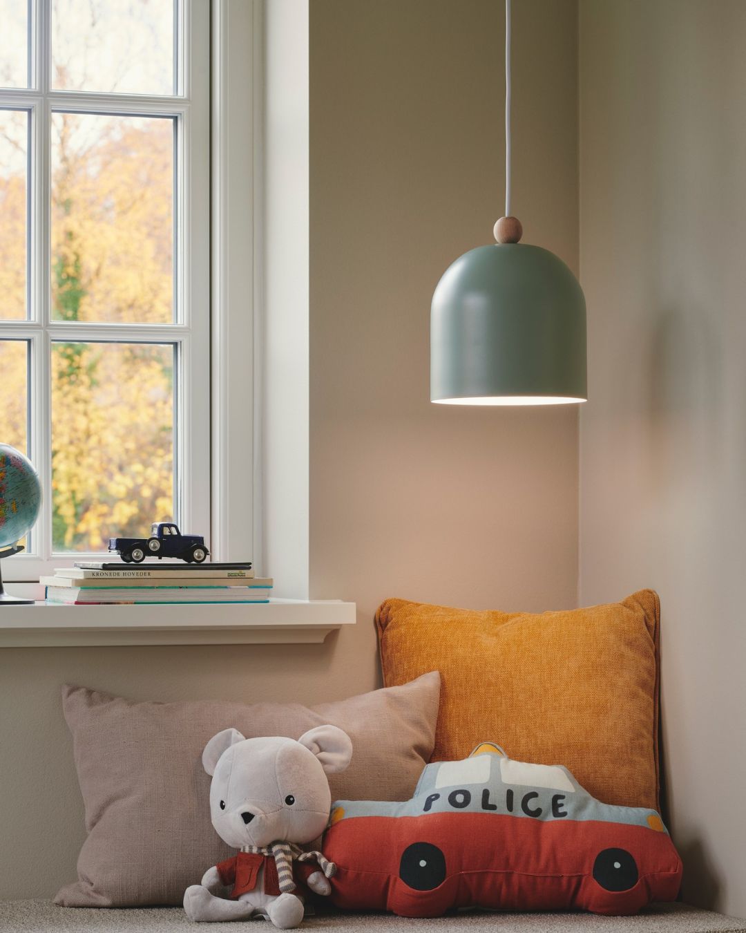 Designed in Denmark, the Pastel Nordic Pendant is a streamlined fixture with soothing muted tones. Its rounded shape is complemented by a small wooden detail atop the fixture, adding a subtle yet charming touch of natural warmth. This fixture adds a beautiful touch of personality to any nursery or children’s room.