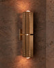 The Perforated Metal Wall Light | Polaris takes inspiration from Brutalist architecture and the guiding symbolism of the North Star. Defined by its geometric form and celestial illumination, this sculptural fixture features machined metal shades with fine linear perforations that create a striking interplay of light and shadow when illuminated.