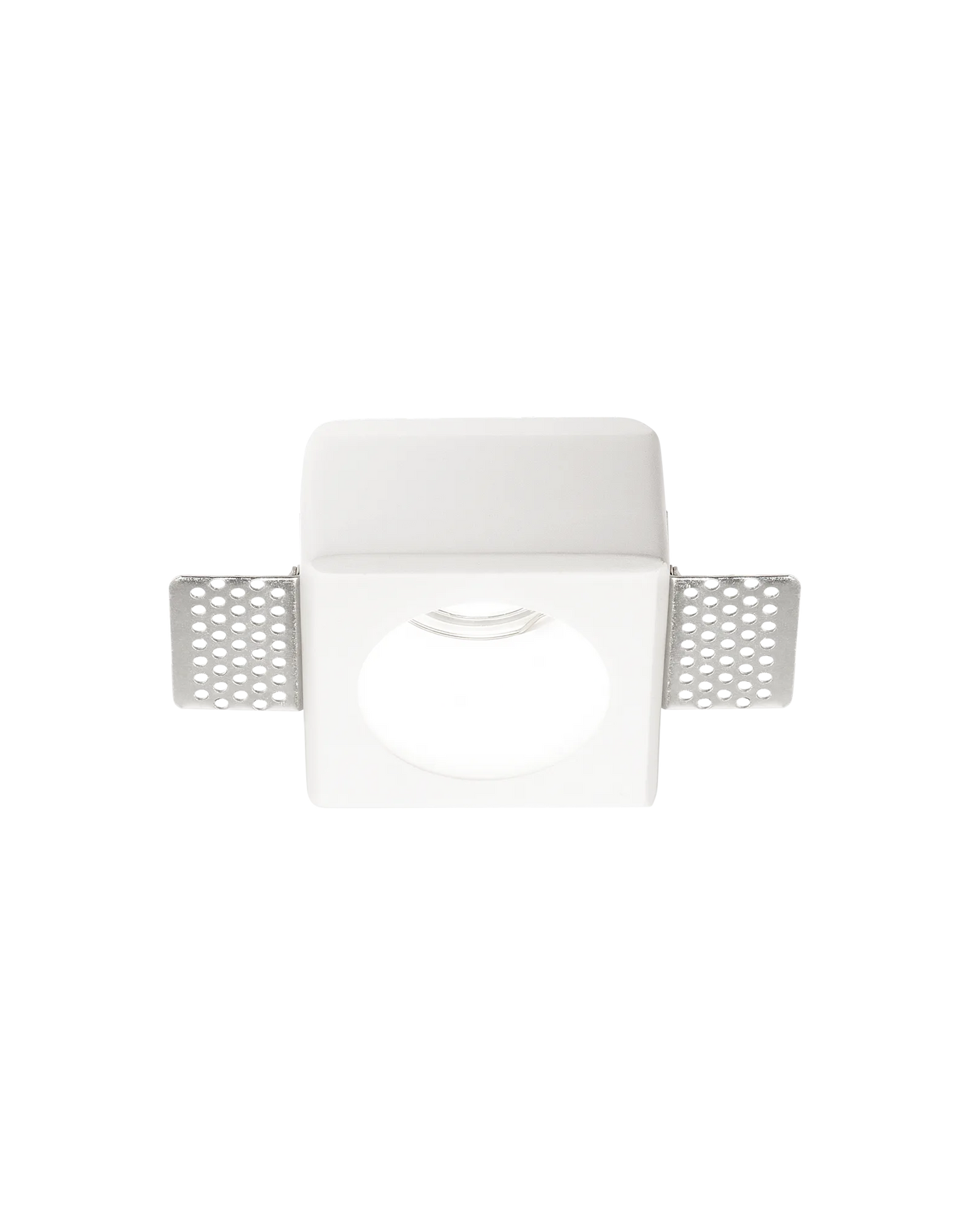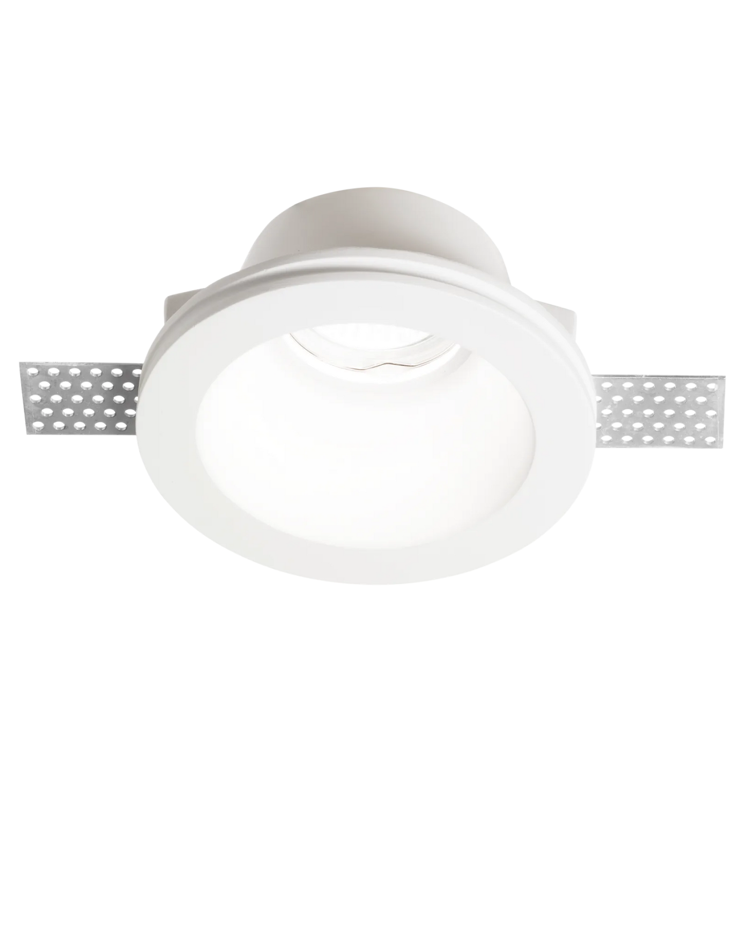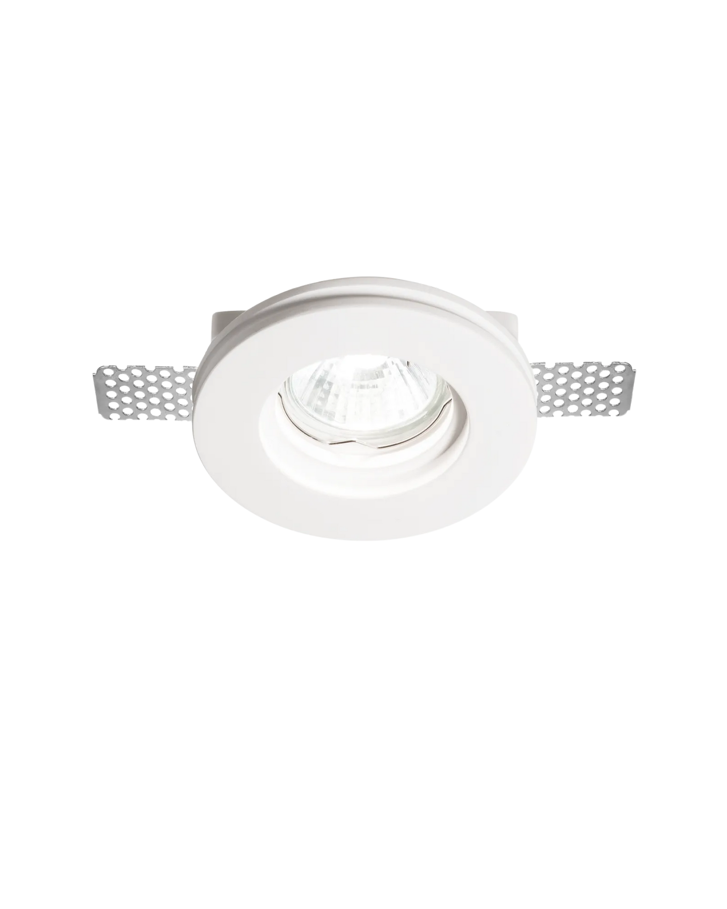 White recessed ceiling light with silver trim on a white background