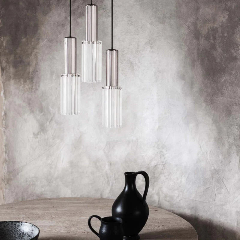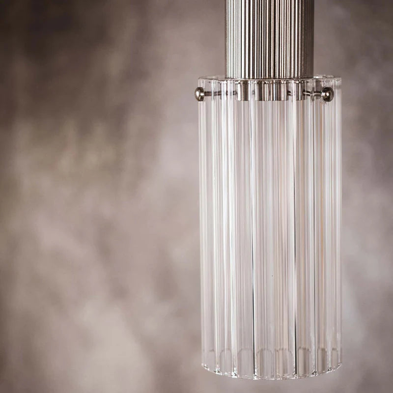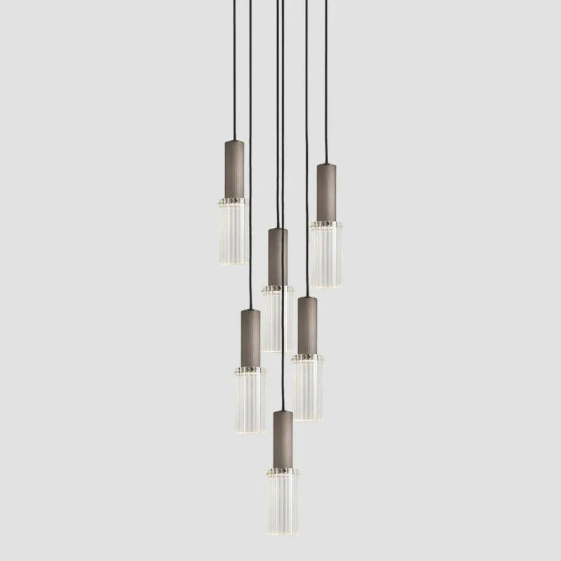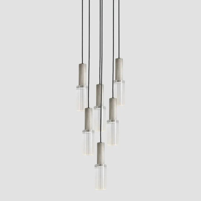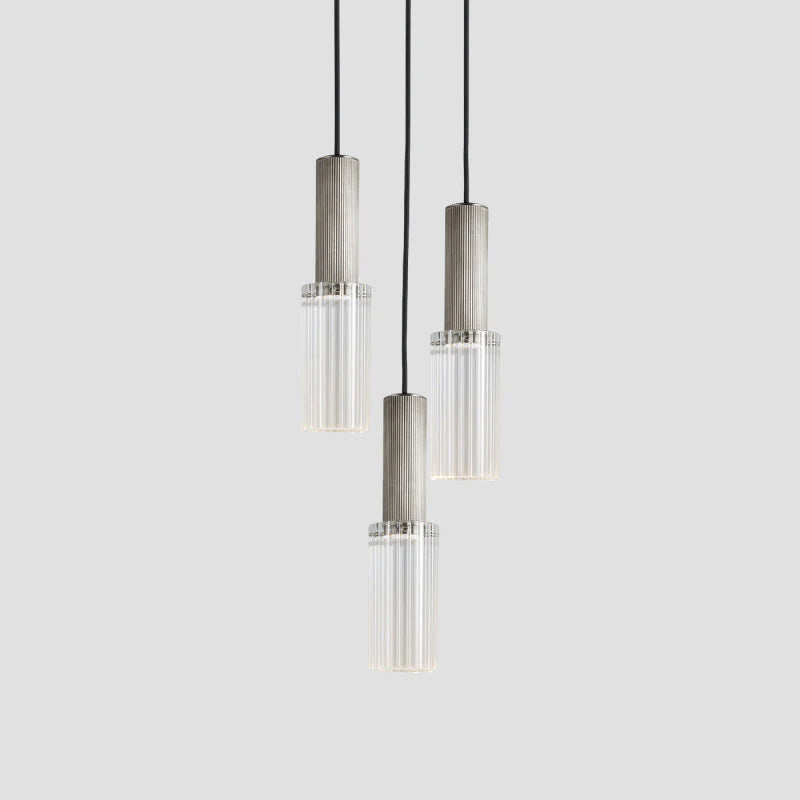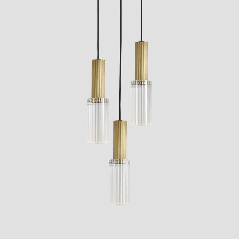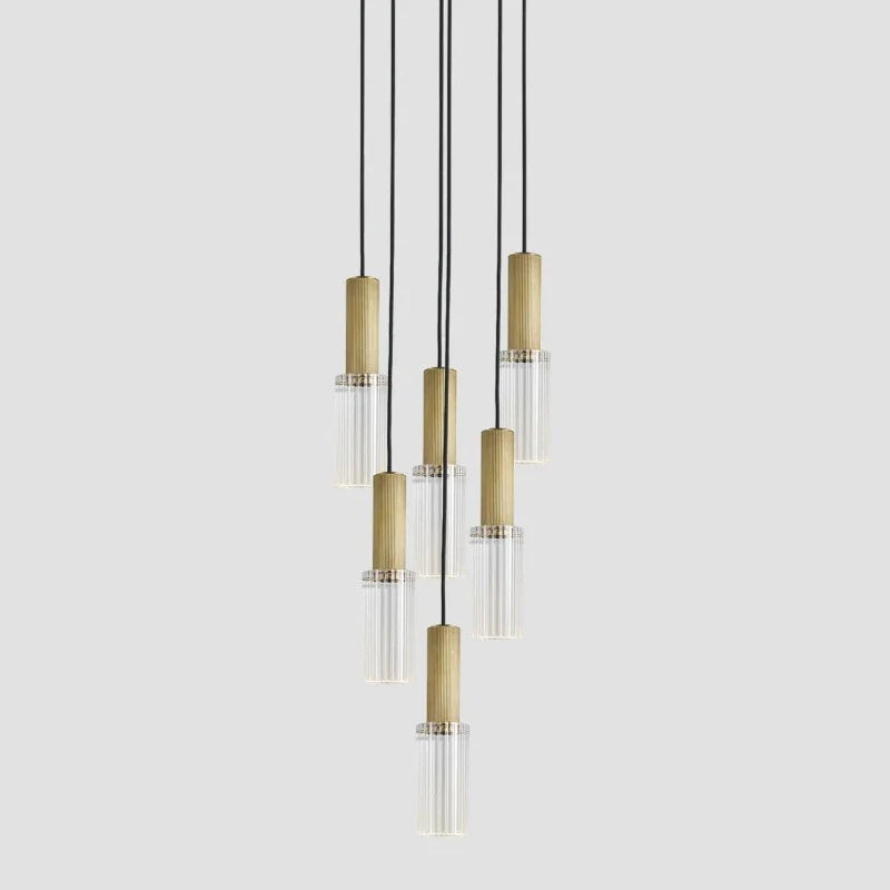 This chandelier pendant is an interplay of reeded glass and reeded brass that seamlessly fashions a modern and chic silhouette. Inspired by the classic styles of mid-century and Art Deco, this design artfully explores the dynamics of verticality and light refraction, resulting in an effortlessly sophisticated style. Immerse your space in timeless elegance and refined craftsmanship with this collection, creating a contemporary and captivating ambience.