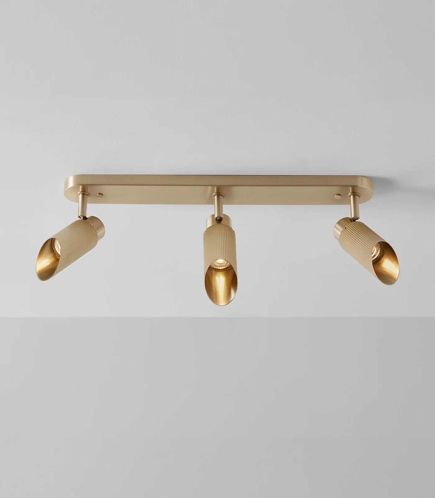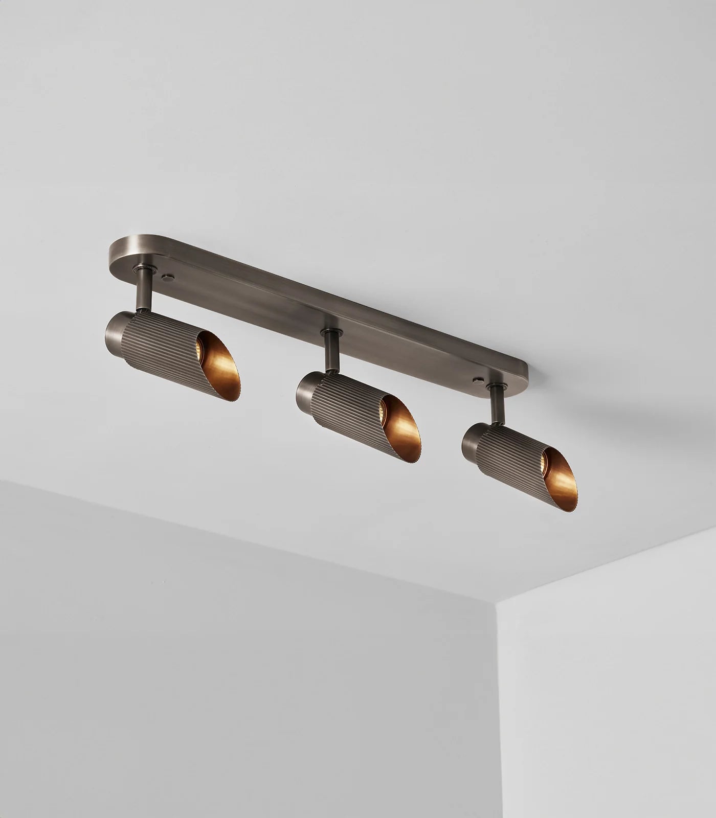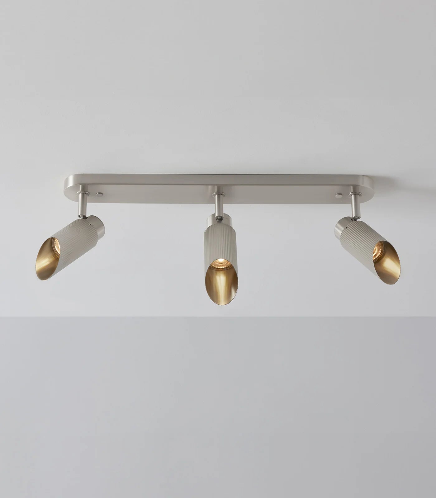Crafted with a subtly reeded metal finish, this piece brings texture and modern character to ceilings. Each head is engineered with recessed LEDs and angled detailing to soften glare while maintaining strong, efficient illumination. A thoughtful blend of form and function, this triple ceiling light suits contemporary interiors seeking precision lighting with a streamlined, understated presence.
