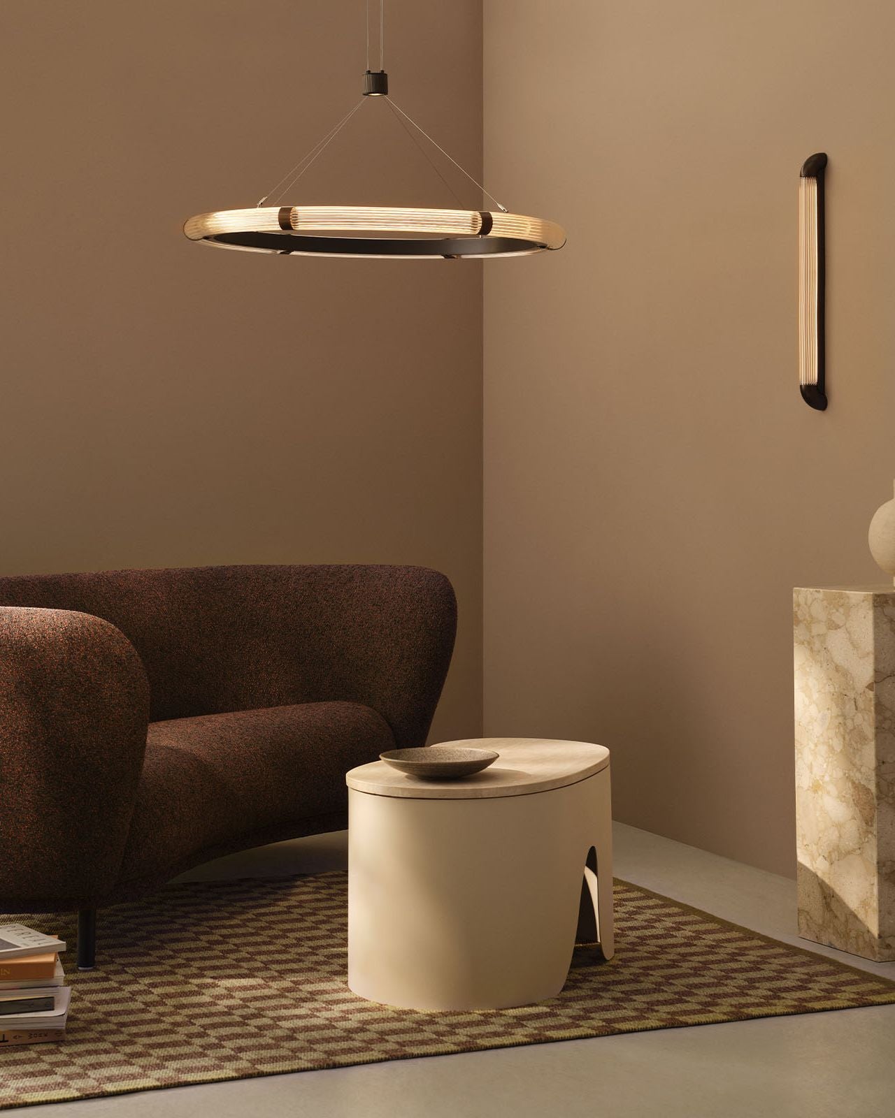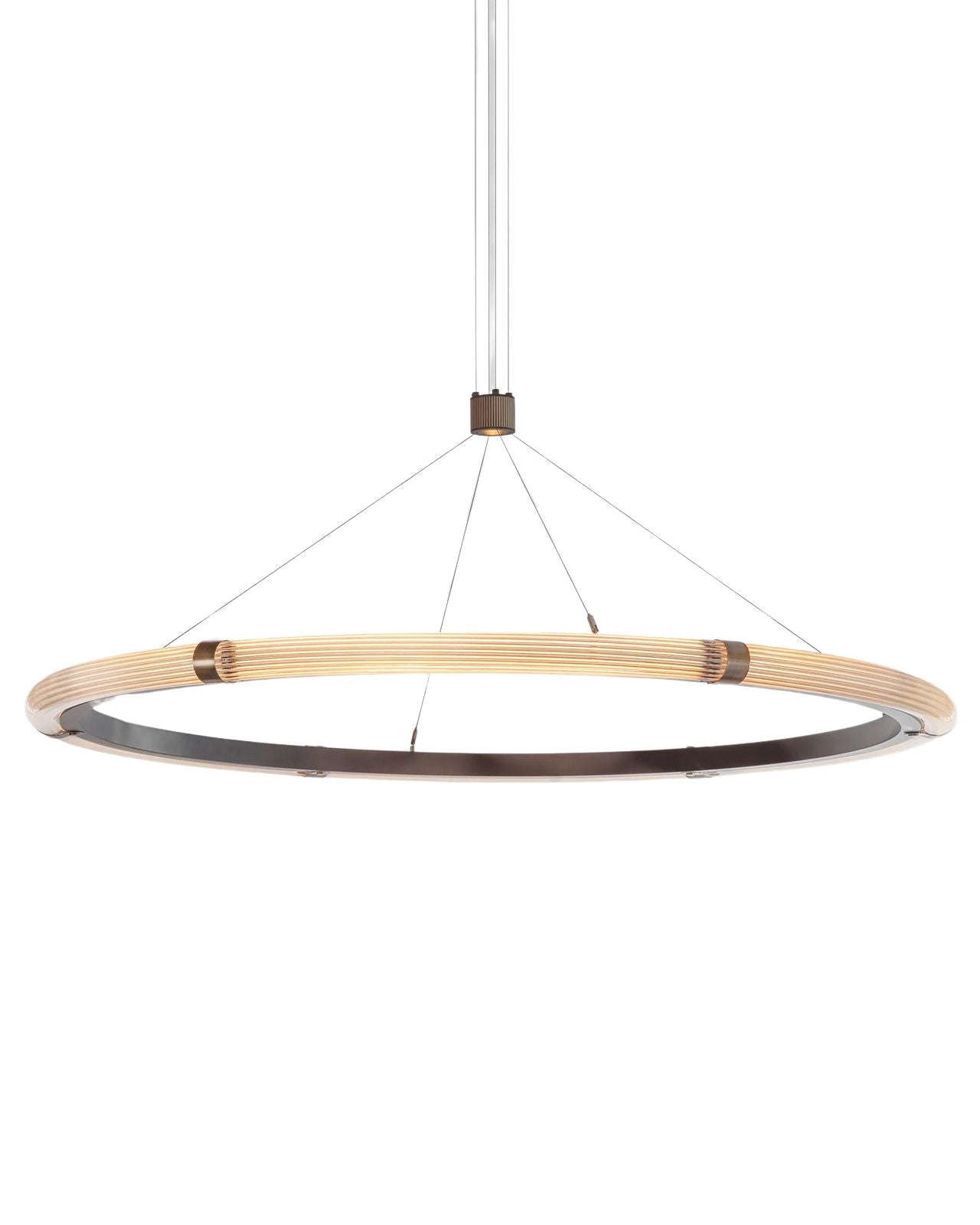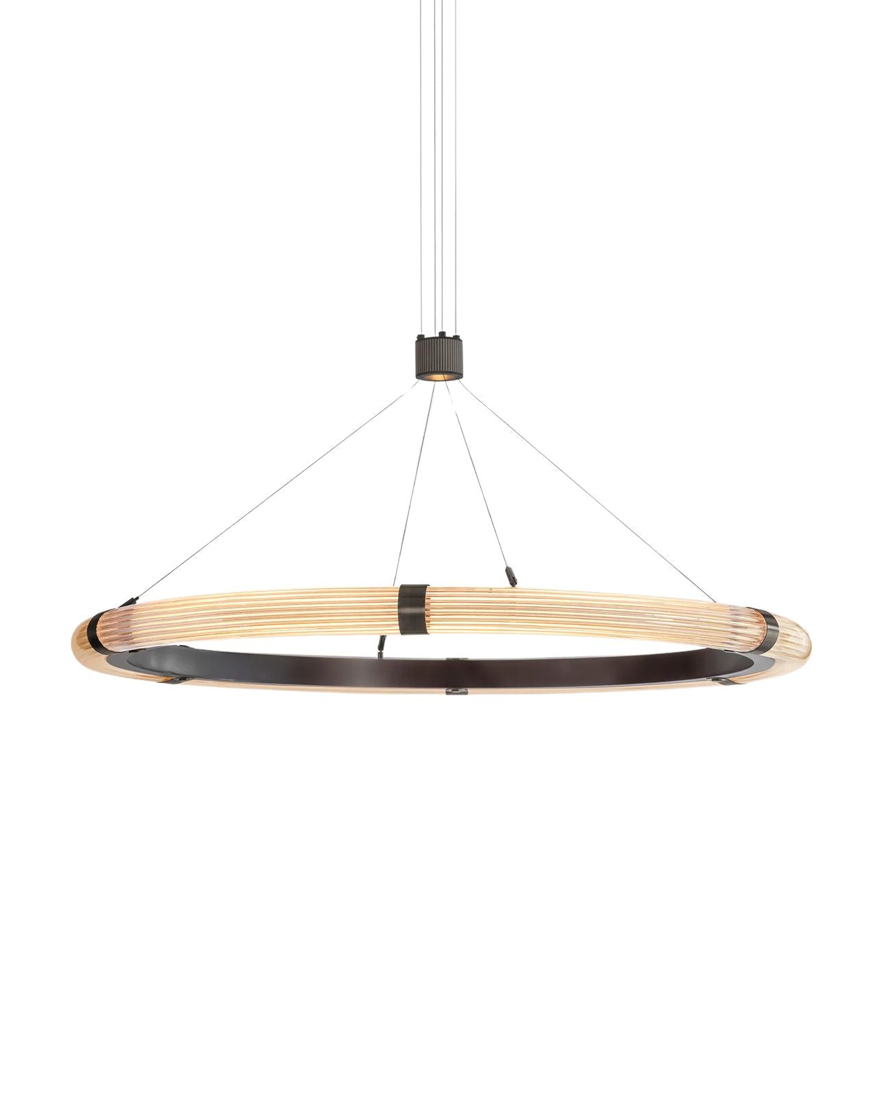 Each curved, reeded glass tube is meticulously attached to a precision-engineered inner aluminium ring, powder-coated in a warm charcoal finish to enhance the depth and warmth of the light. A discreet integrated spotlight provides additional downward illumination, offering both atmosphere and function.