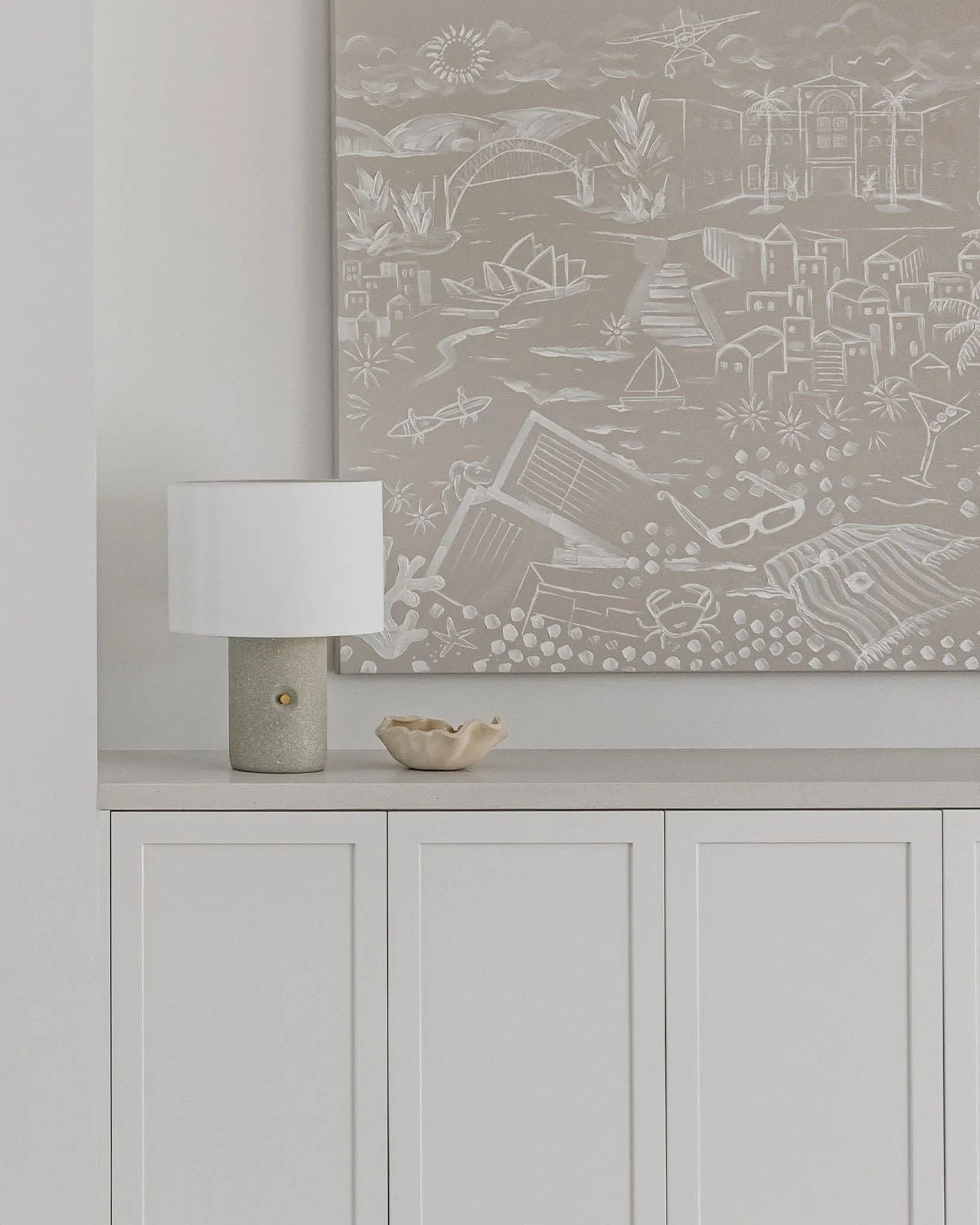The Sand Terrazzo Table Lamp features a clean, minimalist design. The base is crafted from textured terrazzo in a soft neutral tone and a cylindrical form accented with a subtle brass-finished knob, adding a refined detail without disrupting the lamp’s simplicity. Topped with a smooth, white fabric drum shade, the lamp diffuses a warm, ambient glow, making it a versatile piece for living rooms, bedrooms, or workspaces. Combining sculptural charm with practical function, this lamp is ideal for minimalist, Japandi or Scandinavian interiors.