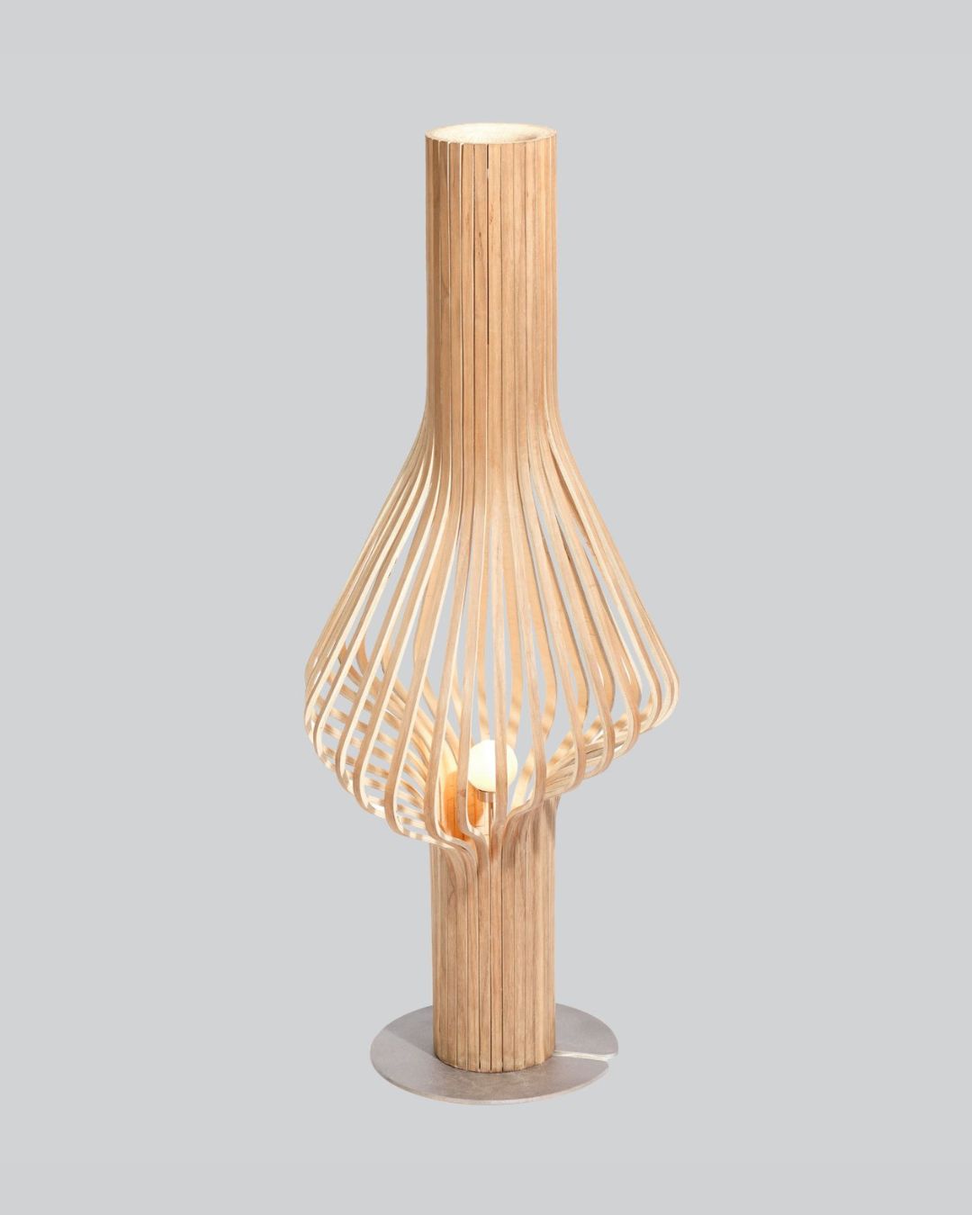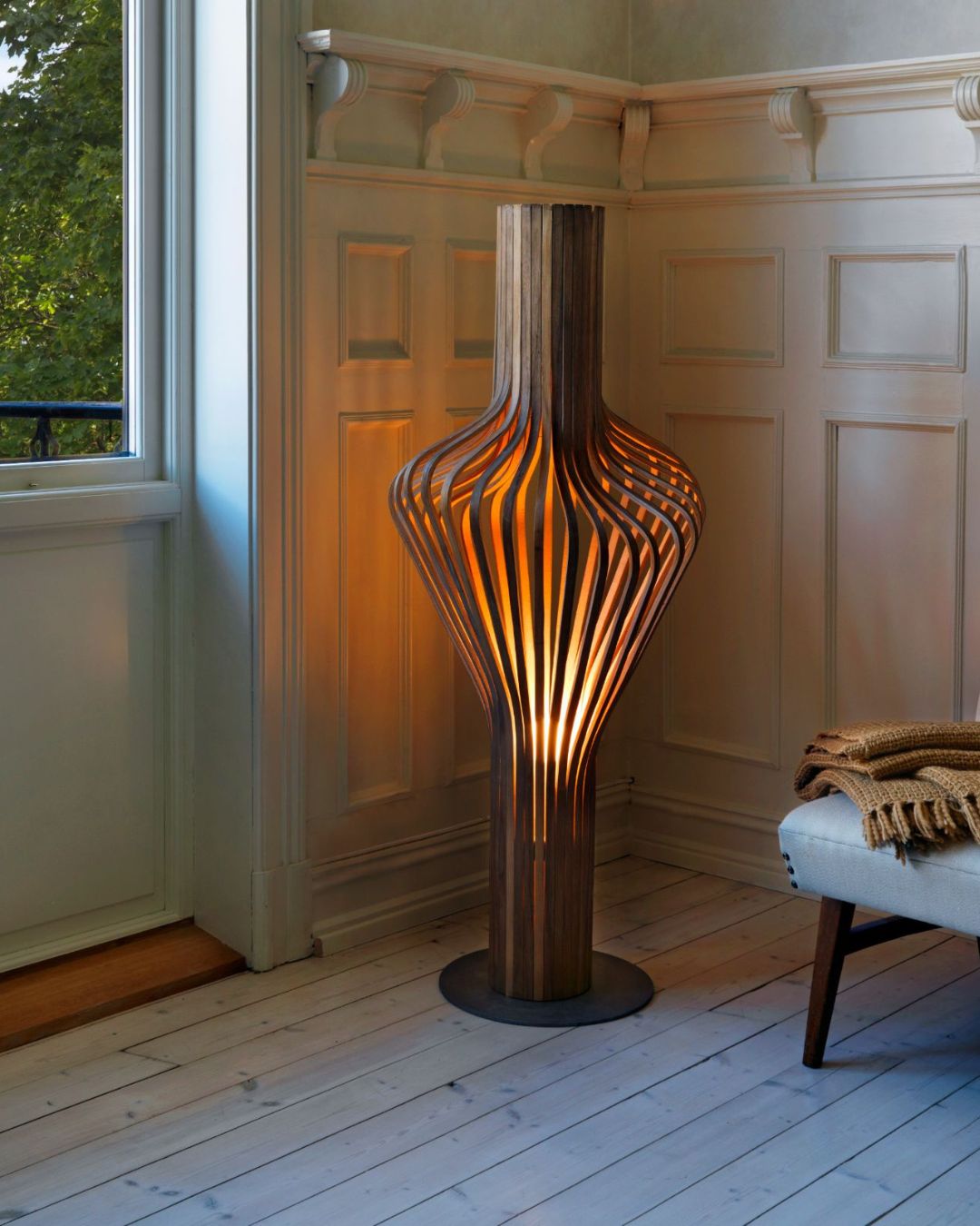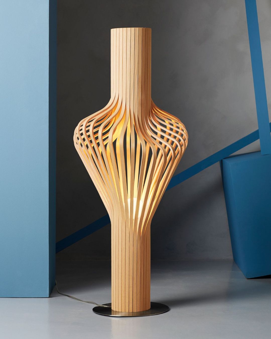 Scandinavian Wood Floor Lamp with intricate design against a gray background