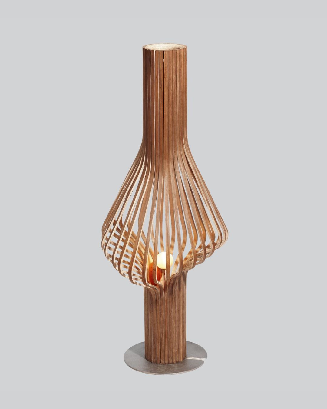 Designed and handcrafted in Norway, its bent shade is composed of 32 individual wood strips, shaped using the traditional techniques of Norwegian laminated wood craftsmanship. Oak and walnut are carefully chosen for their strength and flexibility, allowing the shade to form elegant, sculptural curves.