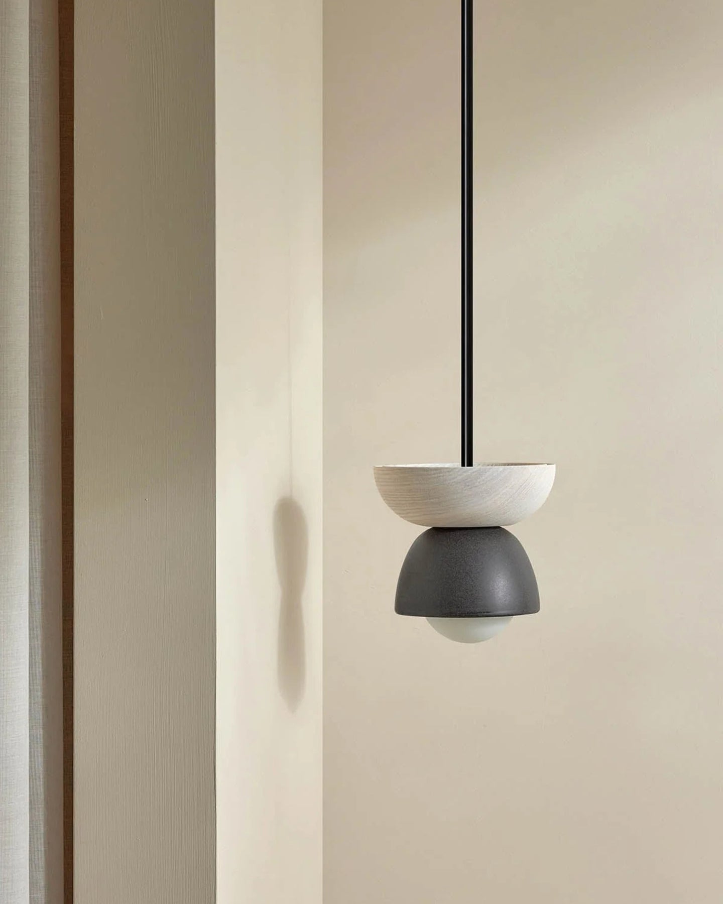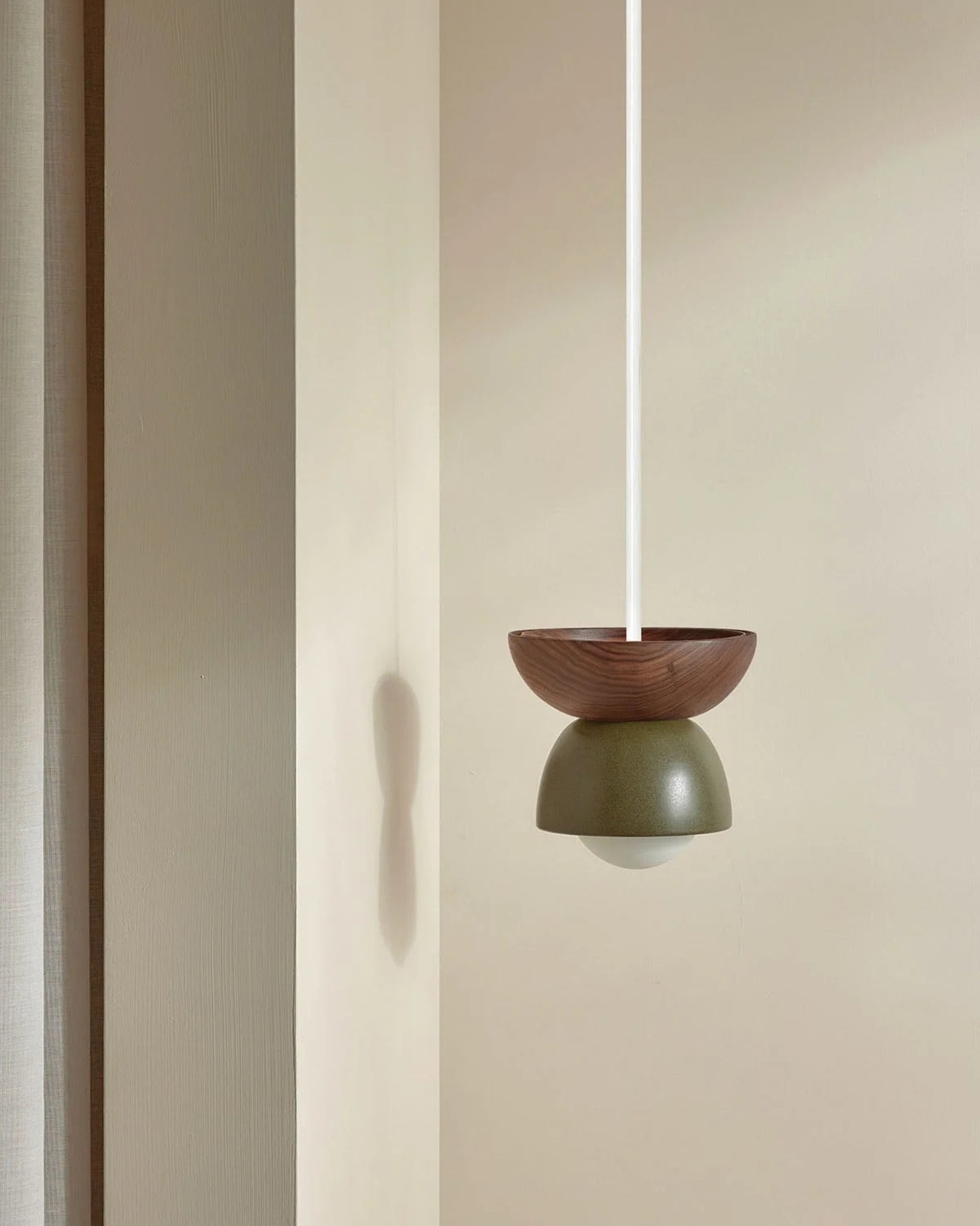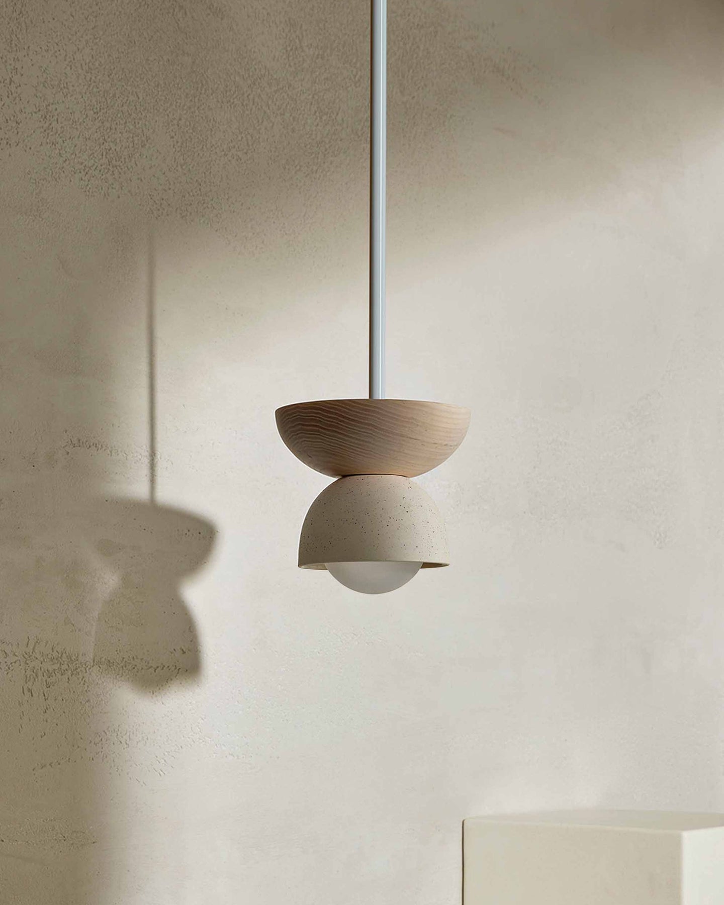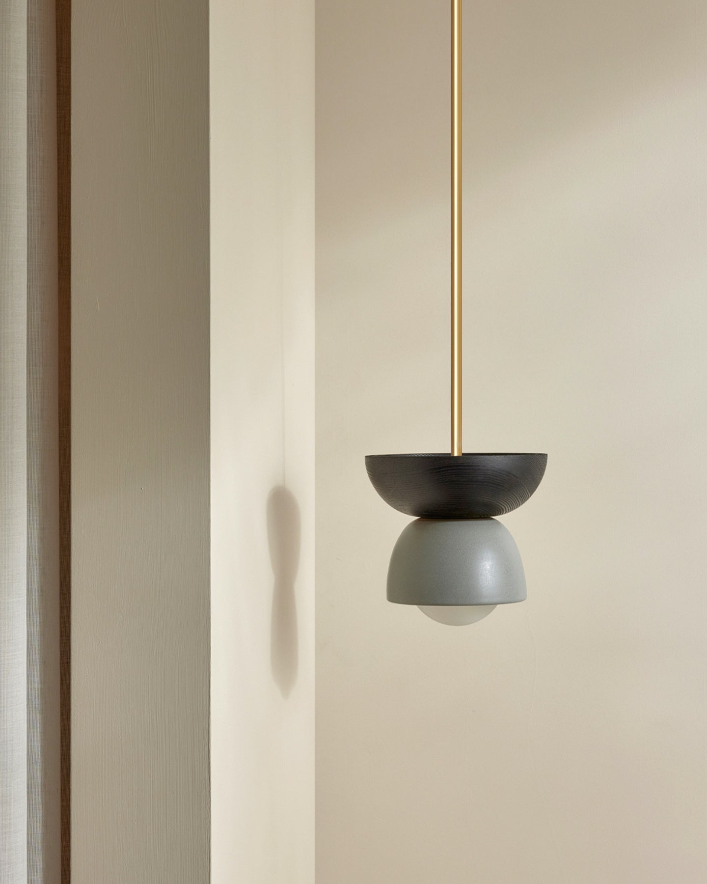 Contrasting domes crafted from hand-turned timber and slip-cast ceramic have been used to create this modern pendant which seamlessly pairs two natural forms. This Australian-designed pendant features a 700mm metal rod suspension and diffused light source allowing for ambient illumination.
