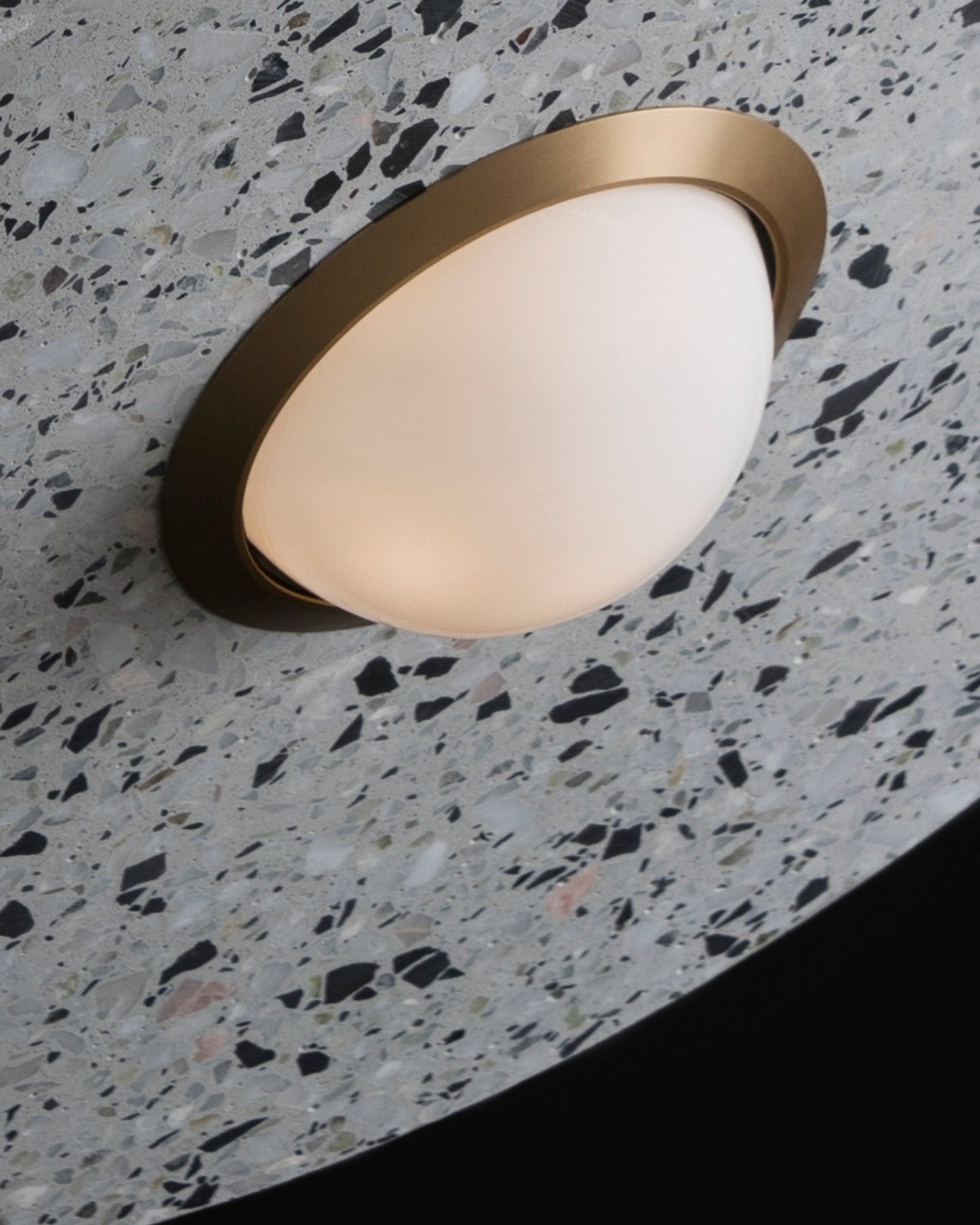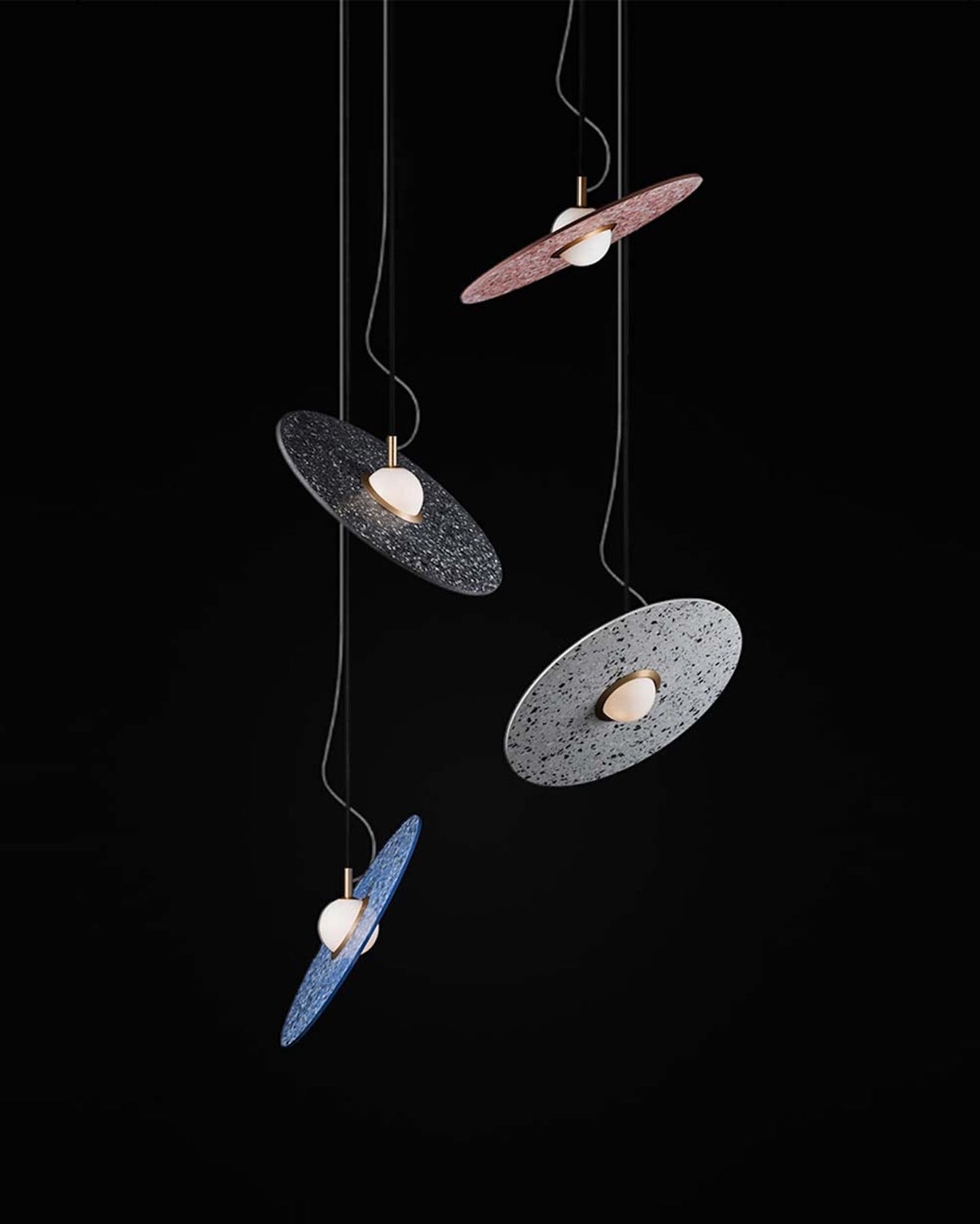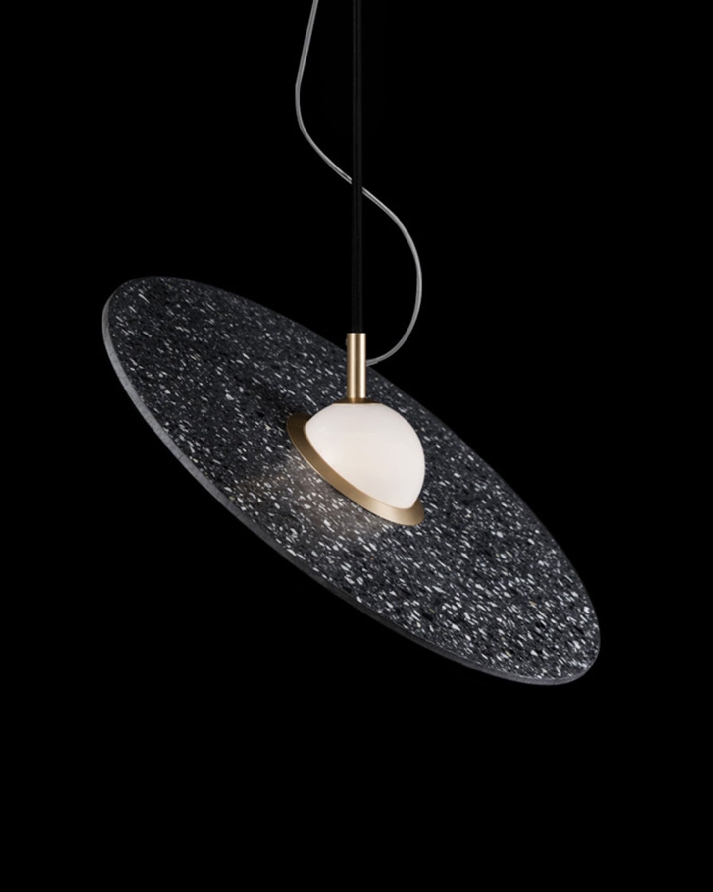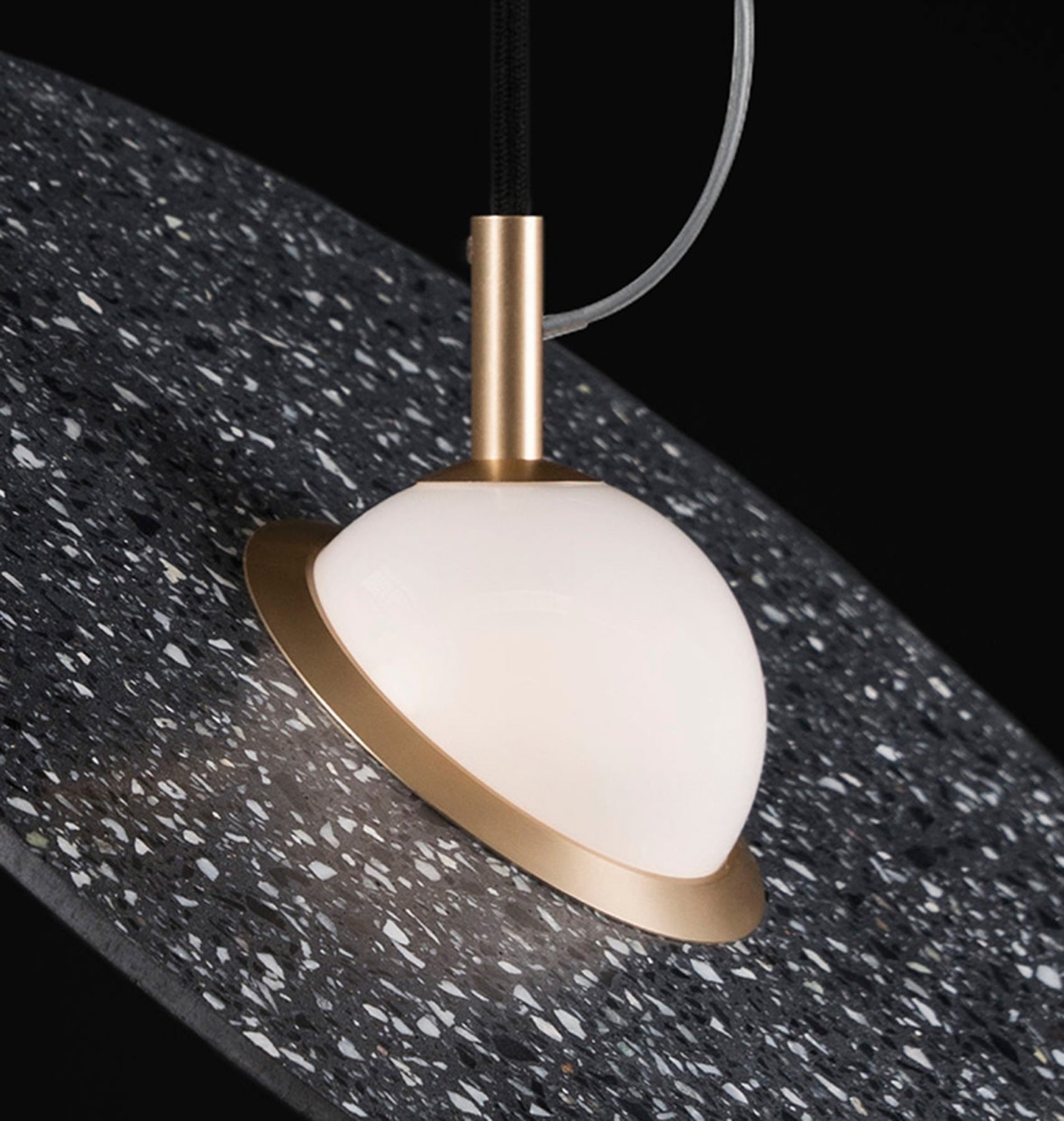 A sculptural design finely crafted from Terrazzo.  Reminiscent of Saturn and its rings this pendant is made up of a mix of concrete and recycled stone. Finished in either White, Black or Red. Its terrazzo disc surrounds a glowing opal centre piece housing a warm white LED. Providing soft diffused light this design is suited to be installed singularly or as a cluster to create a breathtaking focal point within commercial or residential interiors. Inherent to its terrazzo material each pendant will showcase subtle unique variances of aggregate distribution.