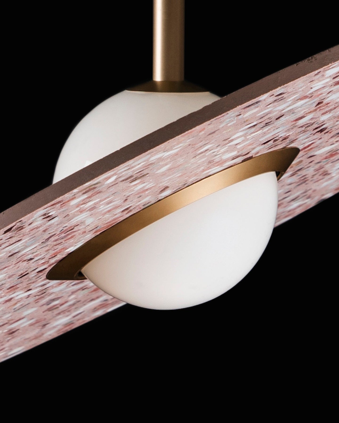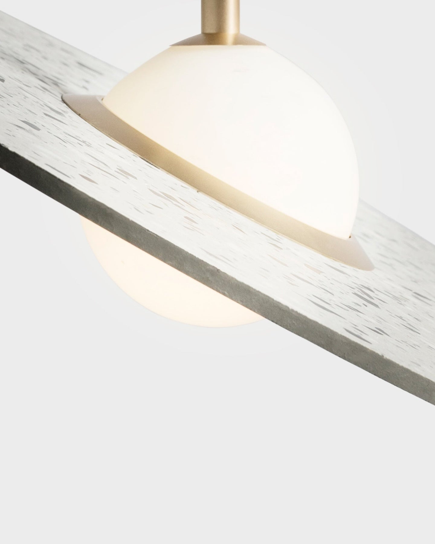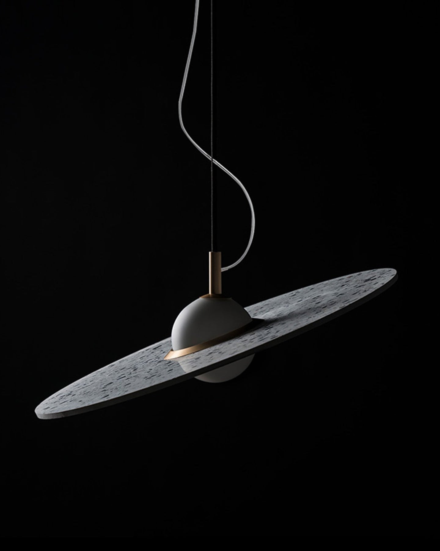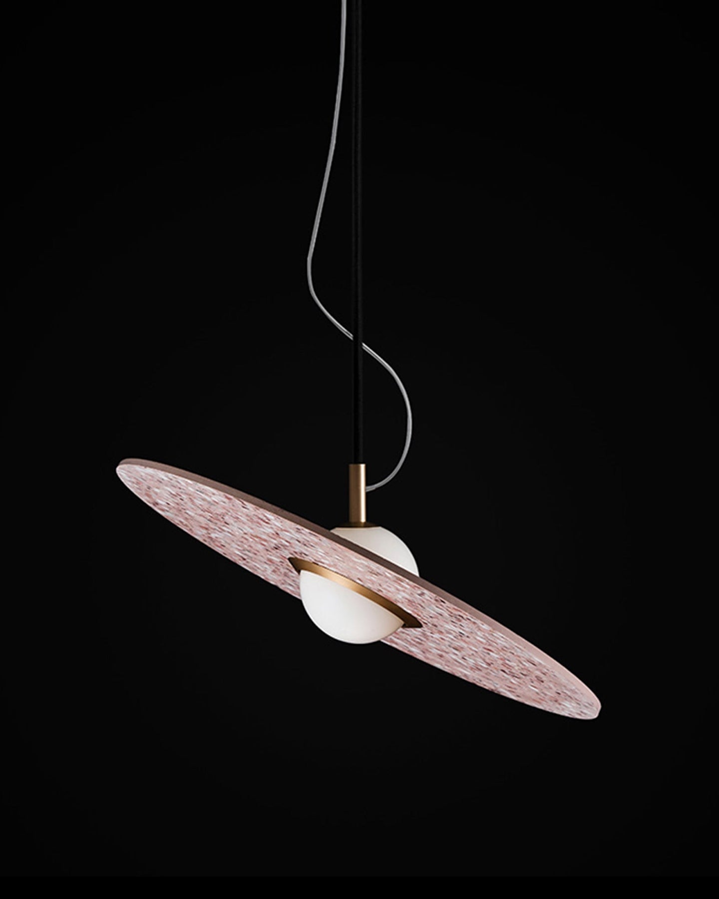 A sculptural design finely crafted from Terrazzo.  Reminiscent of Saturn and its rings this pendant is made up of a mix of concrete and recycled stone. Finished in either White, Black or Red. Its terrazzo disc surrounds a glowing opal centre piece housing a warm white LED. Providing soft diffused light this design is suited to be installed singularly or as a cluster to create a breathtaking focal point within commercial or residential interiors. Inherent to its terrazzo material each pendant will showcase subtle unique variances of aggregate distribution.