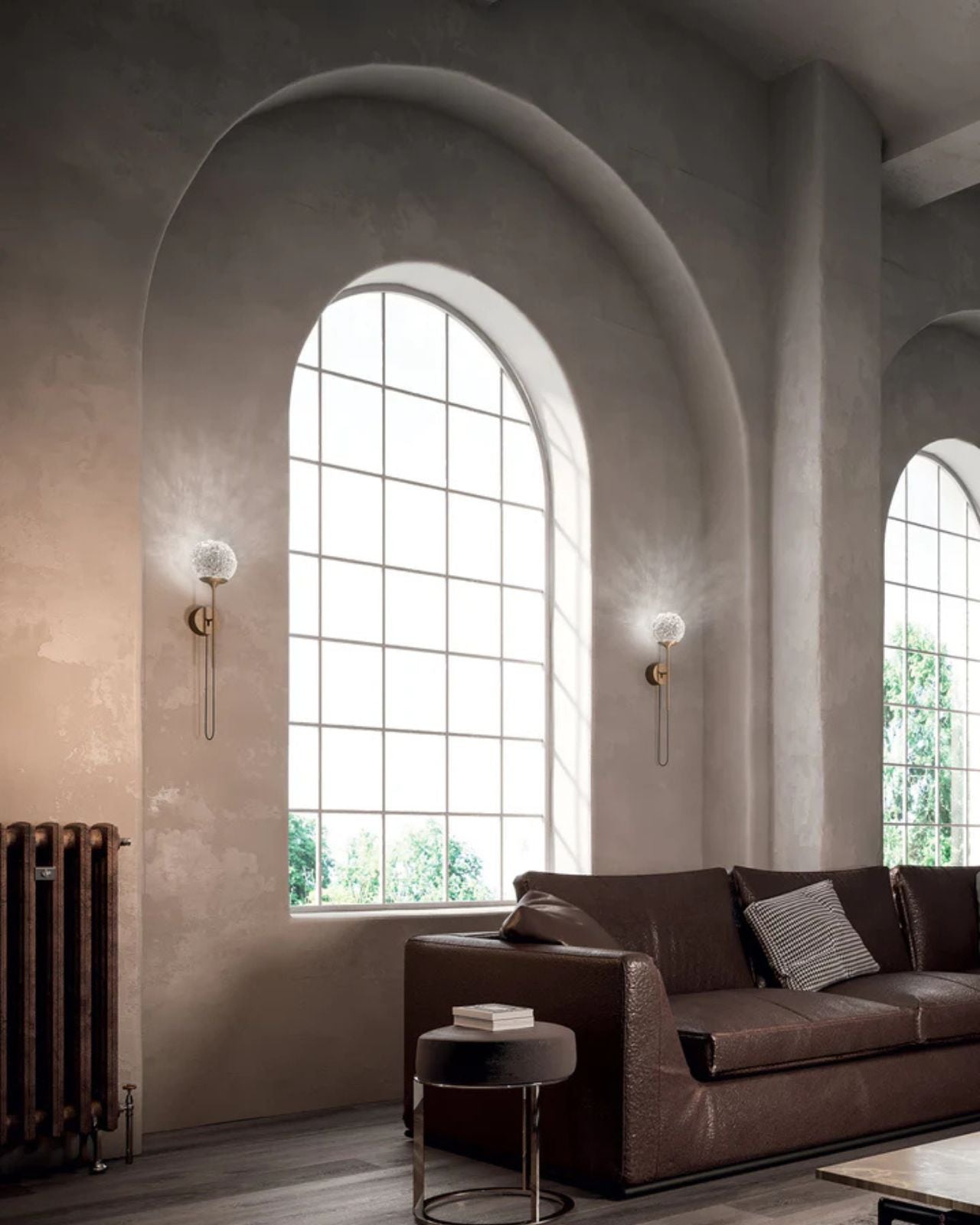 Defined by its textured mouth-blown glass diffuser this stunning fixture creates delicate patterns upon any interior wall. Featured with a built-in LED and adjustable angle this design is suited for living and bedroom spaces. This Italian wall light is available in crystal or pink glass with an option of a brass or white frame.