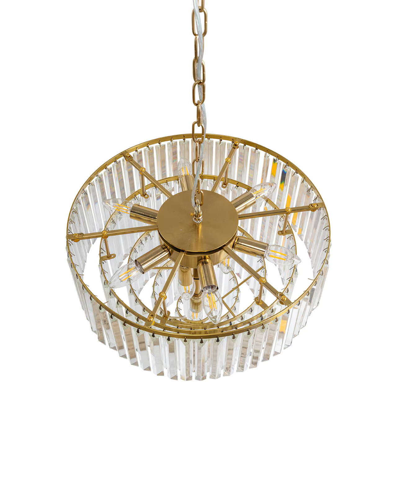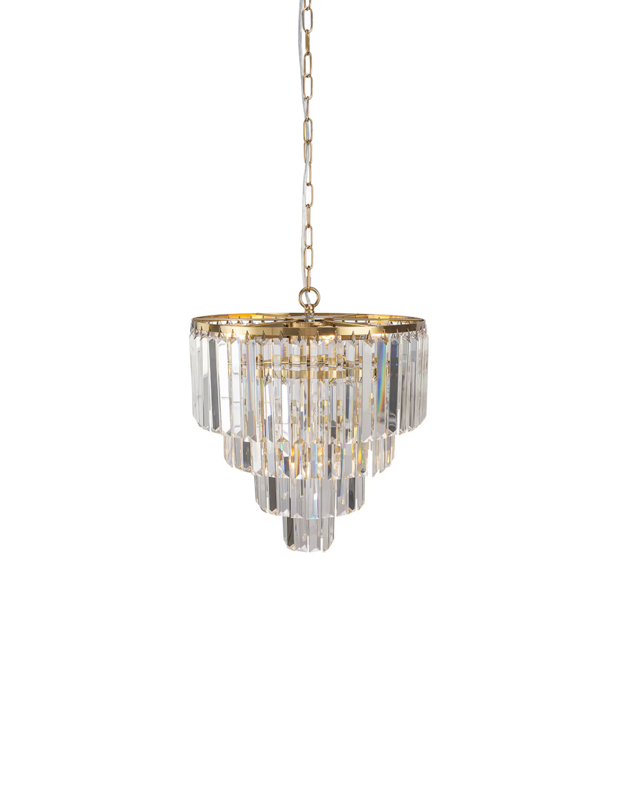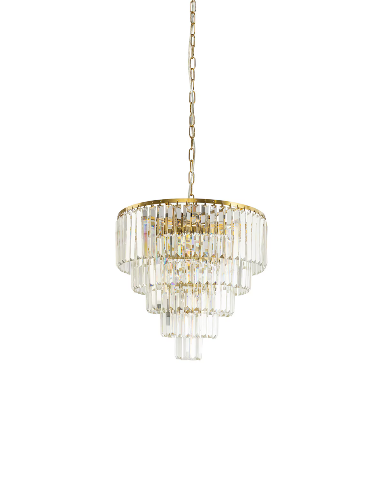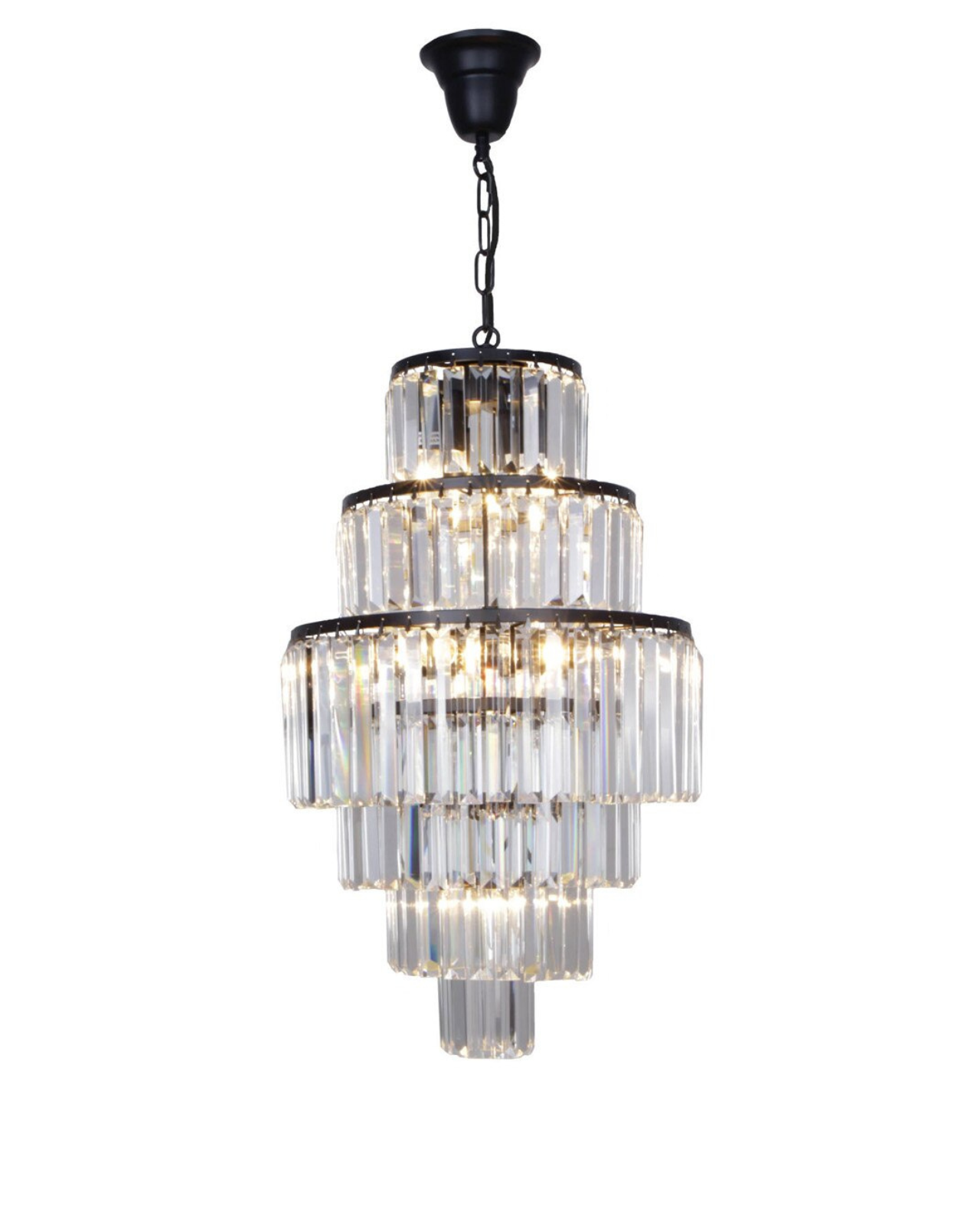 An elegant pendant light consisting of multiple tiers of crystal rods held together by chrome or matte black rings and a chain link suspension. Pair with clear bulbs to achieve light refraction and create beautiful shapes against walls. Style in a traditional inspired living or dining room.