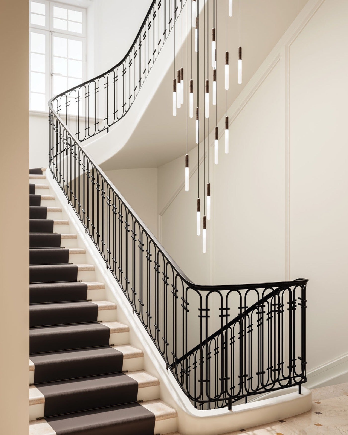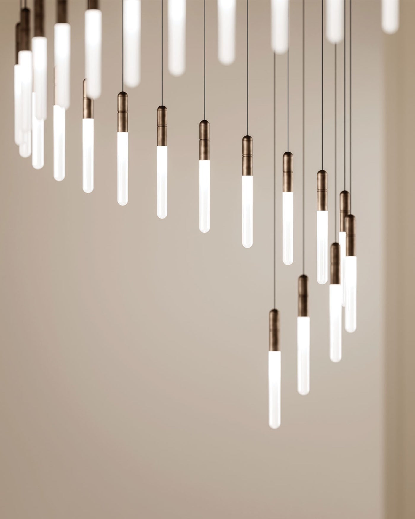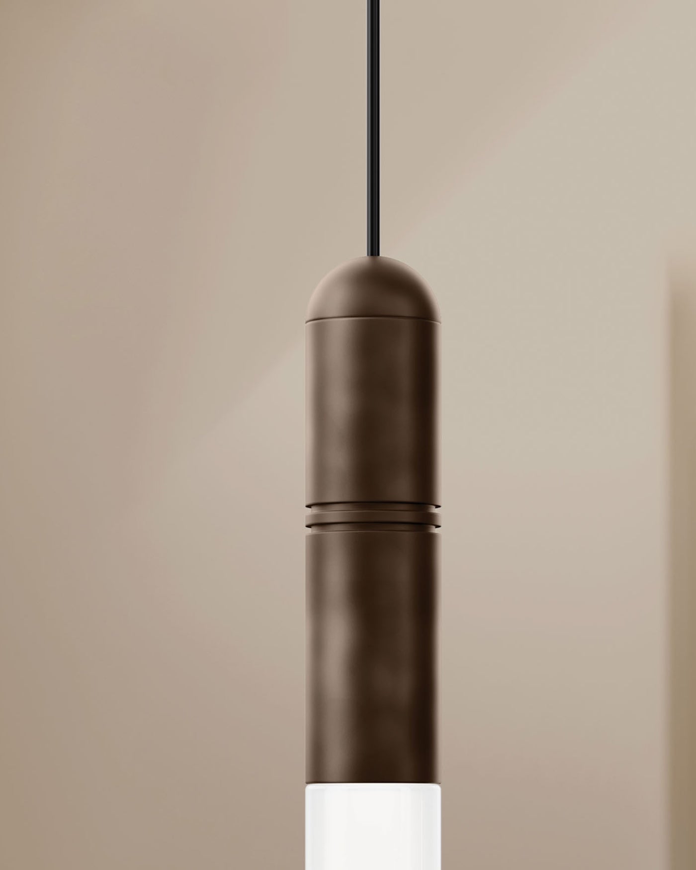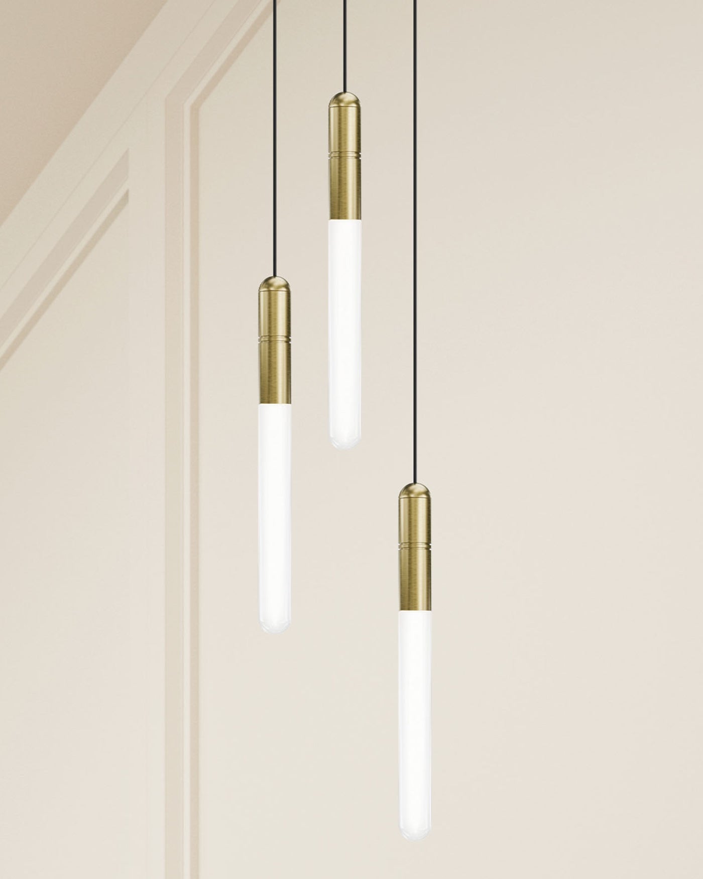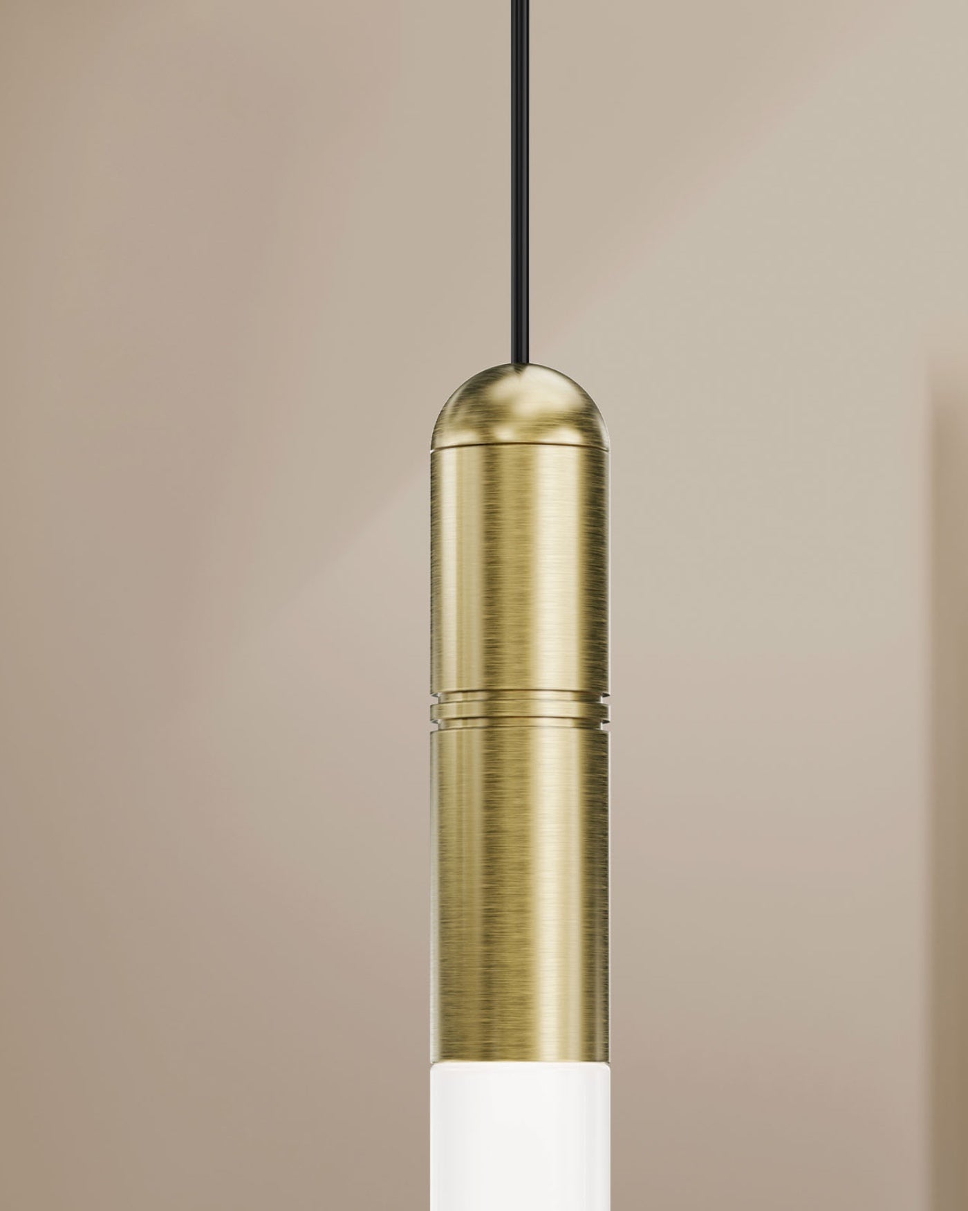 Designed and crafted in Italy, the Tubular Glass and Brass Pendant is an elongated tube-shaped fitting with a frosted glass shade and brass detailing. This fixture is ideal for installing in clusters to create unique focal pieces, or can be installed individually for a touch of elegance. The brass details are engraved with two circular rings, and are available in a Morocco or Natural Brass finish.