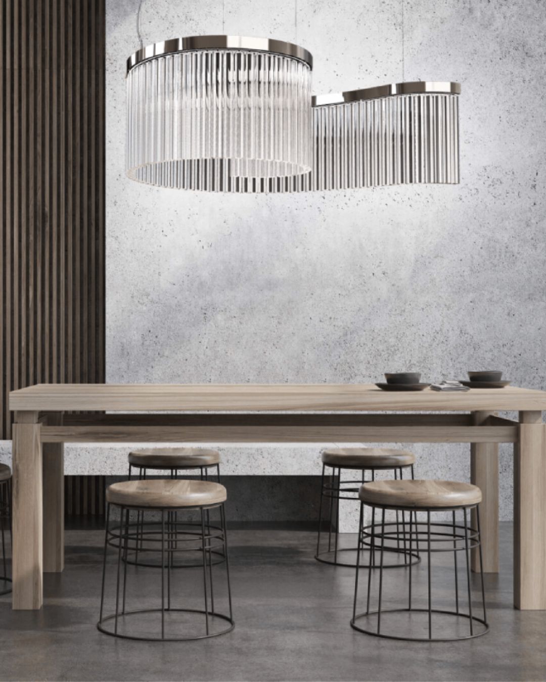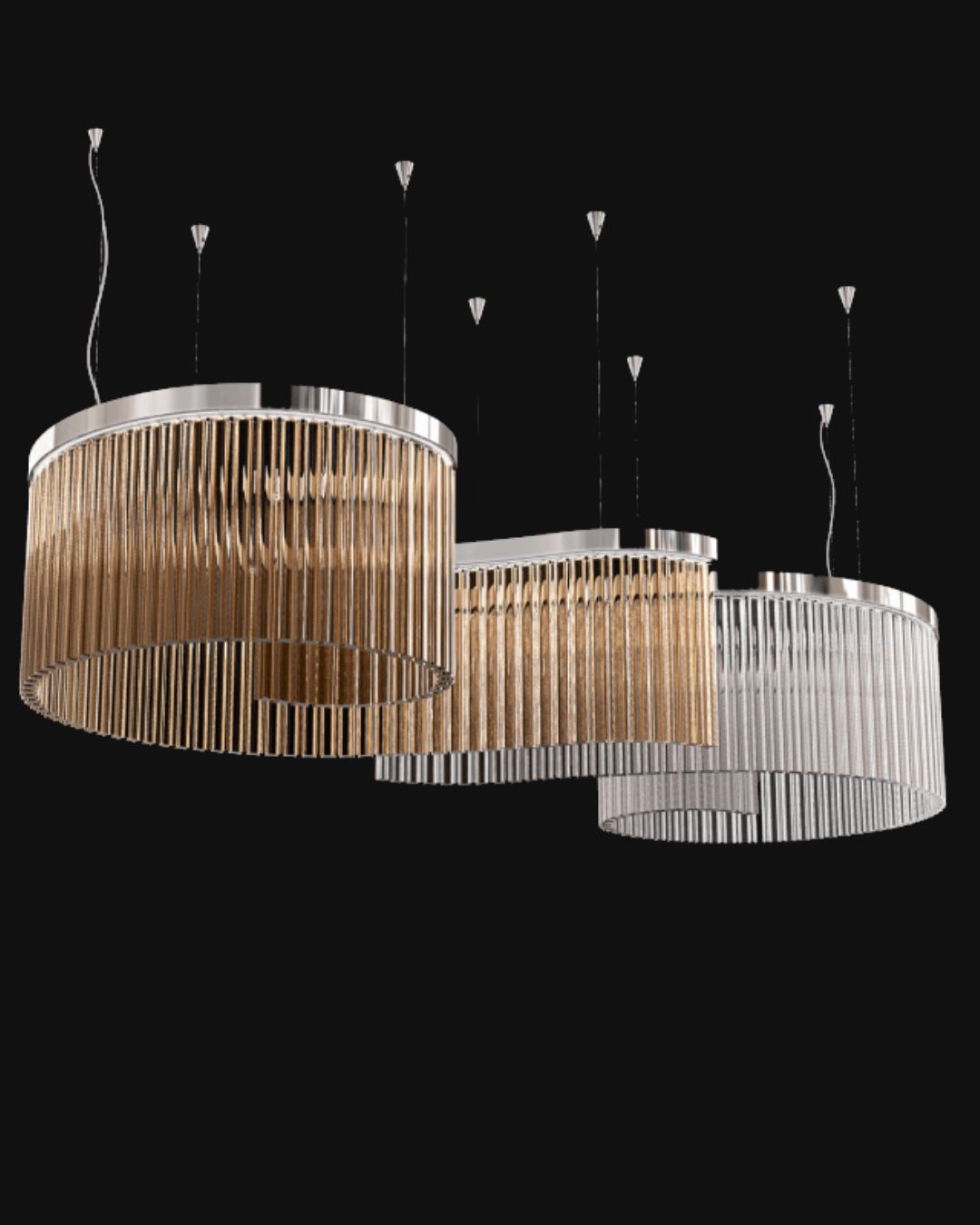 While the wavy structure of this pendant is crafted from metal with a subtle chrome finish, the enclosed rows of quadrihedrons are made from Murano glass and are available in transparent, amber or teak colour. Reminiscent of waterfalls, this contemporary version of a classic chandelier will bring class and sophistication to modern or more classic interiors. Versatile, it will look great on its own or as a combination of two, in a dining room, living room or hallway. Perfectly combining luxury and elegance, this pendant is equipped with an integrated LED module for a low energy consumption.