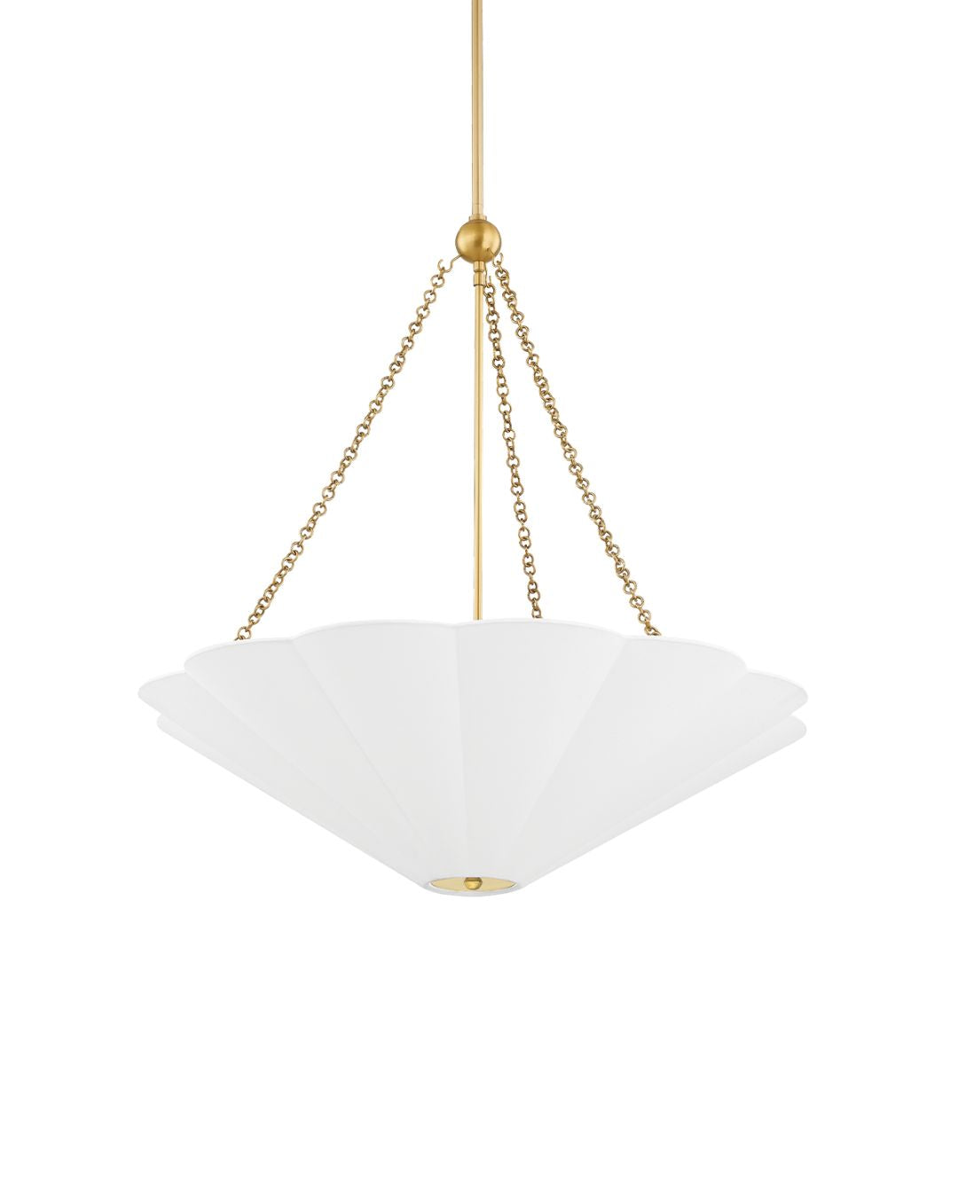 The White Pleated Pendant Light is a delicate fitting with a white shade and a scalloped edge. This pendant is complemented by an antique brass 3 chain suspension that creates a harmonious balance between materials. Thoughtfully crafted with premium materials, this fitting delivers a timeless decorative statement that is ideal for transitional or hamptons style interiors. Pair with filament globes to add warmth to the white shade.